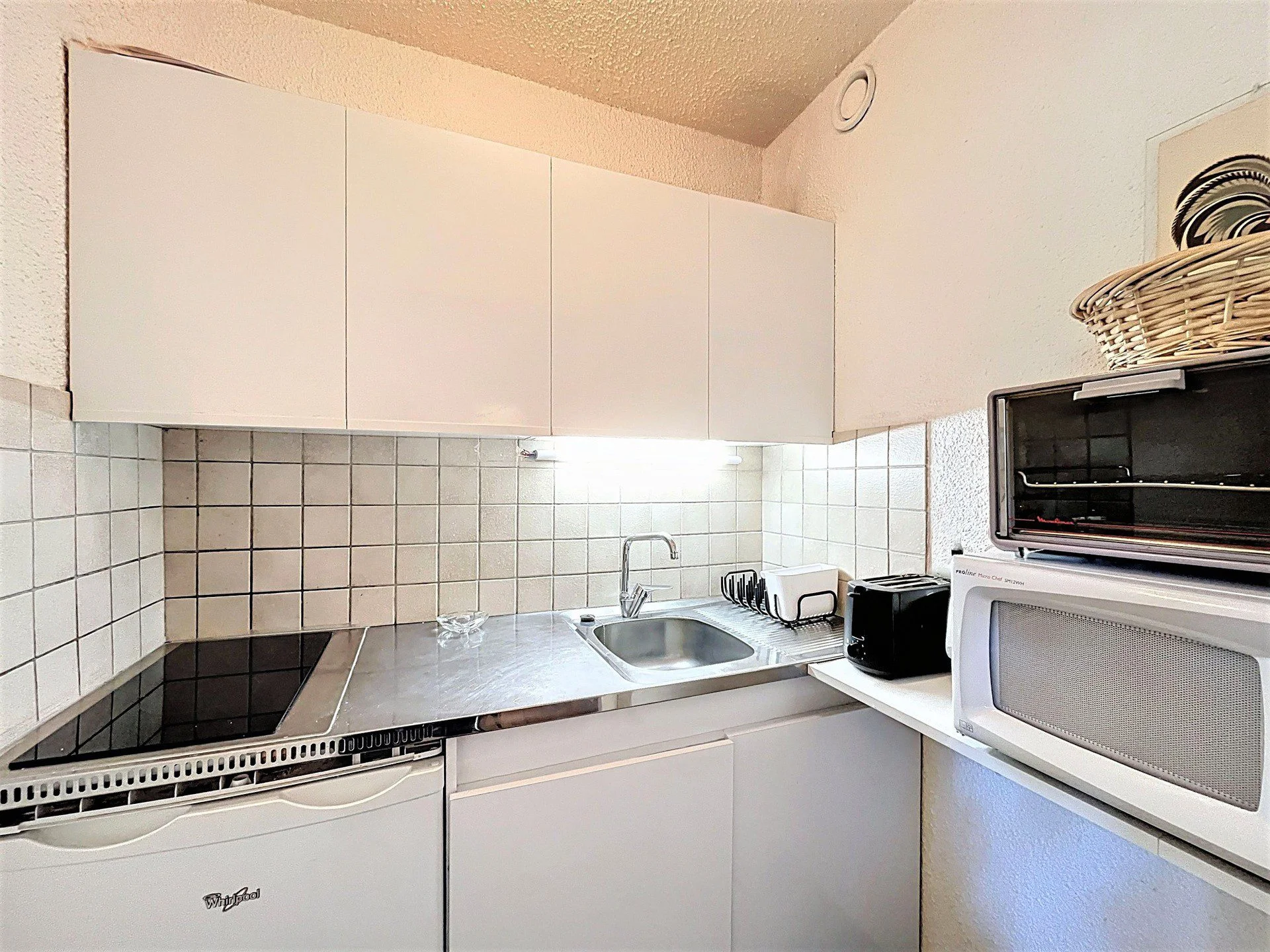 De keuken is volledig uitgerust met een vitroceramic kookplaat (2 pitten), magnetron, mini-oven, broodrooster, waterkoker, koffiezetapparaat, sinaasappelpers en koelkast. Voor de voorbereiding van maaltijden zijn er snijplanken, messen, pannen, grillplaat en diverse kookgerei aanwezig. De uitrusting omvat voldoende servies, glazen, bestek, saladebestek, openers, schaar en allerlei keukenhulpstukken.