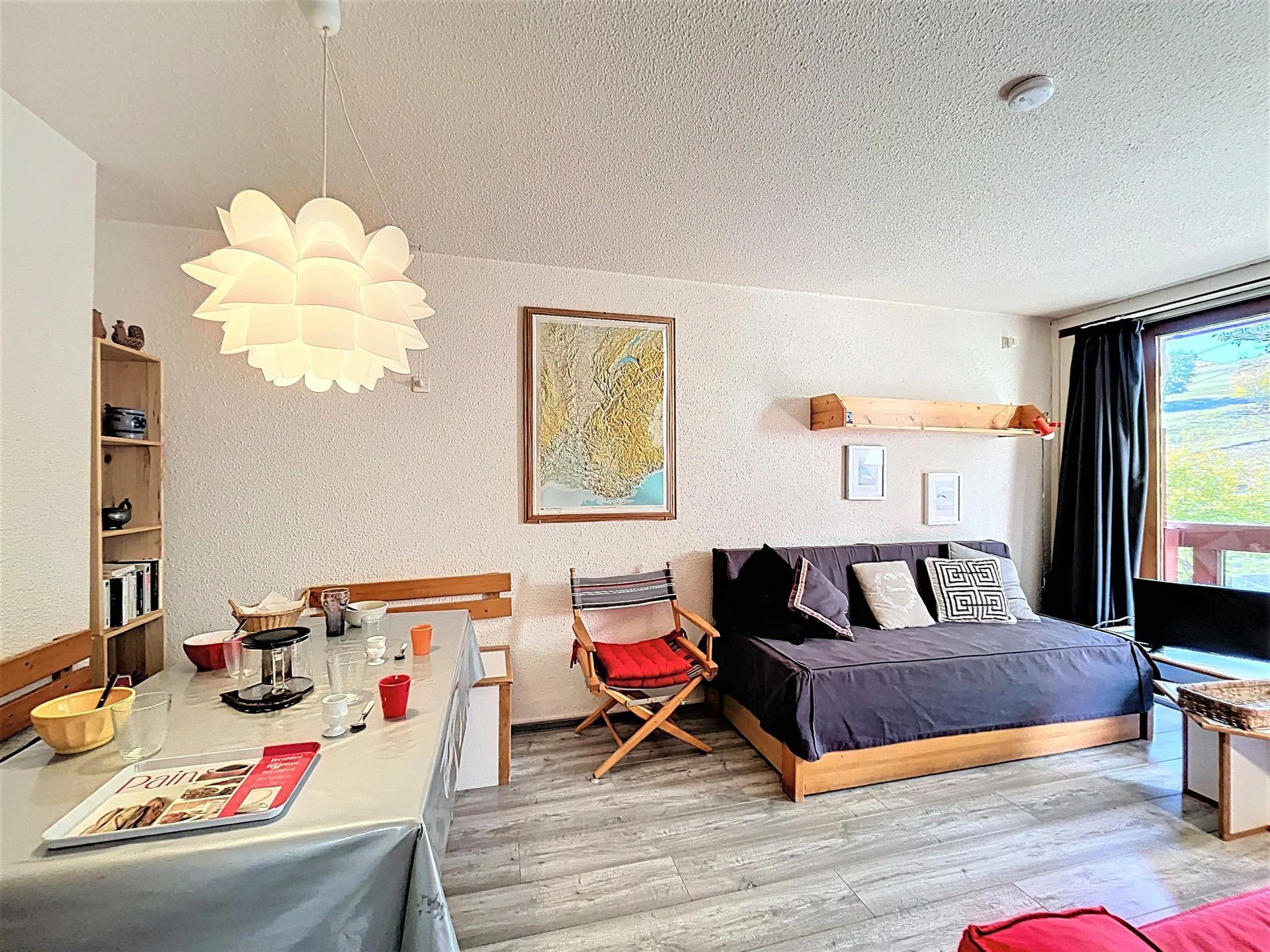 De woonkamer is voorzien van comfortabele zitplaatsen met een fauteuil en banken met kussens. Er is een flatscreen-tv aanwezig. De eethoek biedt plaats aan meerdere personen en heeft tafel en zitgelegenheid. De ruimte beschikt over ramen met uitzicht op de bergen.