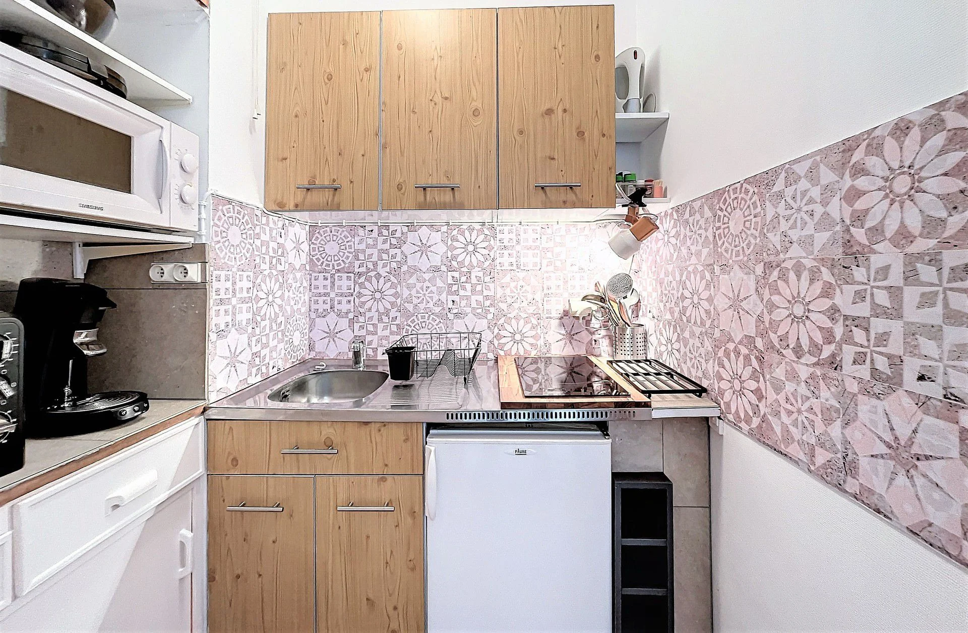 Dit is een studio met alkoof, ingericht als 2-kamerappartement met 1 slaapkamer. Het bestaat uit een woonkamer met eethoek, een aparte slaapkamer en een kitchenette. Het appartement is recent gerenoveerd en geschikt voor gezinnen met kinderen.
