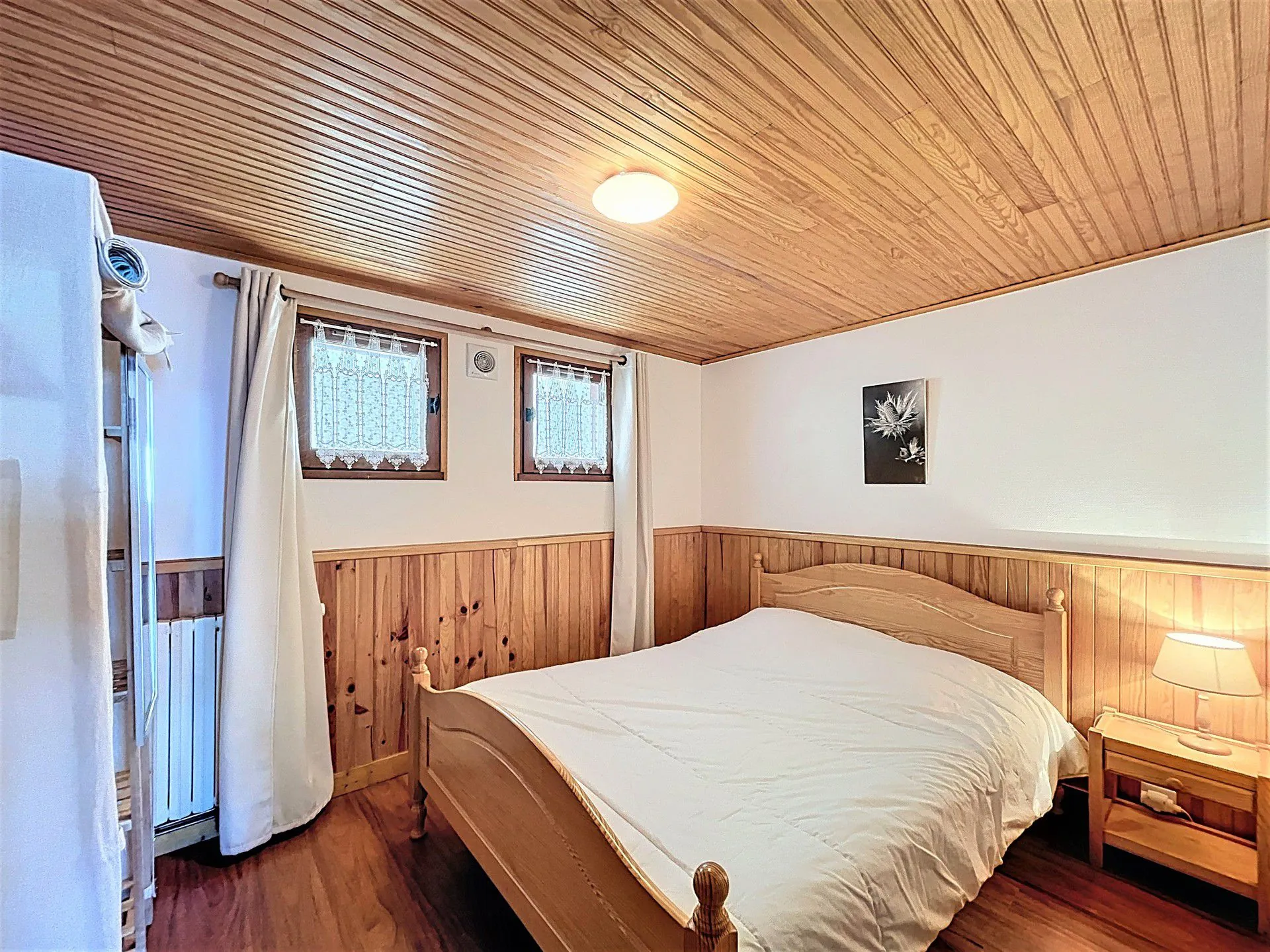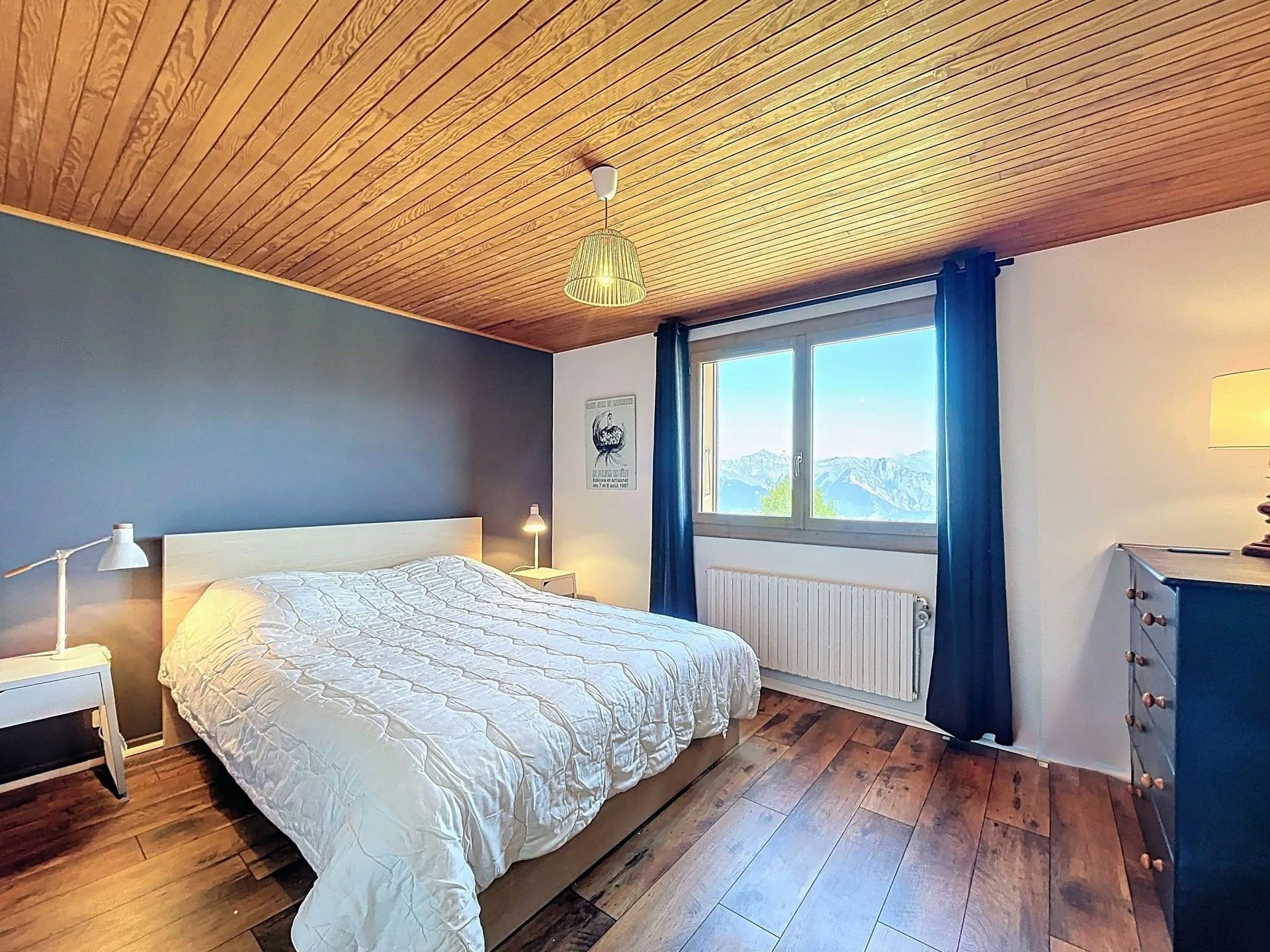 Slaapkamer 1: 1 tweepersoonsbed, knusse inrichting en uitzicht op de opkomende zon en de Aiguilles d’Arves