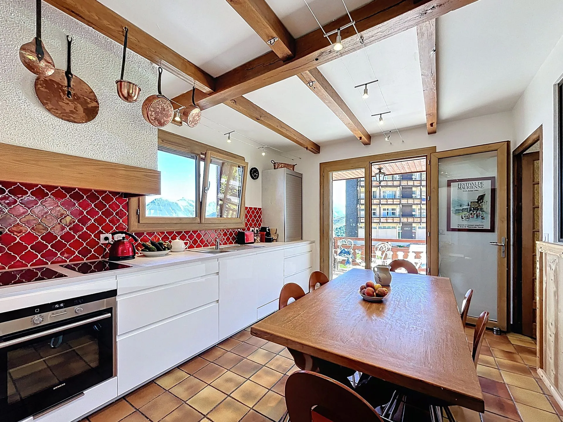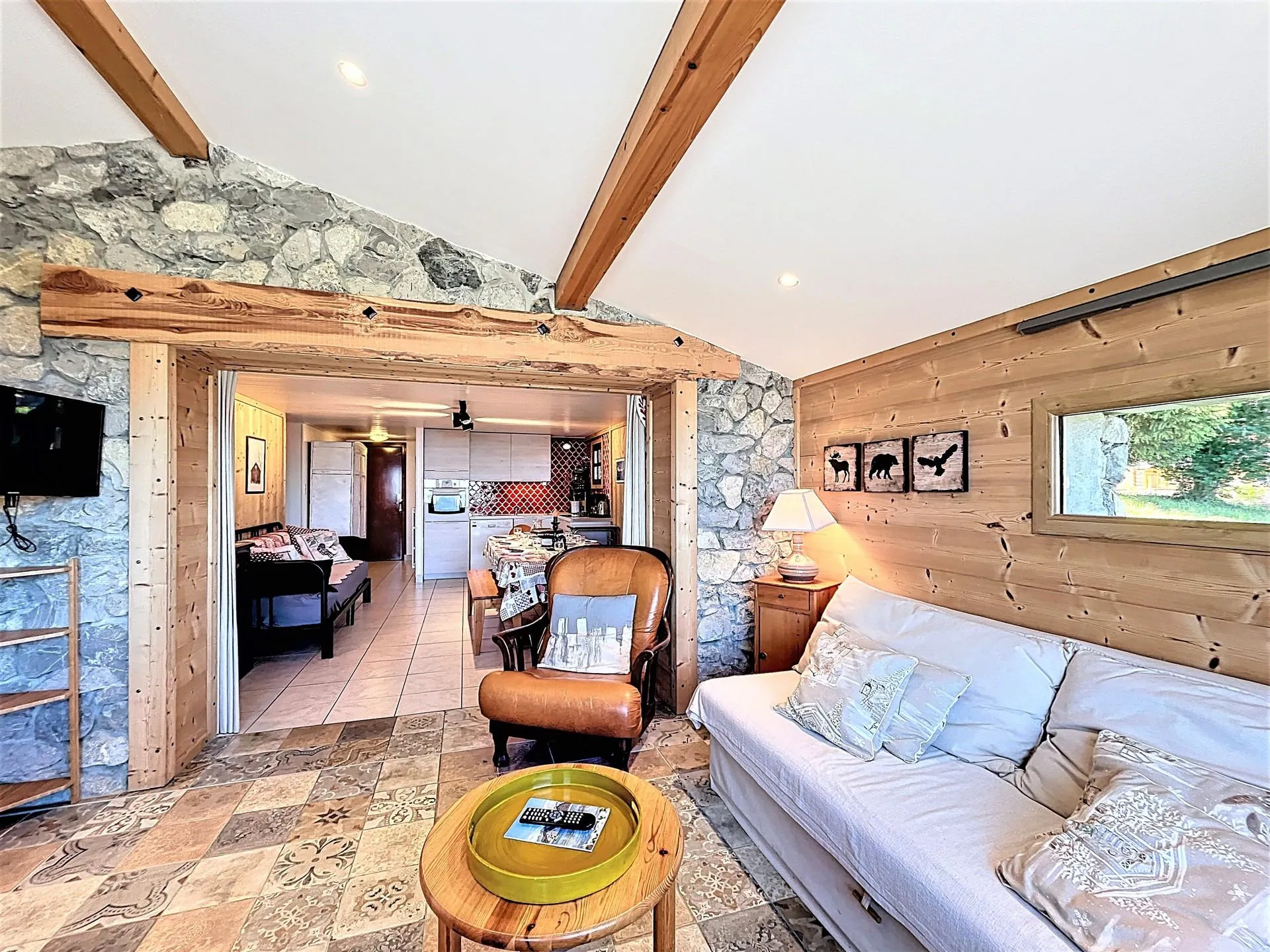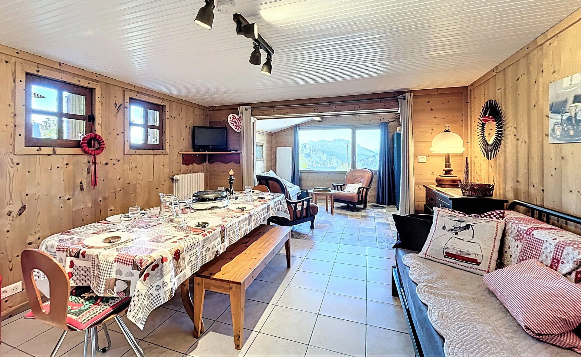 Bij aankomst in Chalet La Maisonnée word je verwelkomd door een ruime entree met grote kasten, ideaal om jassen, skischoenen en andere bagage netjes op te bergen. De woonkamer ademt warmte en gezelligheid, met veel lichtinval, een comfortabele zithoek met tv en een eethoek die uitkomt op een zonnig terras op het zuiden – de perfecte plek om te genieten van het indrukwekkende bergpanorama.