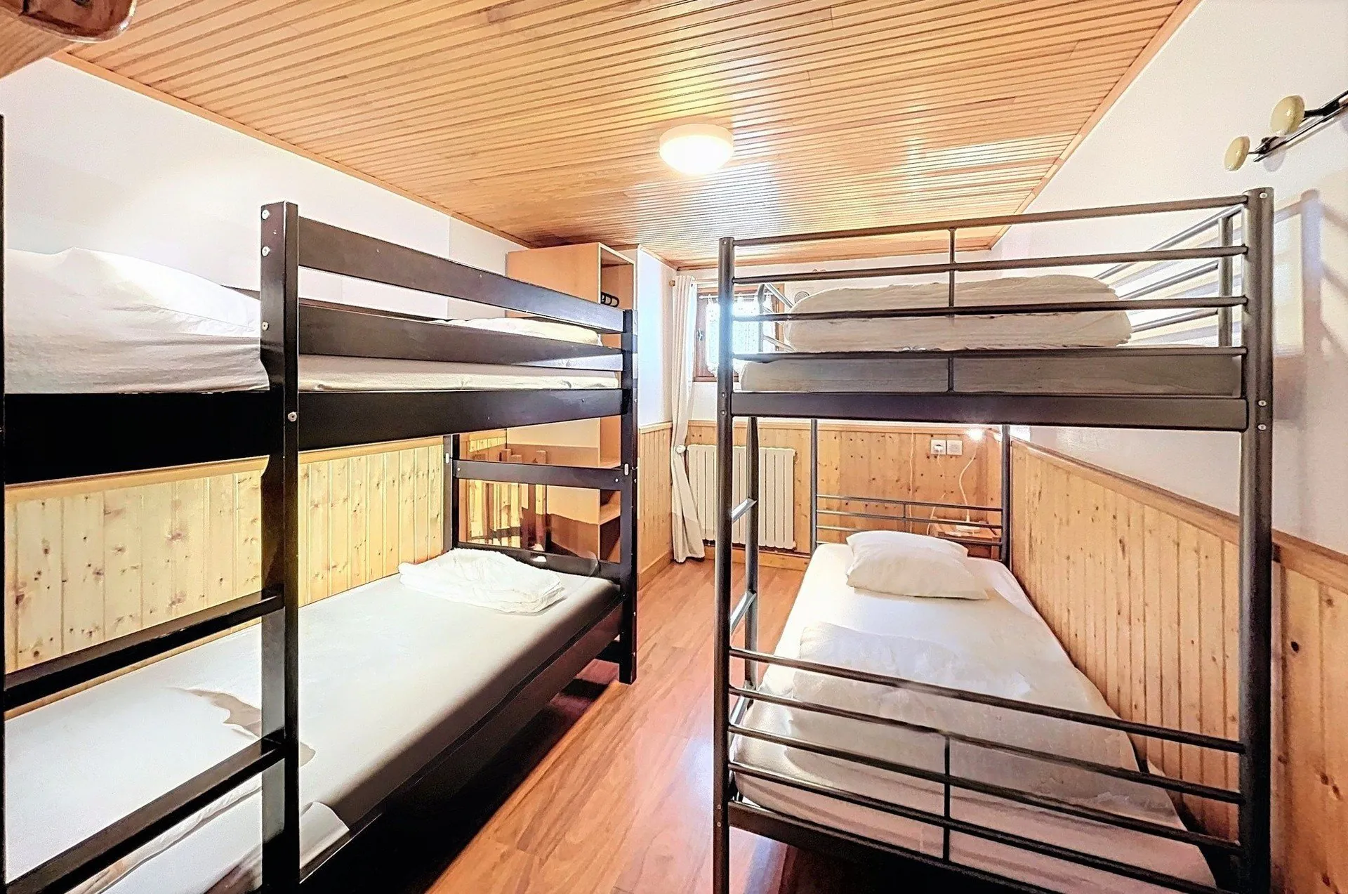 Slaapkamer 5 – “Le repère des Lutins”: een grote kamer onder de schuine kap, ingericht als berghut met 1 tweepersoonsbed + 2 eenpersoonsbedden
