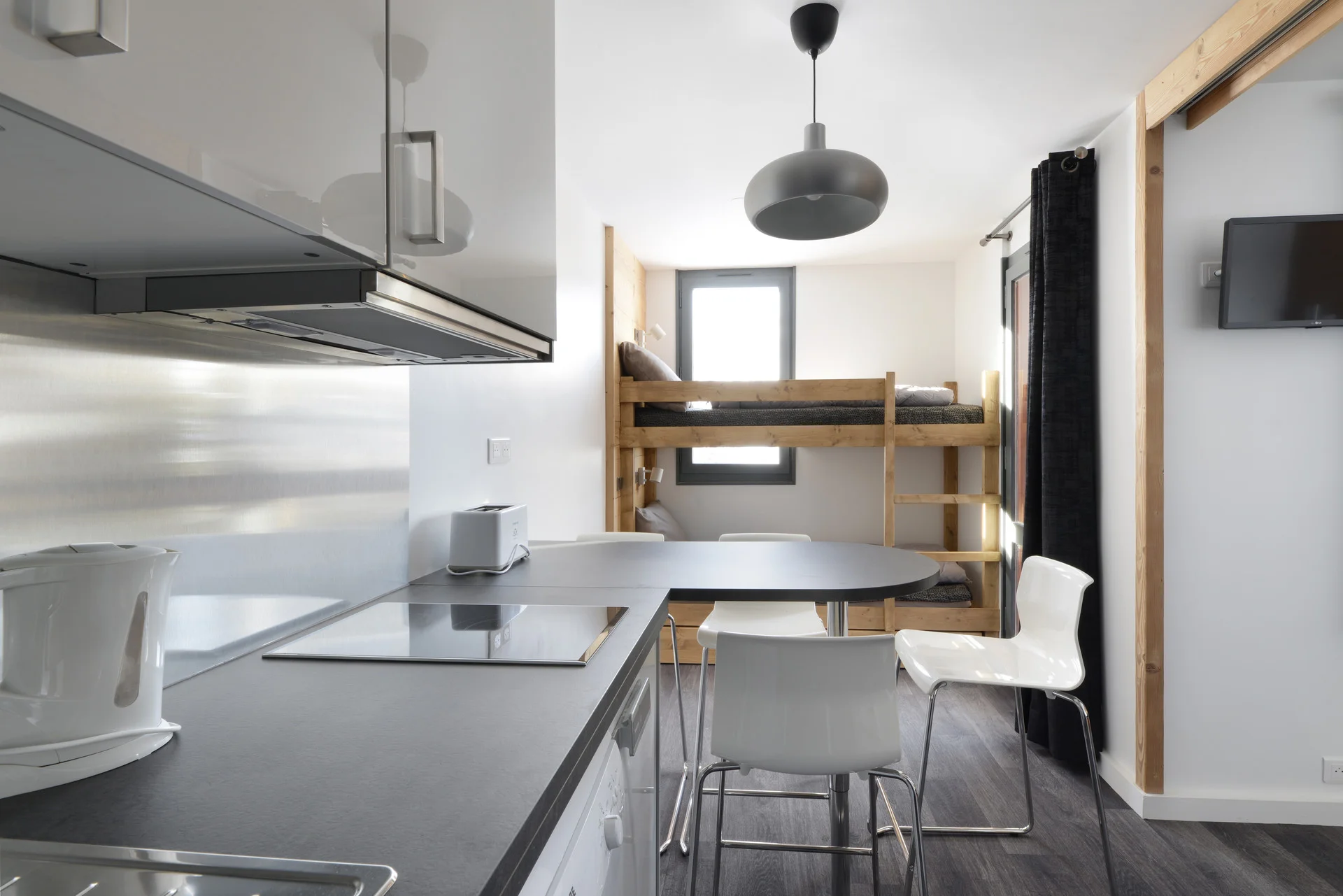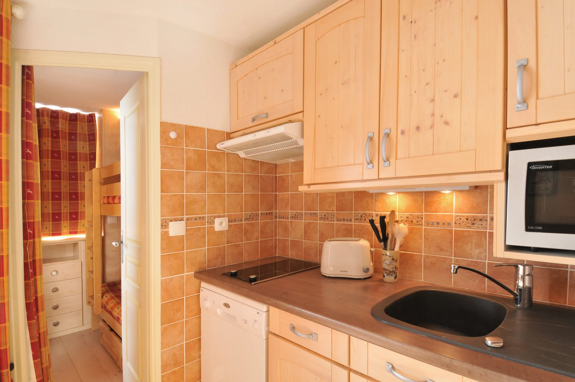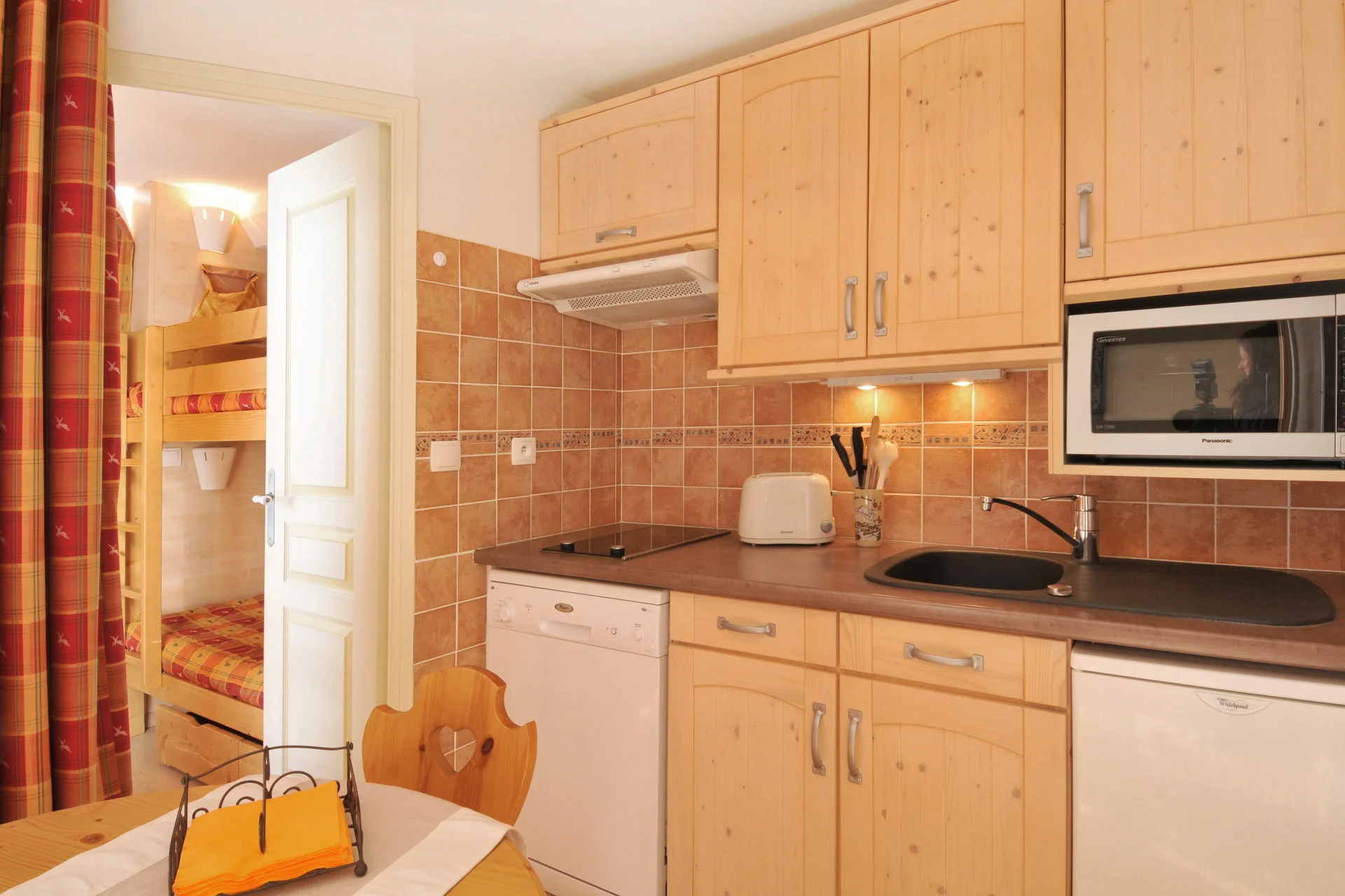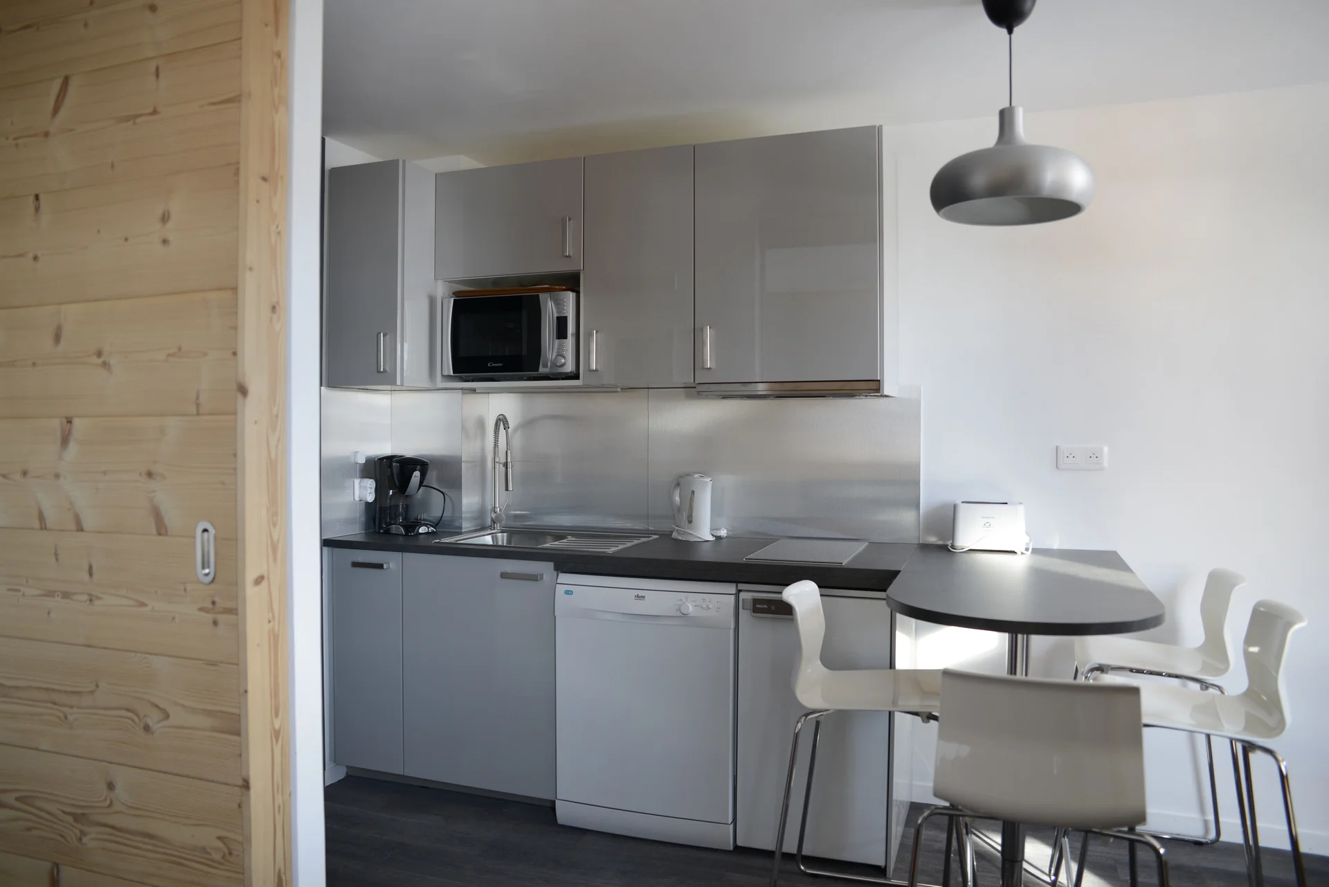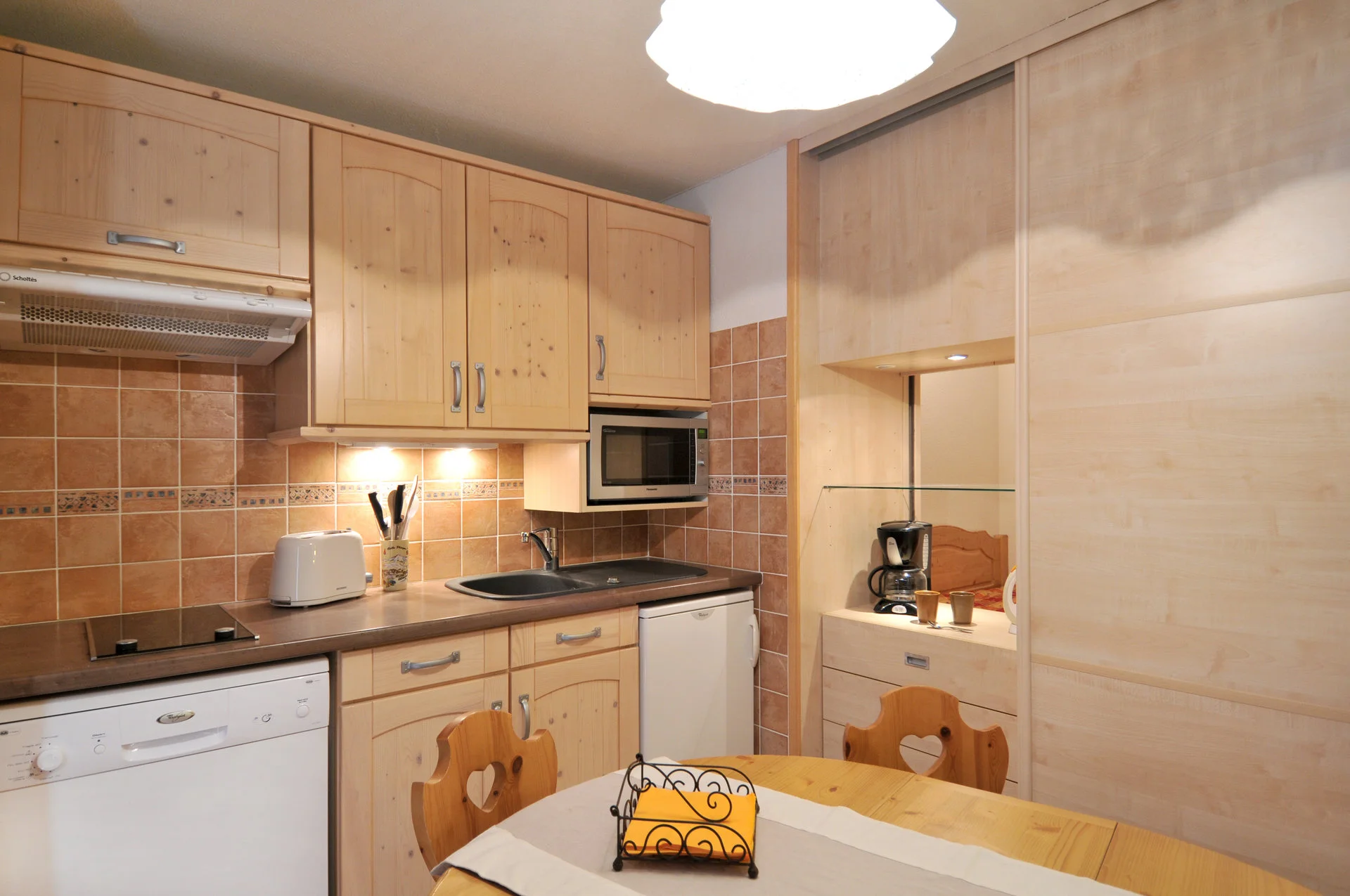 Inductiekookplaat, vaatwasser, koelkast, oven, magnetron, elektrisch koffiezetapparaat, waterkoker, broodrooster, snijplank, pannen en kookgerei, bestek en servies voor 12 personen, glaasjes, kommen, fondue-set, drukpan, broodmes, vleesmes, schilmesjes, flessenopener, kurkentrekker, houten lepels, spatel, pollepel, garde, slaadessen, rasp, citruspers, theezeefje, ijsblokjesvorm, afwasgerei.