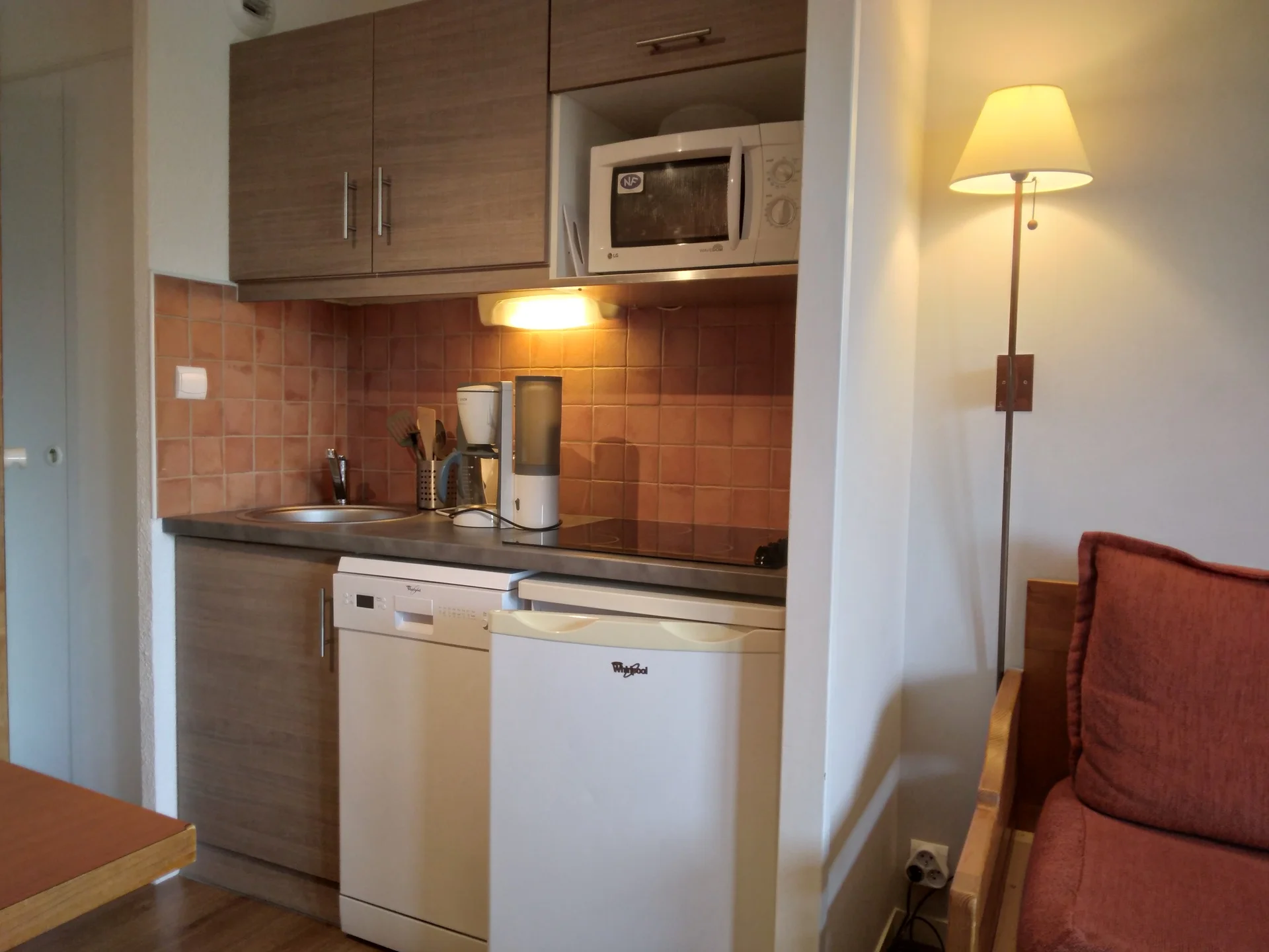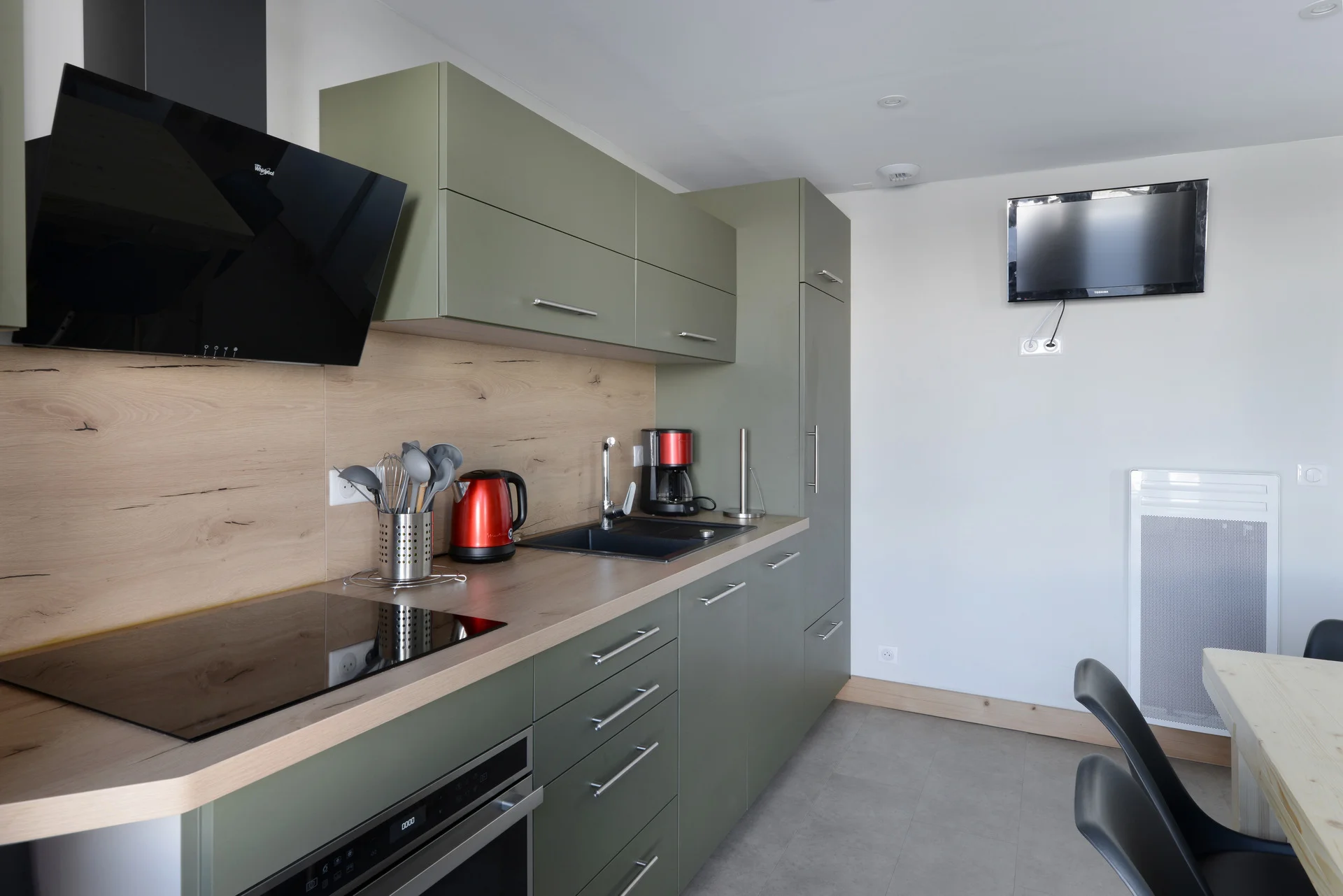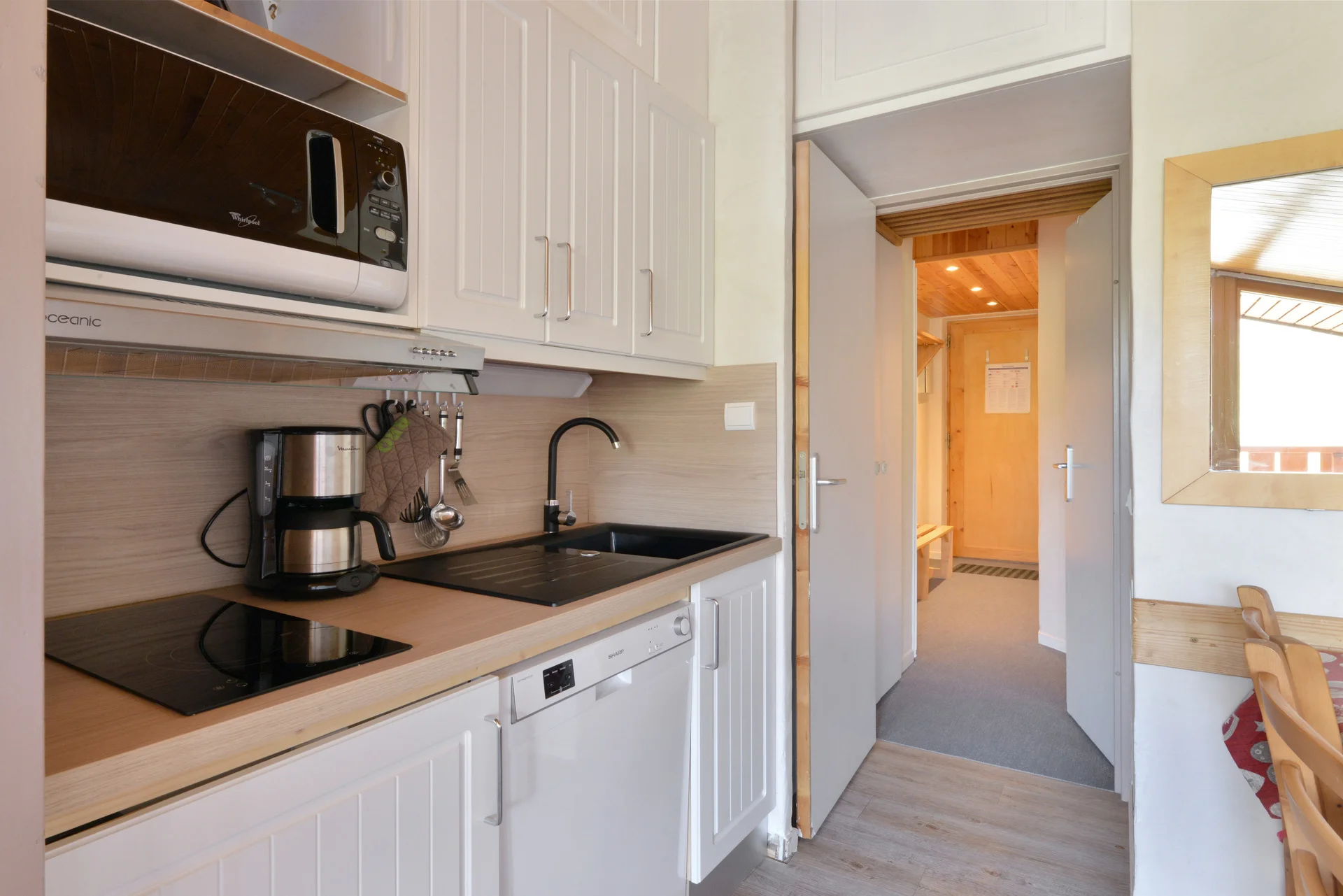 Het appartement heeft volledige keukenapparatuur: inductiekookplaat, vaatwasser, elektrische koffiezetapparaat, waterkoker, broodrooster, oven, magnetron, koelkast, grill-pan, sauteerpan, vier koekenpannen en vier steelpannen met deksels. Daarnaast zijn voorhanden: serviesset (16 borden, 6 mokken, 8 koffiekopjes, 17 kommen, 8 eierdopjes), bestek (16 messen, 20 vorken, 16 soeplepels, 21 theelepels, 8 vleesmessen), glazen (16 klassieke glazen, 12 voetglazen, 11 gewone glazen), vier glazen saladeschalen, twee roestvrijstalen schalen, verschillende schalen en bakvormen, twee theezeefjes, twee waterkannen, grillpan, 12 fonduevorken, sinaasappelpers, boteraardewerk, twee tandenstokershouders, twee kurkentrekkers, twee fleschenopeners, twee universele openeners, schuimspaan, vijf houten lepels, twee grote vorken, pollepel, twee whisk, salade-bestek, schaar, twee rasp, maatglas, slacentrifuge, vergiet, vier snijplanken en drie broodmanden. Voor huishoudelijk gebruik zijn aanwezig: twee asbakken, twee tafelmantels, twee onderzetter, poetsemmer, twee vuilniszakhouders, twee stofblik, twee stoffer-borstelset, bezem met borstel, Rowenta-stofzuiger, twee plastic boxen met vier deksels, twee schoonmaakborsteltjes, verlengsnoer en drie elektrische stopcontacten.