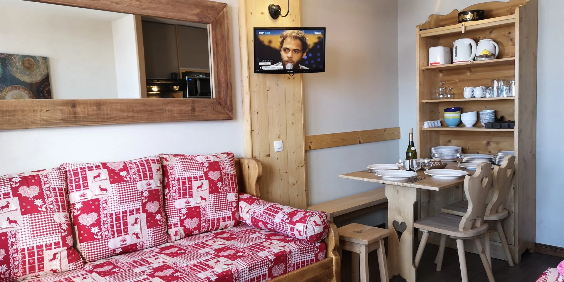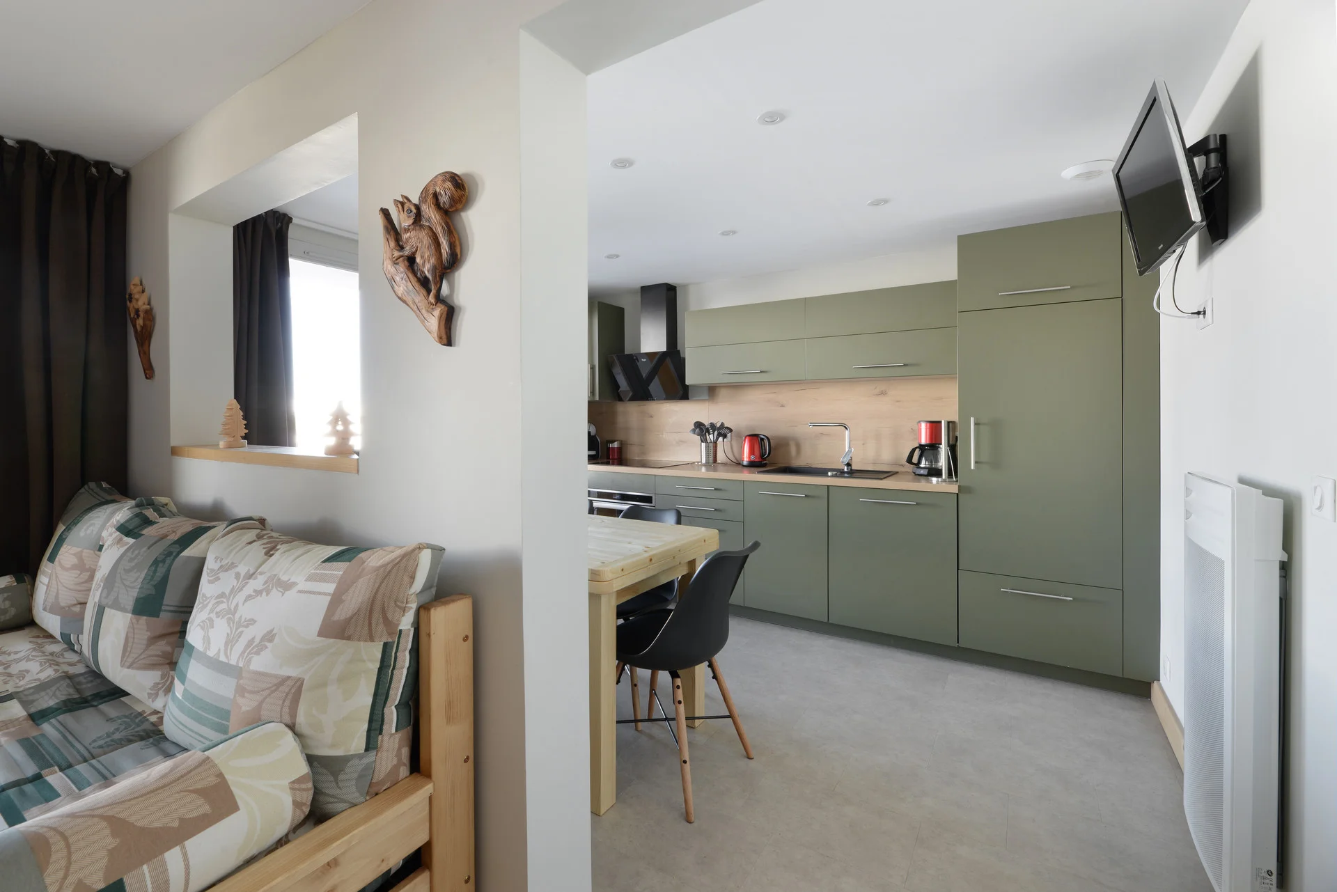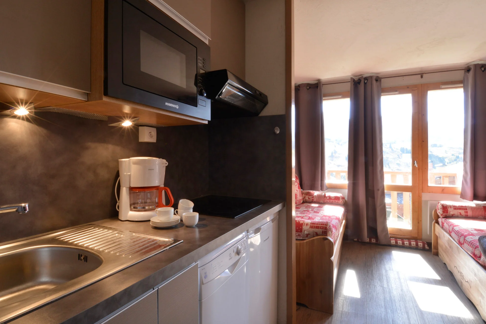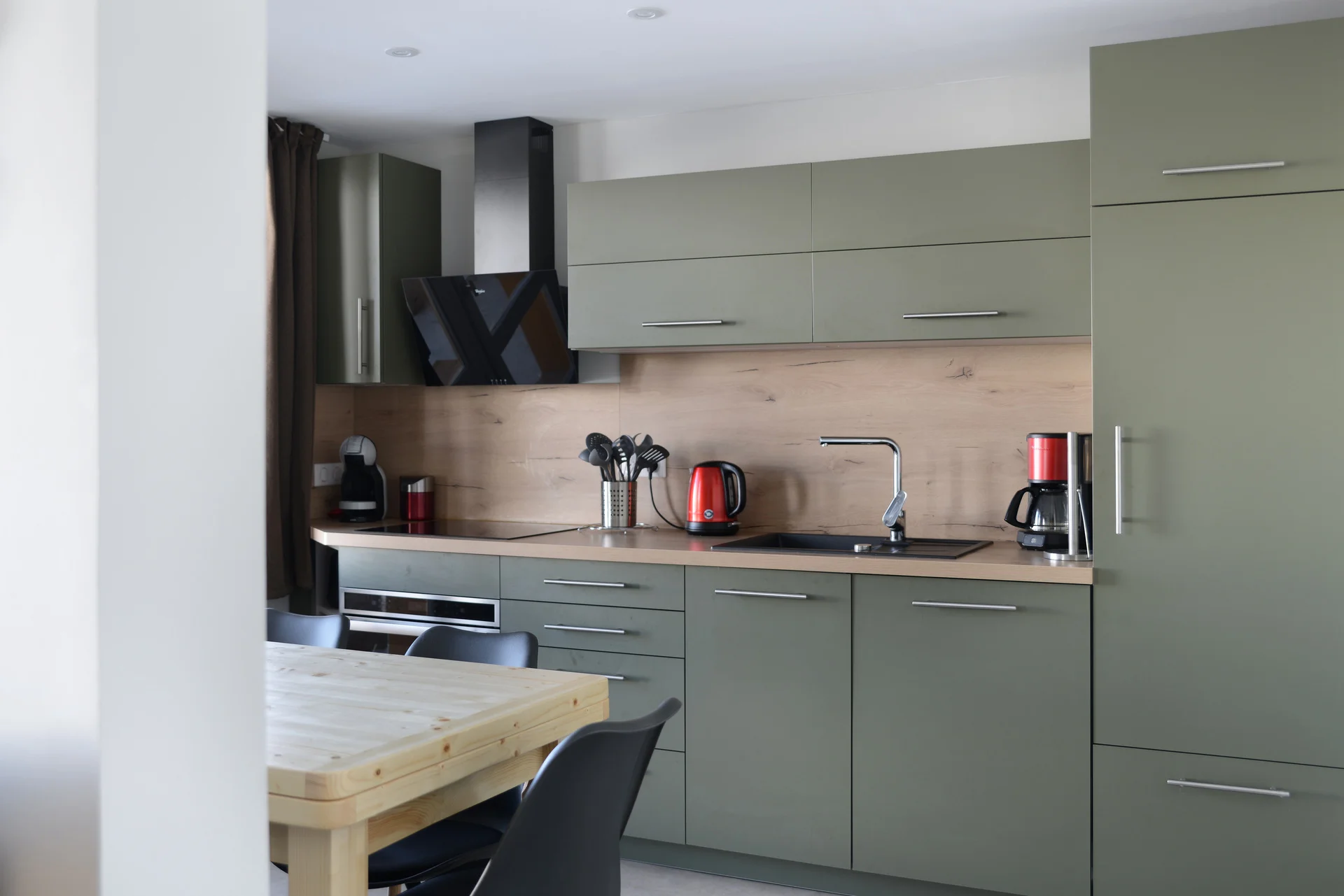 Het appartement heeft volledige keukenapparatuur: inductiekookplaat, vaatwasser, elektrische koffiezetapparaat, waterkoker, broodrooster, oven, magnetron, koelkast, grill-pan, sauteerpan, vier koekenpannen en vier steelpannen met deksels. Daarnaast zijn voorhanden: serviesset (16 borden, 6 mokken, 8 koffiekopjes, 17 kommen, 8 eierdopjes), bestek (16 messen, 20 vorken, 16 soeplepels, 21 theelepels, 8 vleesmessen), glazen (16 klassieke glazen, 12 voetglazen, 11 gewone glazen), vier glazen saladeschalen, twee roestvrijstalen schalen, verschillende schalen en bakvormen, twee theezeefjes, twee waterkannen, grillpan, 12 fonduevorken, sinaasappelpers, boteraardewerk, twee tandenstokershouders, twee kurkentrekkers, twee fleschenopeners, twee universele openeners, schuimspaan, vijf houten lepels, twee grote vorken, pollepel, twee whisk, salade-bestek, schaar, twee rasp, maatglas, slacentrifuge, vergiet, vier snijplanken en drie broodmanden. Voor huishoudelijk gebruik zijn aanwezig: twee asbakken, twee tafelmantels, twee onderzetter, poetsemmer, twee vuilniszakhouders, twee stofblik, twee stoffer-borstelset, bezem met borstel, Rowenta-stofzuiger, twee plastic boxen met vier deksels, twee schoonmaakborsteltjes, verlengsnoer en drie elektrische stopcontacten.