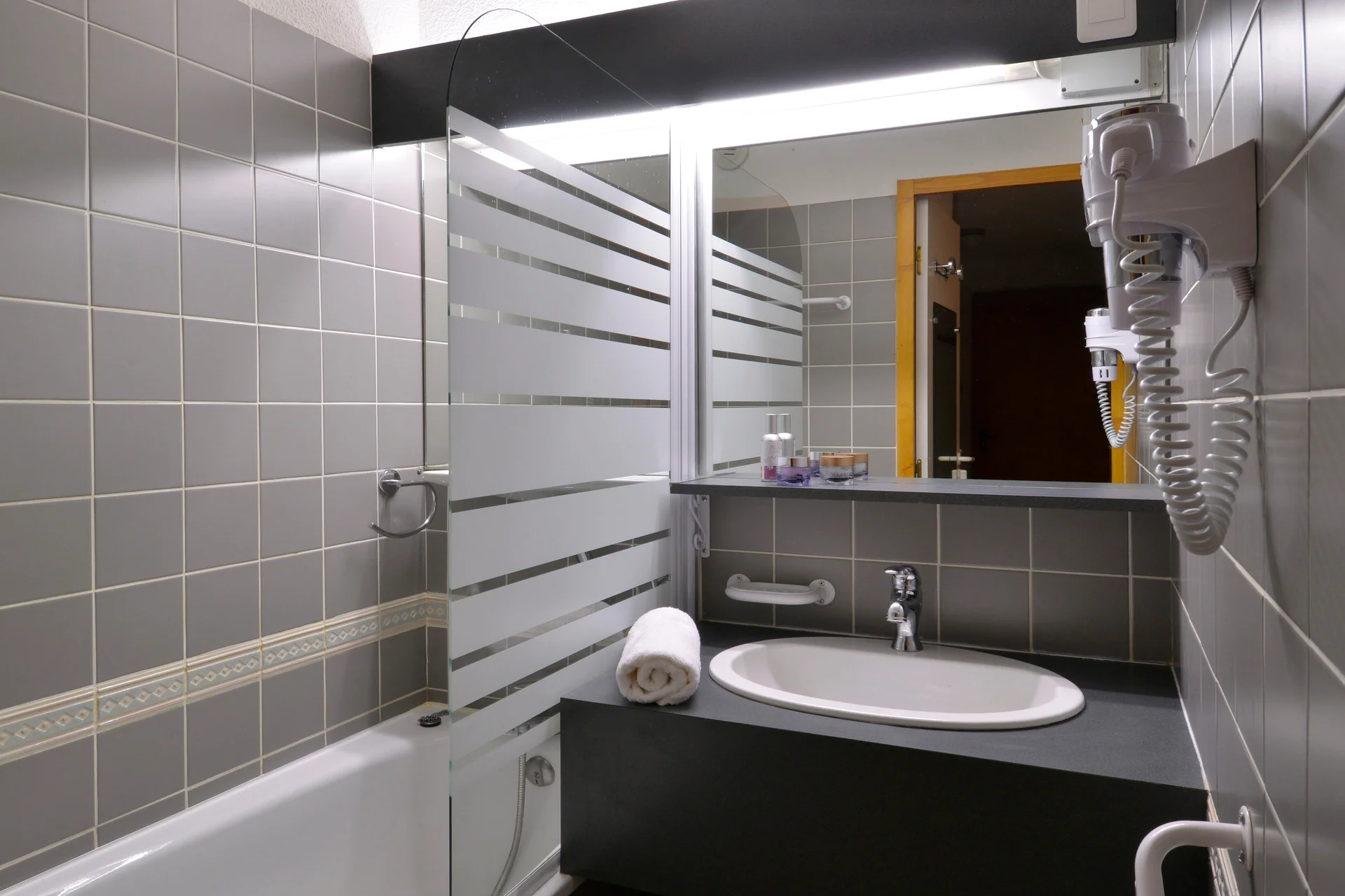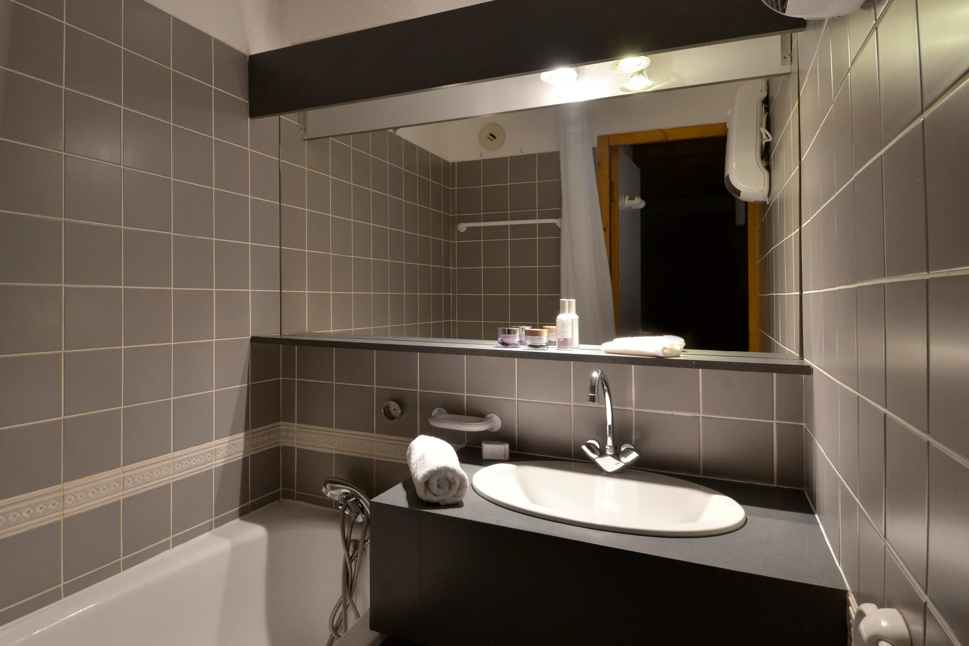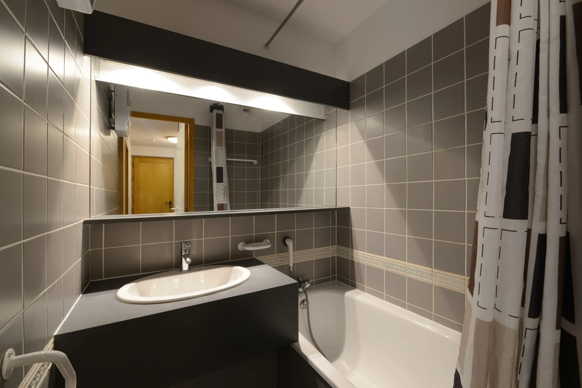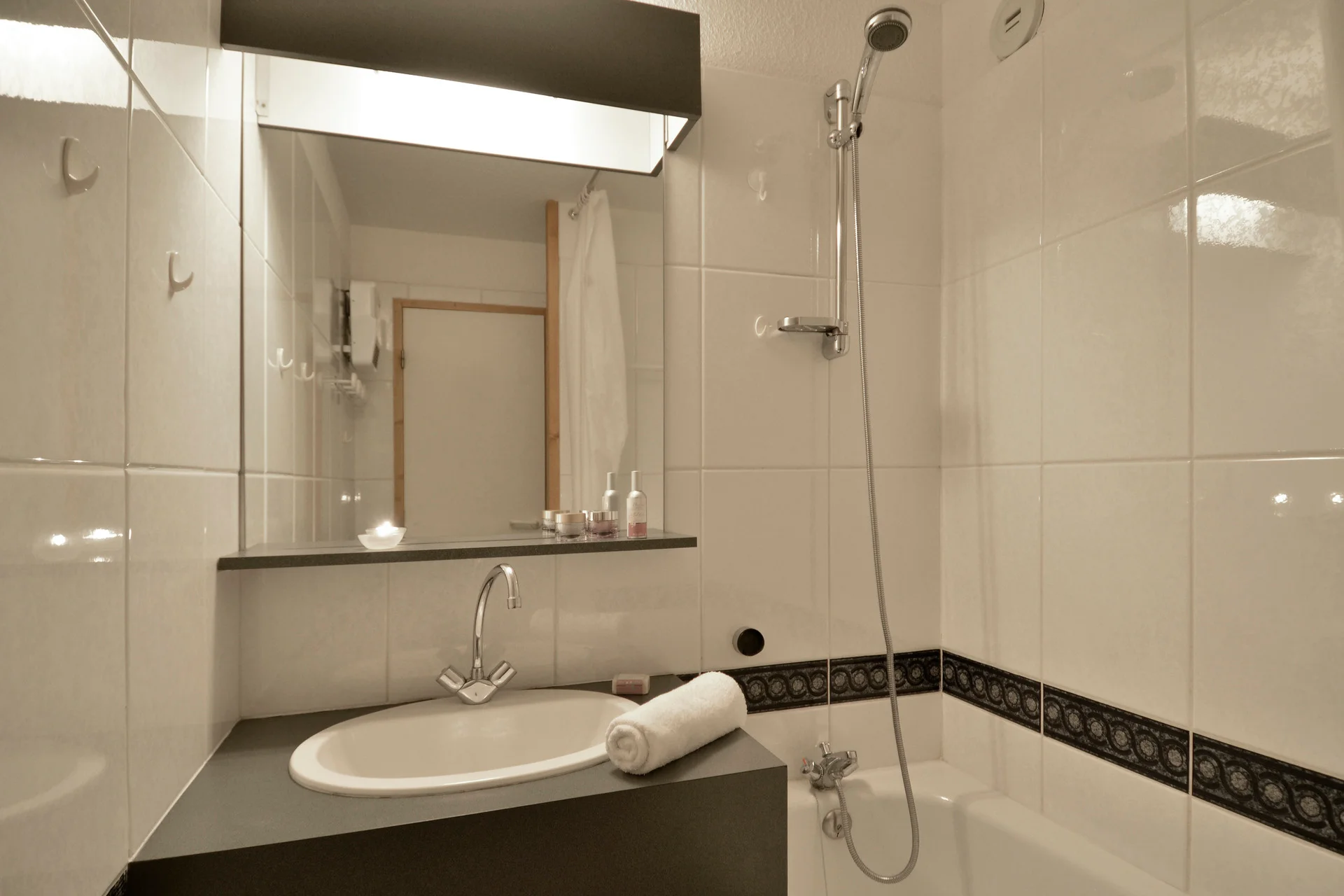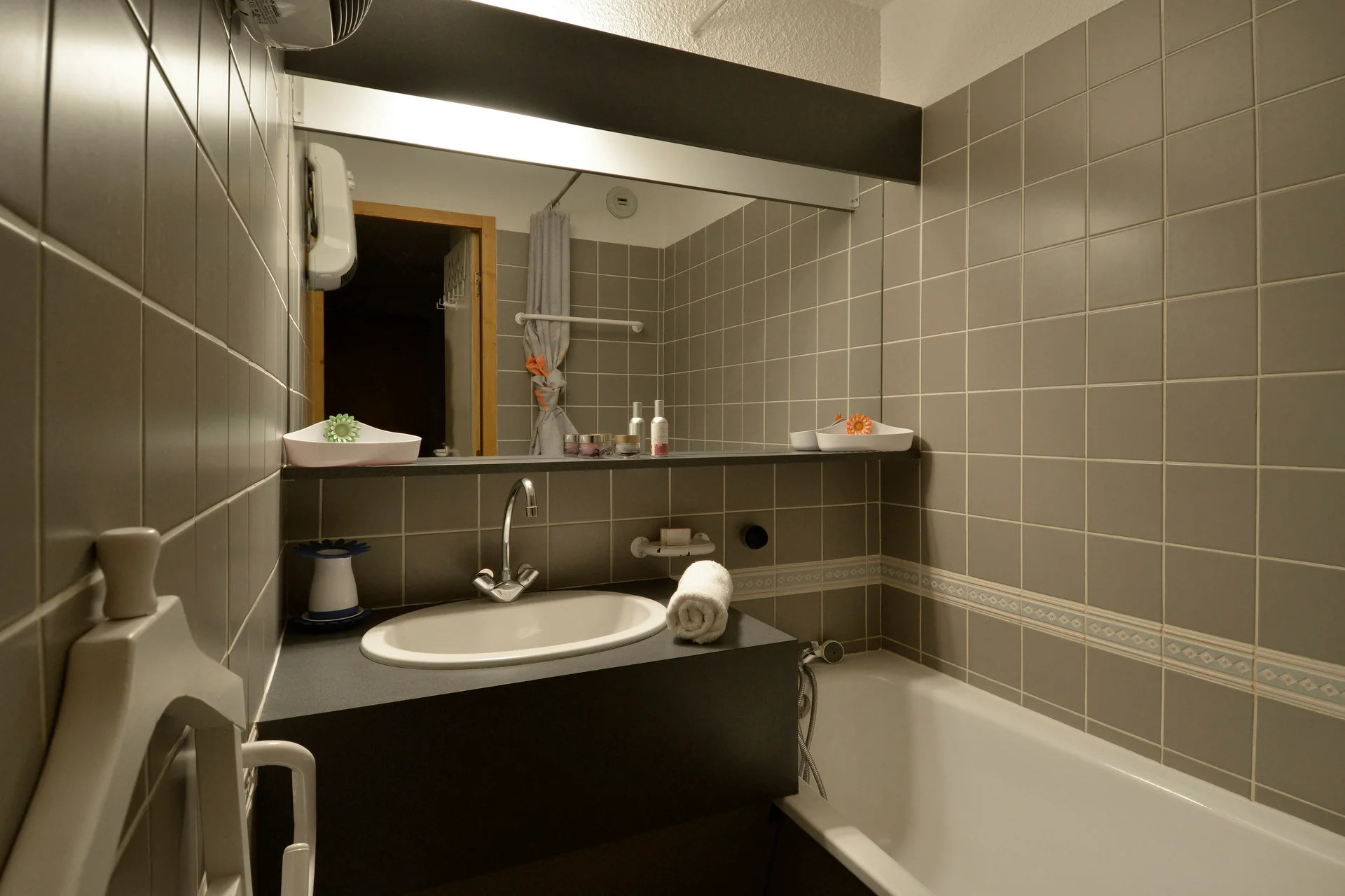 Badkamer met toiletpapierhouder, kapstokken, handdoekrekken, spiegel, radiator en wandplank. Apart toilet met toiletbenodigdheden.