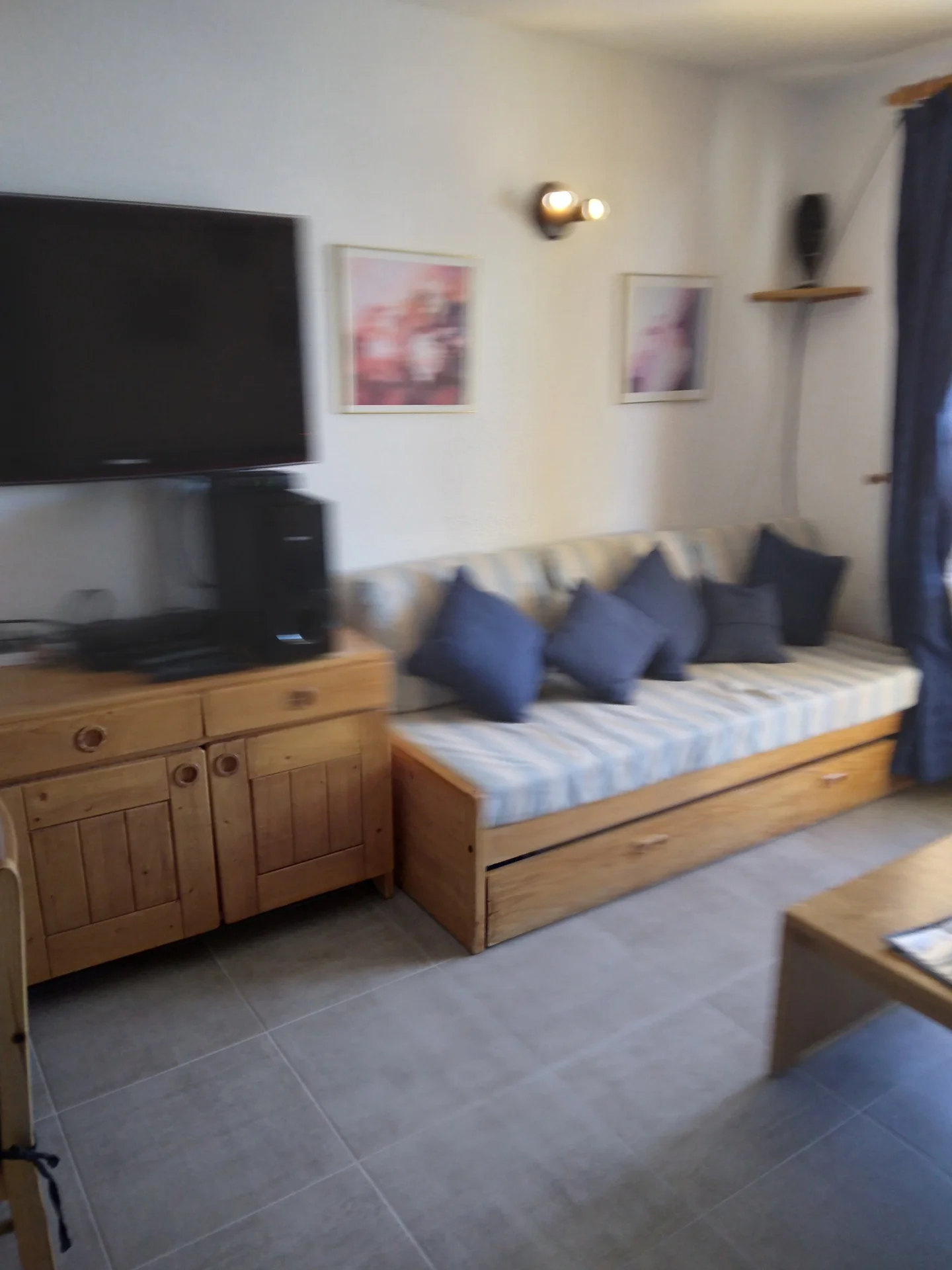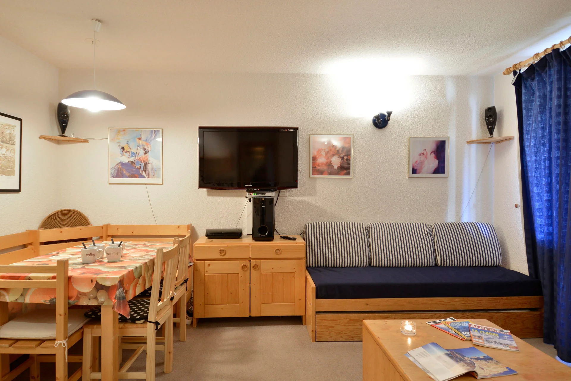 Gezellige zithoek met zitbank, ronde salontafel, 6 stoelen, meubel voor televisie, televisie met afstandsbediening en decoder, wandlampen, plafondlampen, staanlamp, nachtlampje, vloerkleed, wanddecoratie, radiator, rolgordijn en gordijnen.