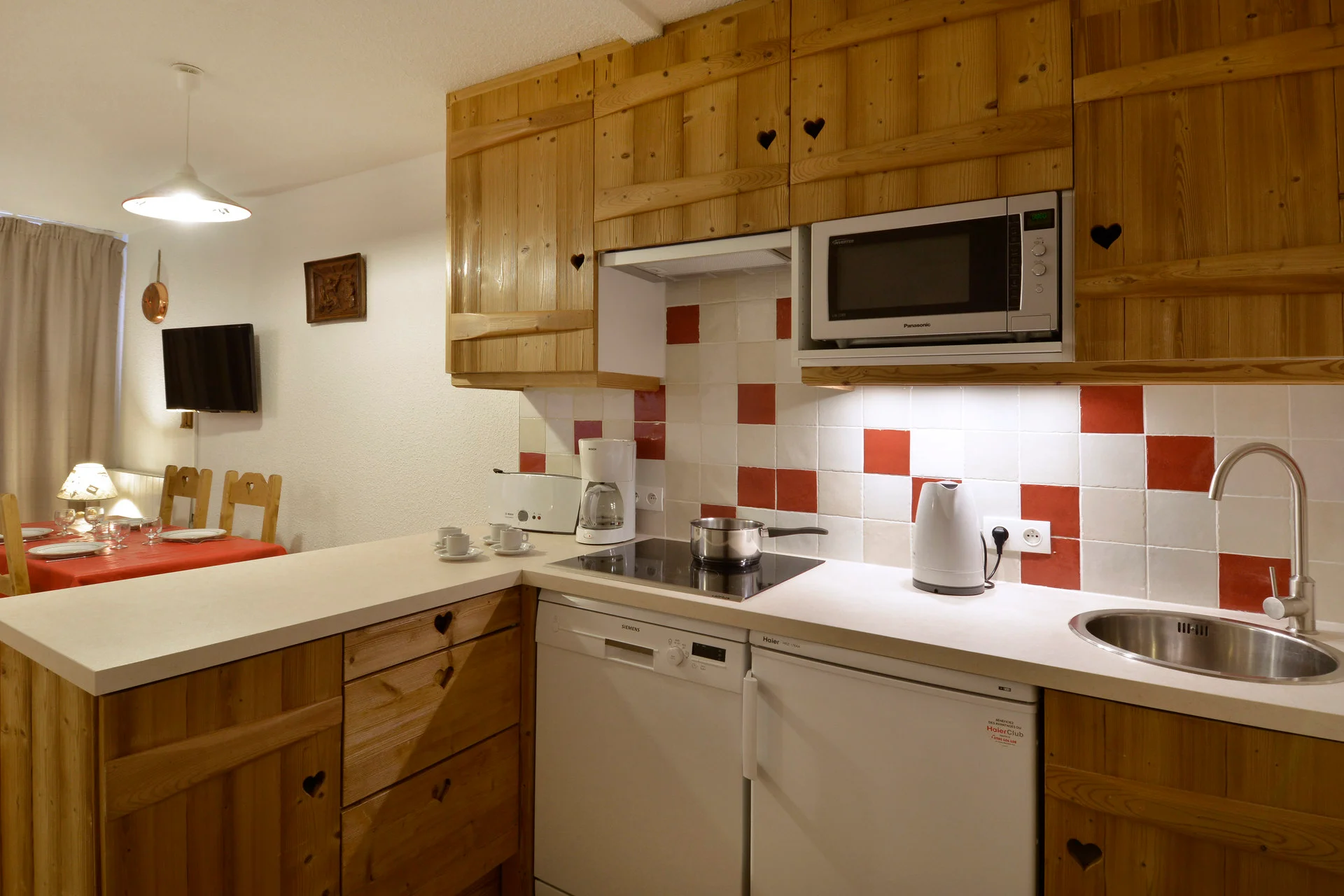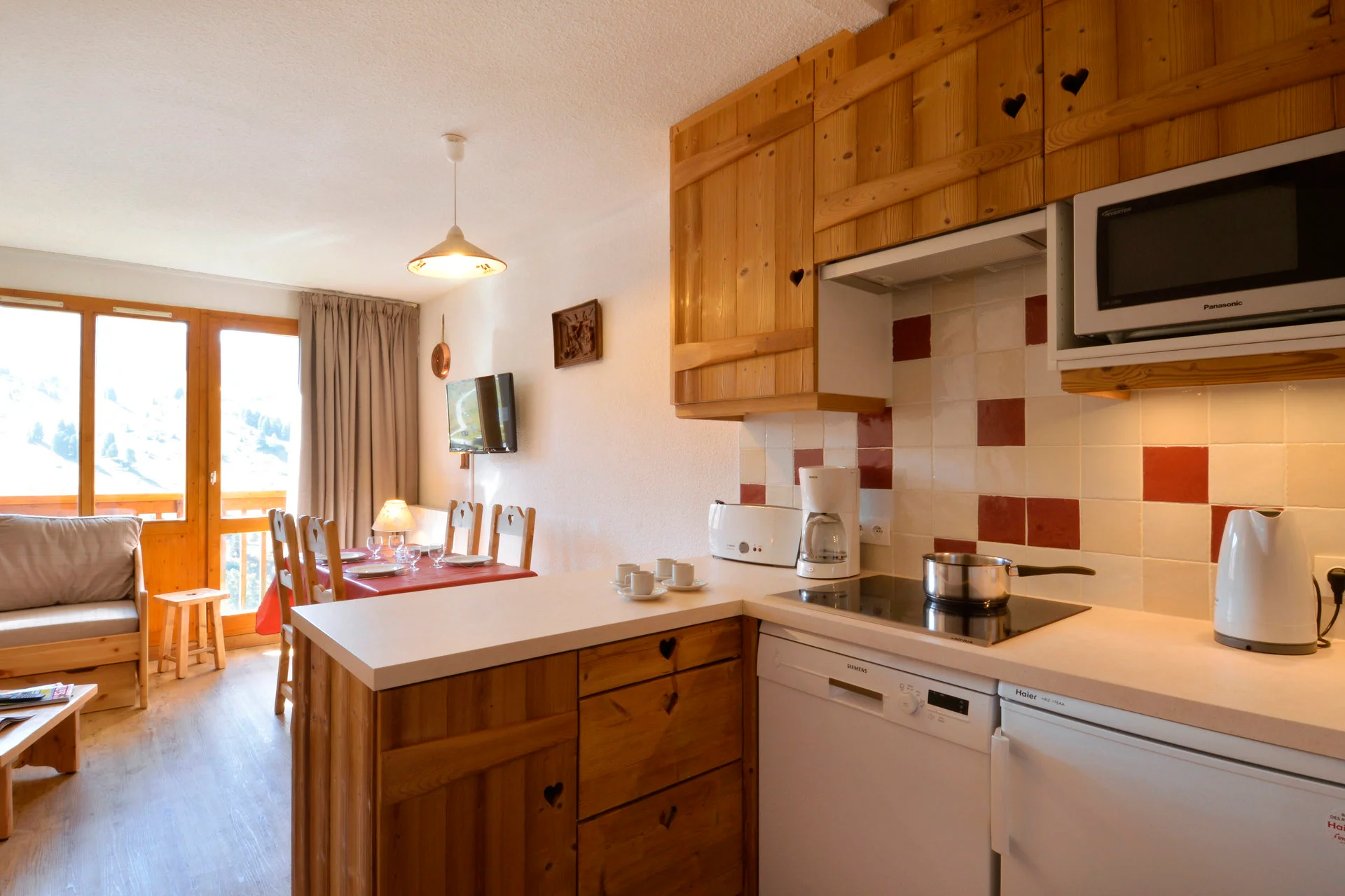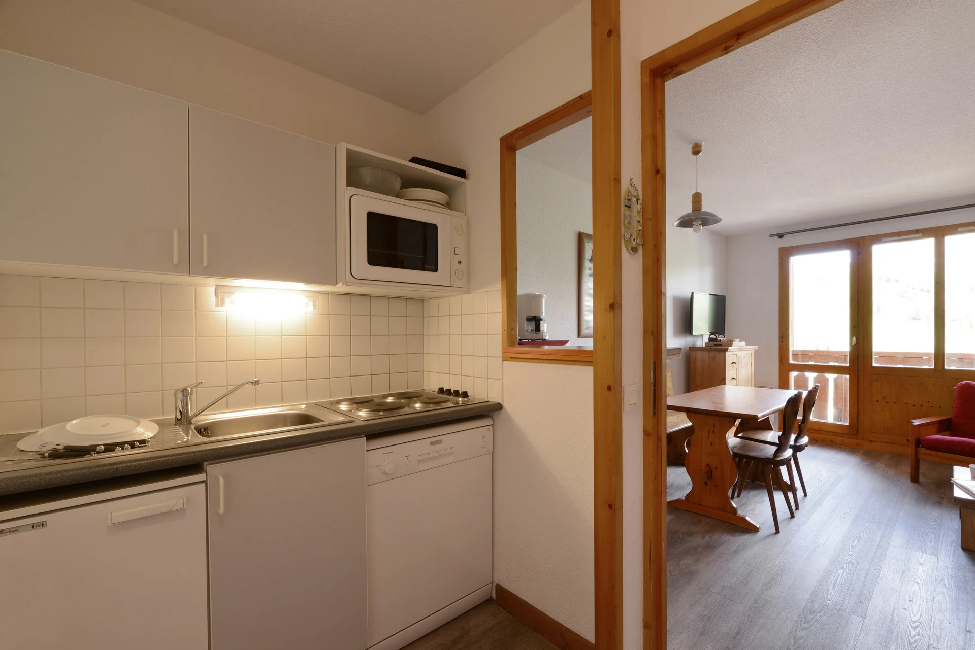 Het appartement beschikt over een volledig uitgeruste keuken met inductiekookplaat, vaatwasser, oven, magnetron, koelkast, koffiezetapparaat (Magimix), espressoapparaat, waterkan, theeballen, verschillende saladeschalen, tafelserviezen, bestek, broodknippen, ui- en kaasmes, houten lepels, spatels, garde, soeplepel, skimmer, blikopener, schaar, zeef, snijplank, slacentrifuge, sinaasappelpers, tafelmats, asbak, flessenopener, raclette-apparaat, strijkijzer op standaard, stofzuiger, emmer, zwabber, bezem, stoffer en blik, en afvalemmer.