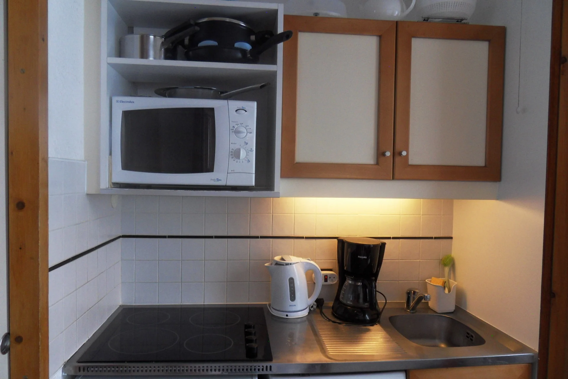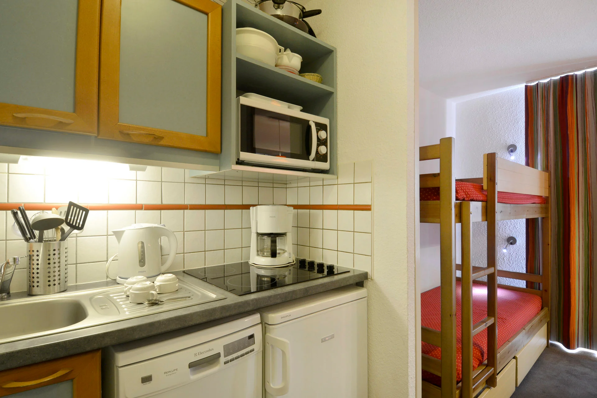De studio is voorzien van een volledige keukenuitrusting met inductiekookplaat (3 pitten), oven, koelkast, vaatwasser, magnetron, waterkoker, broodrooster, koffiezetapparaat en crêpepan. Verder zijn beschikbaar: pannen, wokpan, braadslede met deksel, verschillende maten snijplanken, bestek, servies voor 12 personen, glazen, kommen, kopjes en theekopjes. Verder vind je er keukenbenodigdheden zoals schaar, flessenopener, kurketrekker, slacentrifuge, fruitspers, keukenmes, broodmes en allerlei praktische hulpstukken.