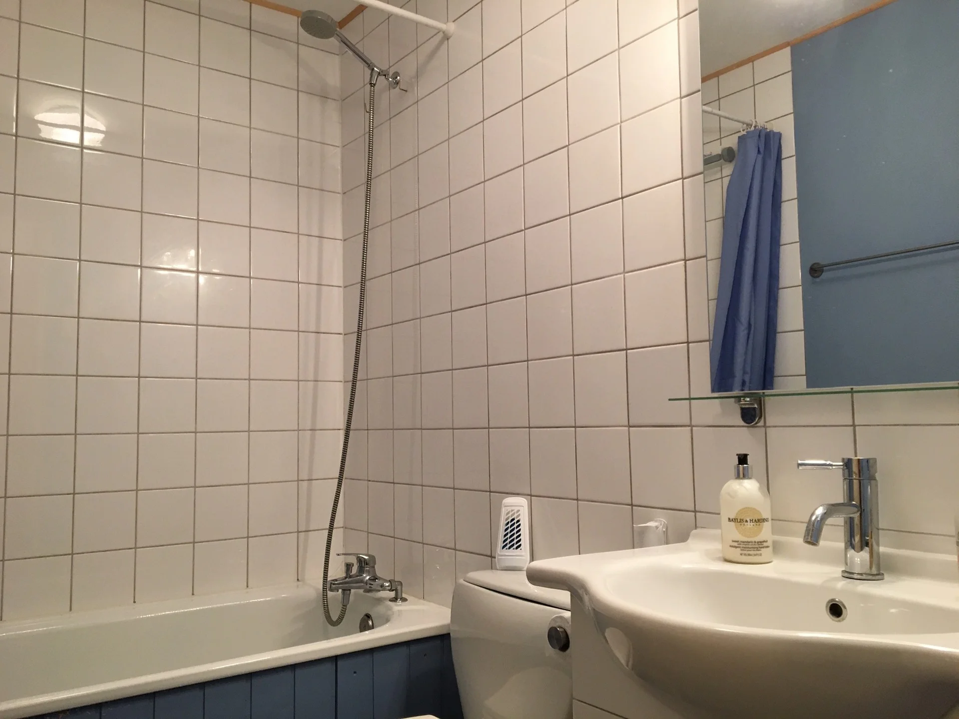Badkamer met ligbad, douche, föhn, wastafel en apart toilet.