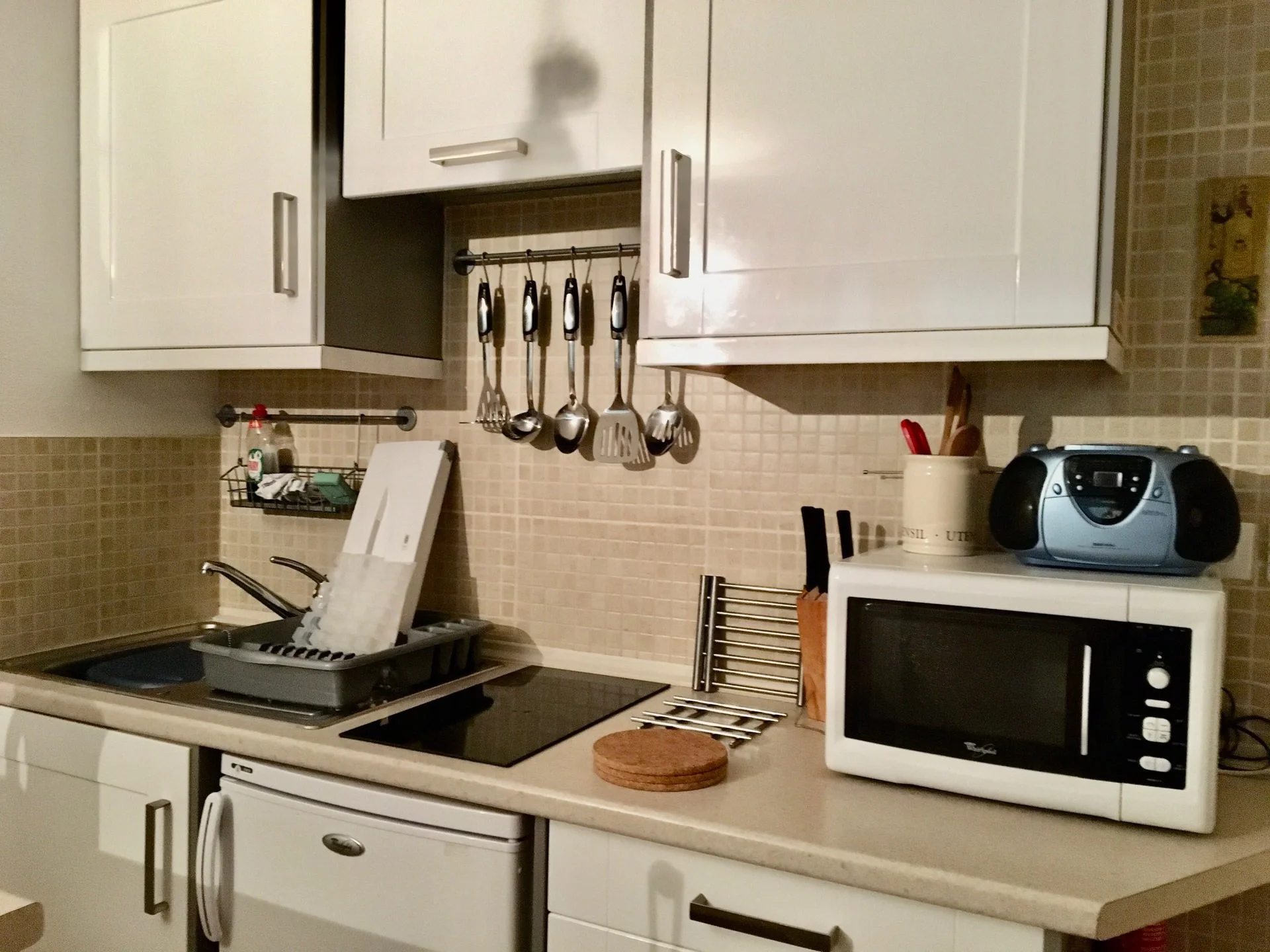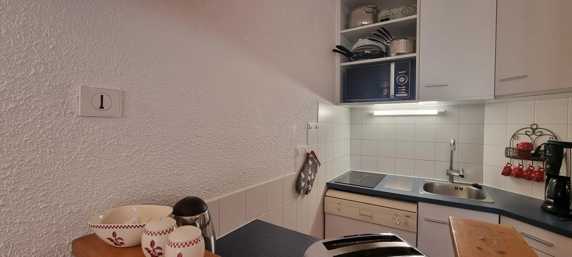 De woonkamer is voorzien van een eettafel met stoelen, TV met afstandsbediening en radiator. De keuken is uitgerust met inductiekookplaat, oven, magnetron, vaatwasser, koelkast, waterkoker, koffiezetapparaat, broodrooster, sinaasappelpers, mixeur, elektrische persen voor fruitsap, servies, bestek, pannen, kookgerei, slacentrifuge en alle benodigde keukenaccessoires.