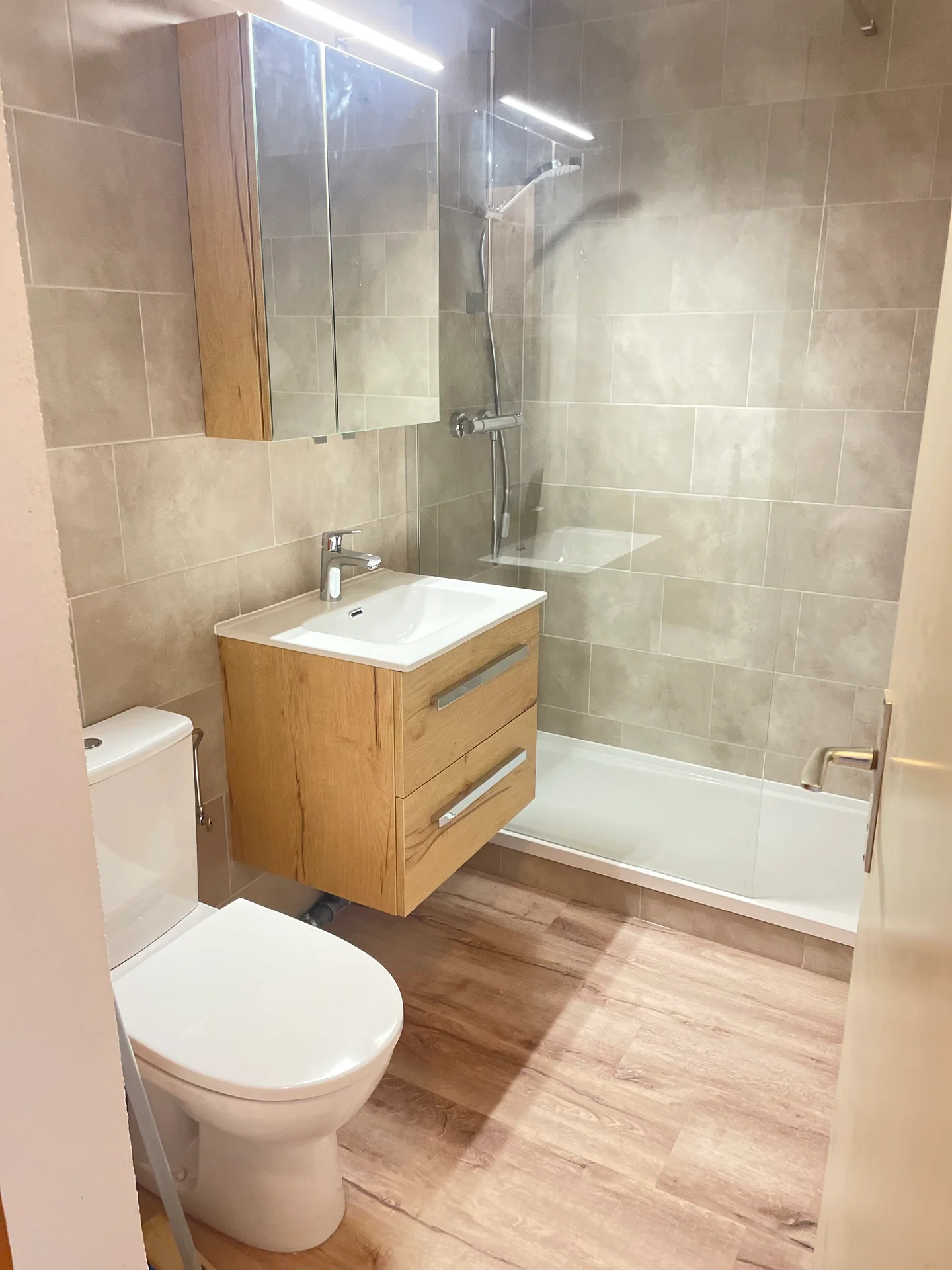 Badkamer met douche en apart toilet. Sèche-serviettes (elektrische handdoekradiator).