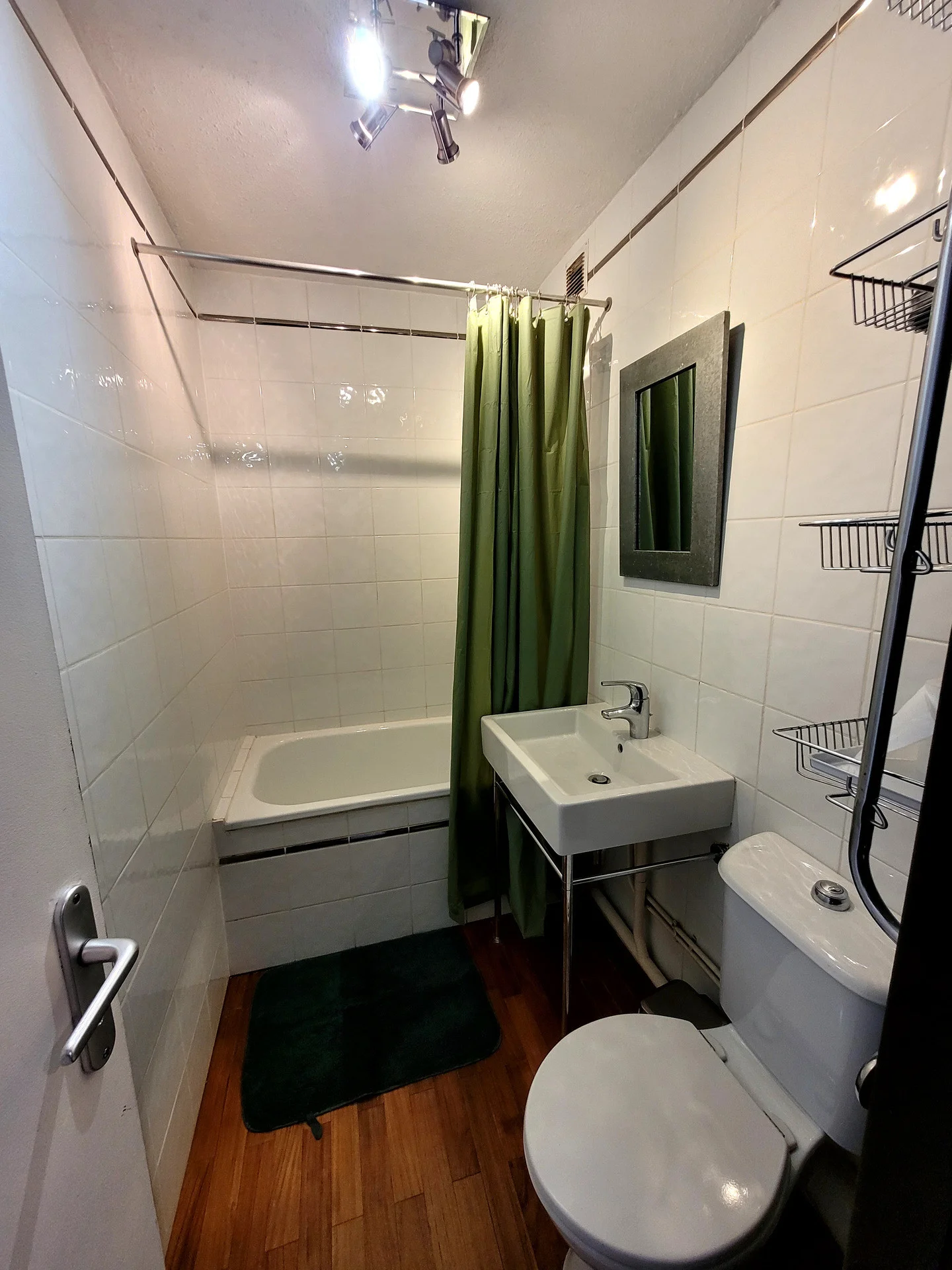 Badkamer met ligbad (met gordijn) en apart toilet.