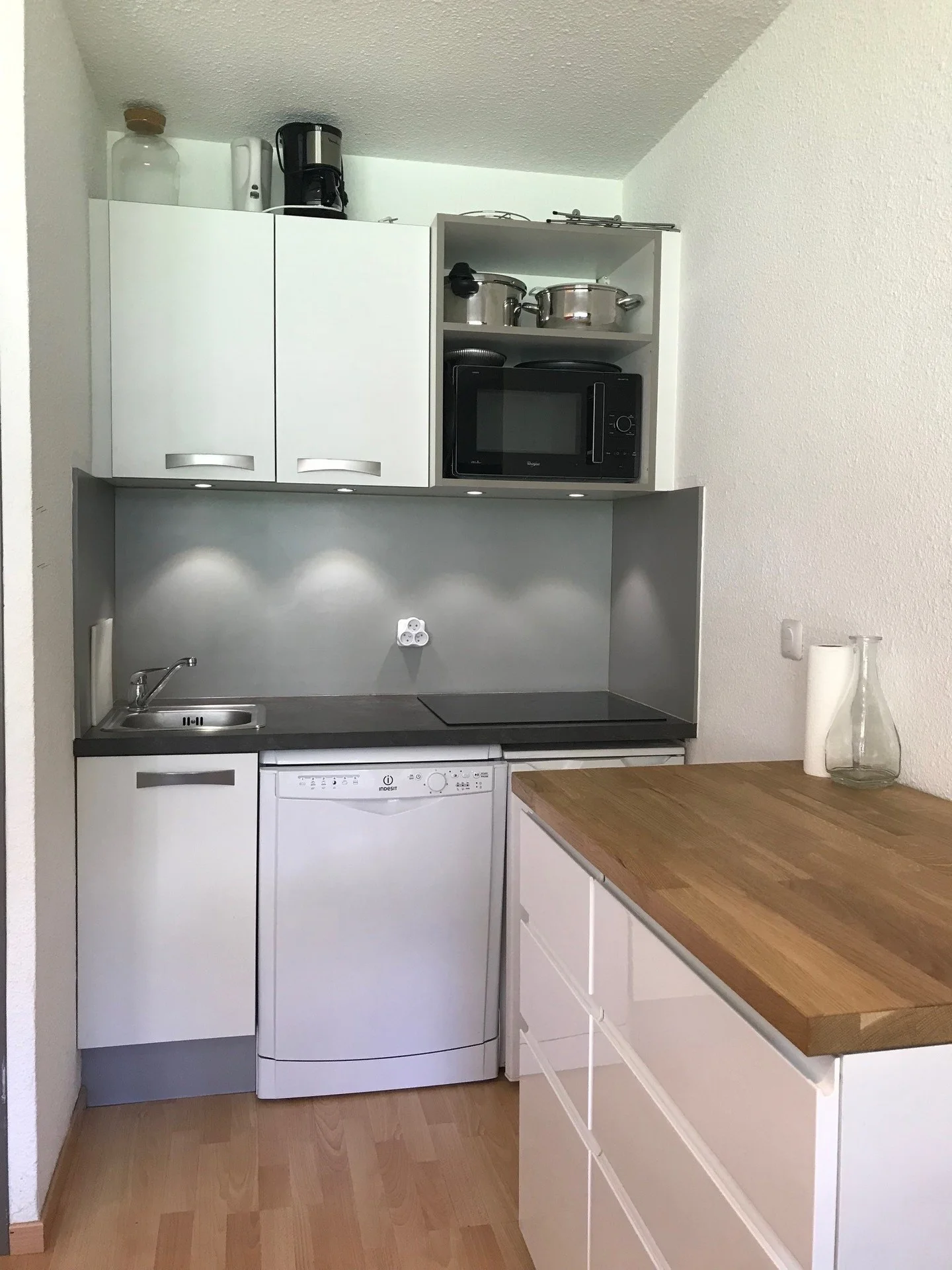 • Alle keukenbenodigdheden aanwezig: servies, bestek, pannen, schalen, glazen, mokken, sinaasappelpers, opeenopener, broodmes, keukenmessen, schaar, slacentrifuge, mes, snijplank en meer