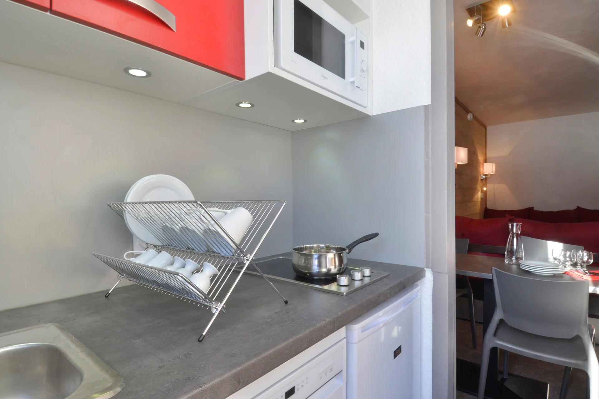 De woonkamer beschikt over een kitchenette met inductiekookplaat (3 pitten), vaatwasser, oven, magnetron, koelkast, broodrooster, waterkoker, koffiezetapparaat en alle benodigde keukenspullen. Beschikbaar zijn servies, bestek, glazen, pannen, kookgerei, saladeslinger, flessenopener, blikopener, broodmes en andere keukenhulpstukken.
