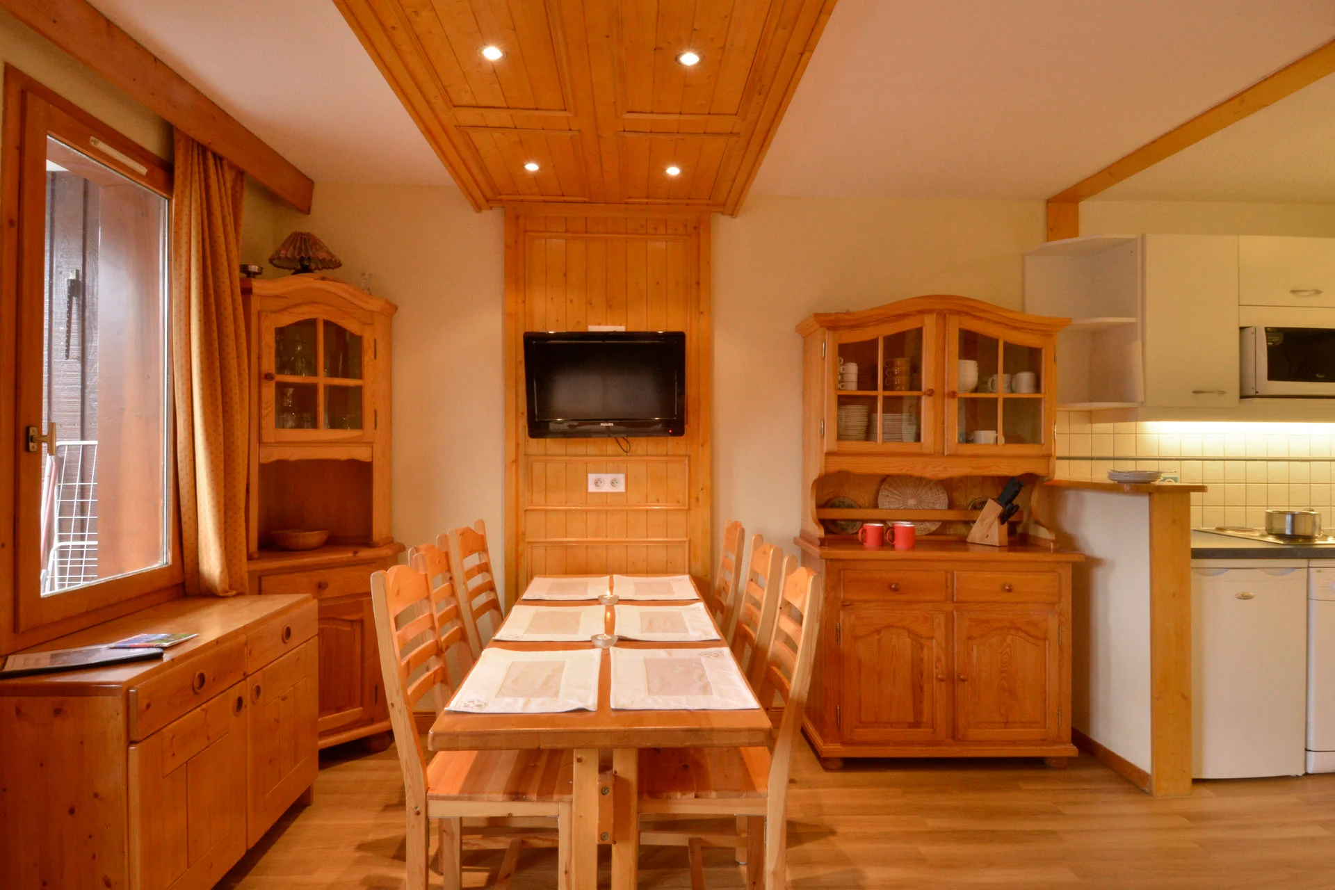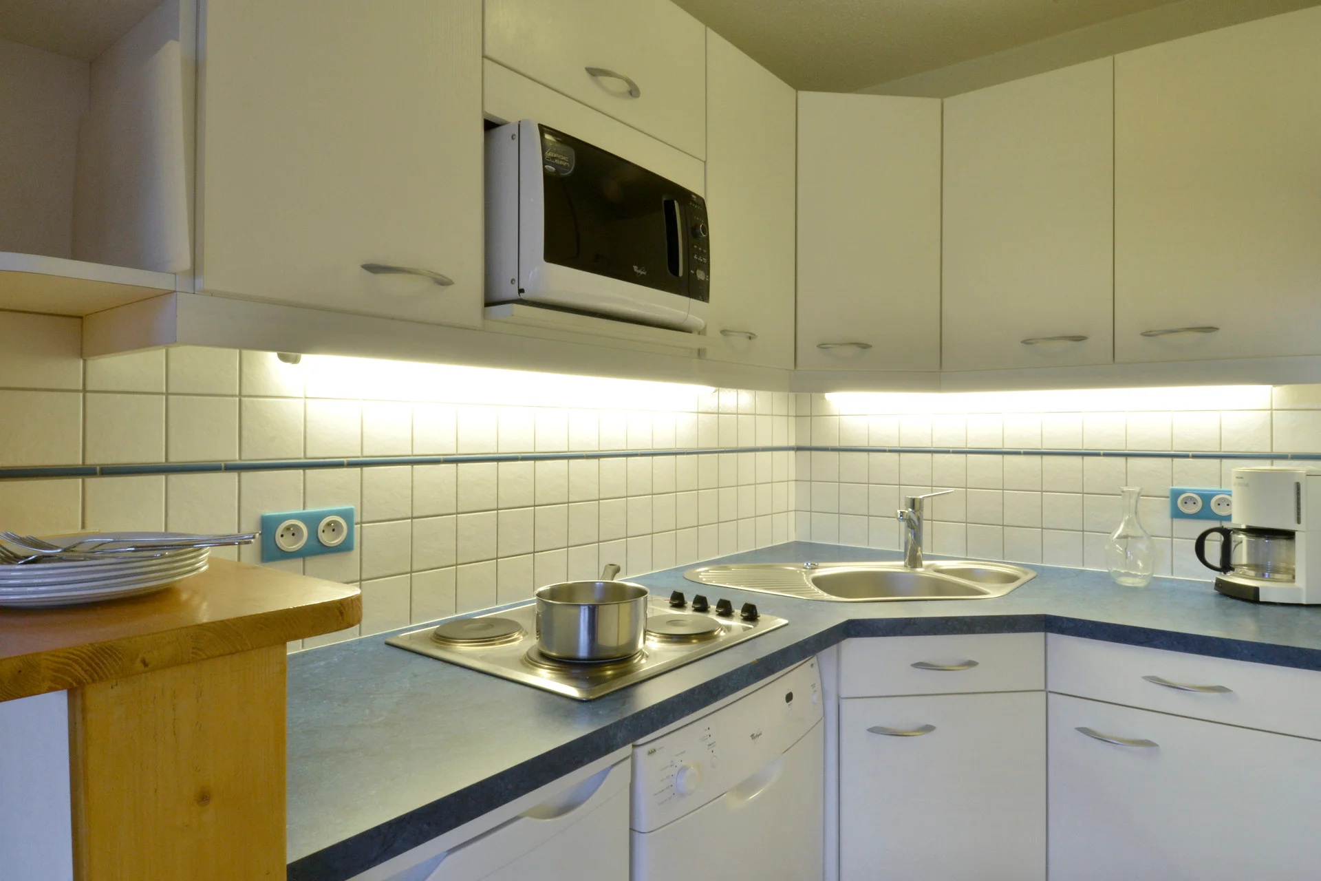 Inductiekookplaat, oven, magnetron, vaatwasser, koelkast, waterkoker, Senseo-apparaat, broodrooster, drukpan, croque-monsieur-maker, sinaasappelpers, openeners en kurkentrekker. Volledige serviesset (borden, kommen, kopjes), bestek, glazen, slacentrifuge, saladeschalen, serveerschalen, pannen, steelpannen, kookgerei en keukenmessen. Snijplanken, broodmand, vergiet, tafel- en theeservies.