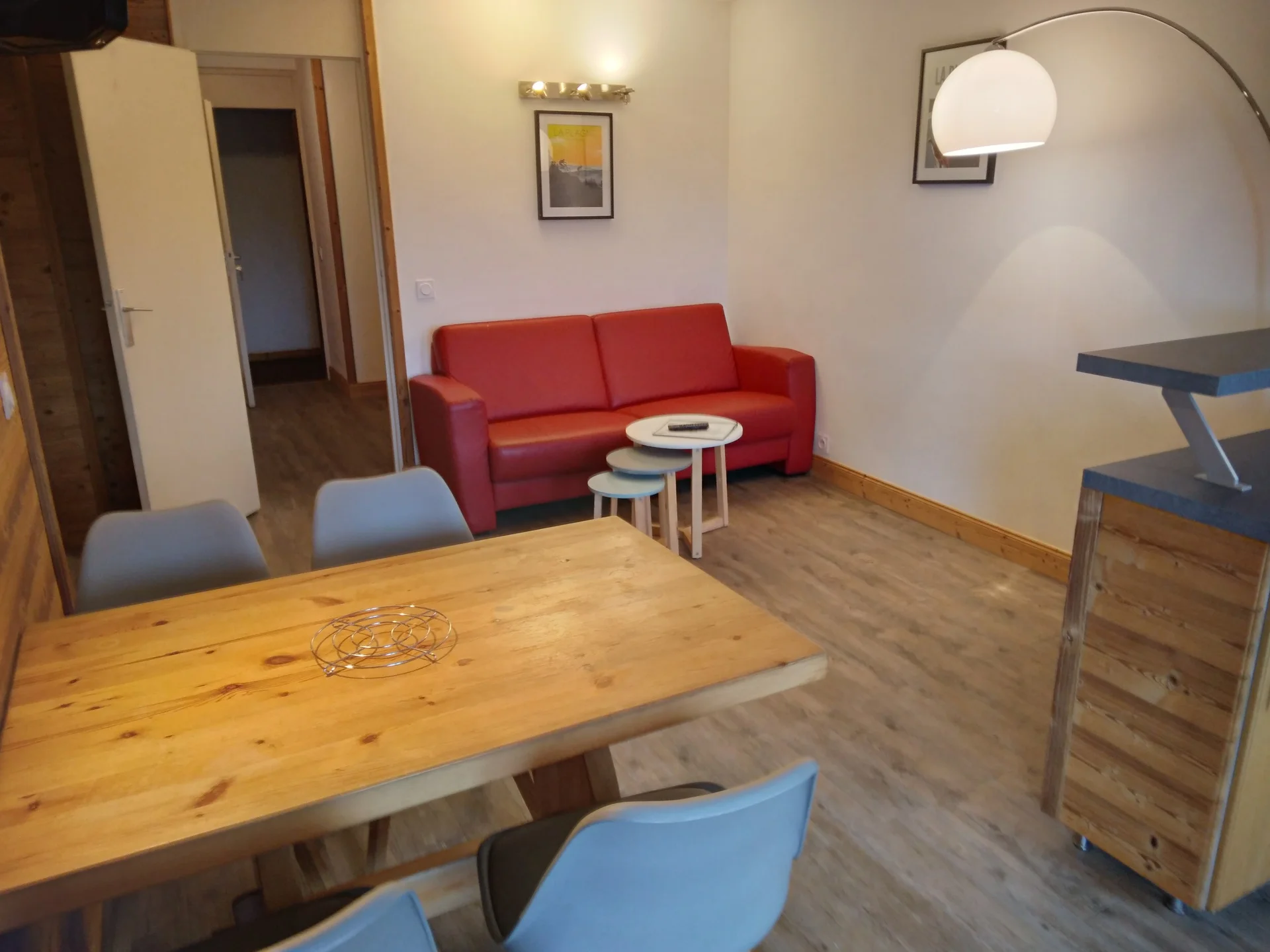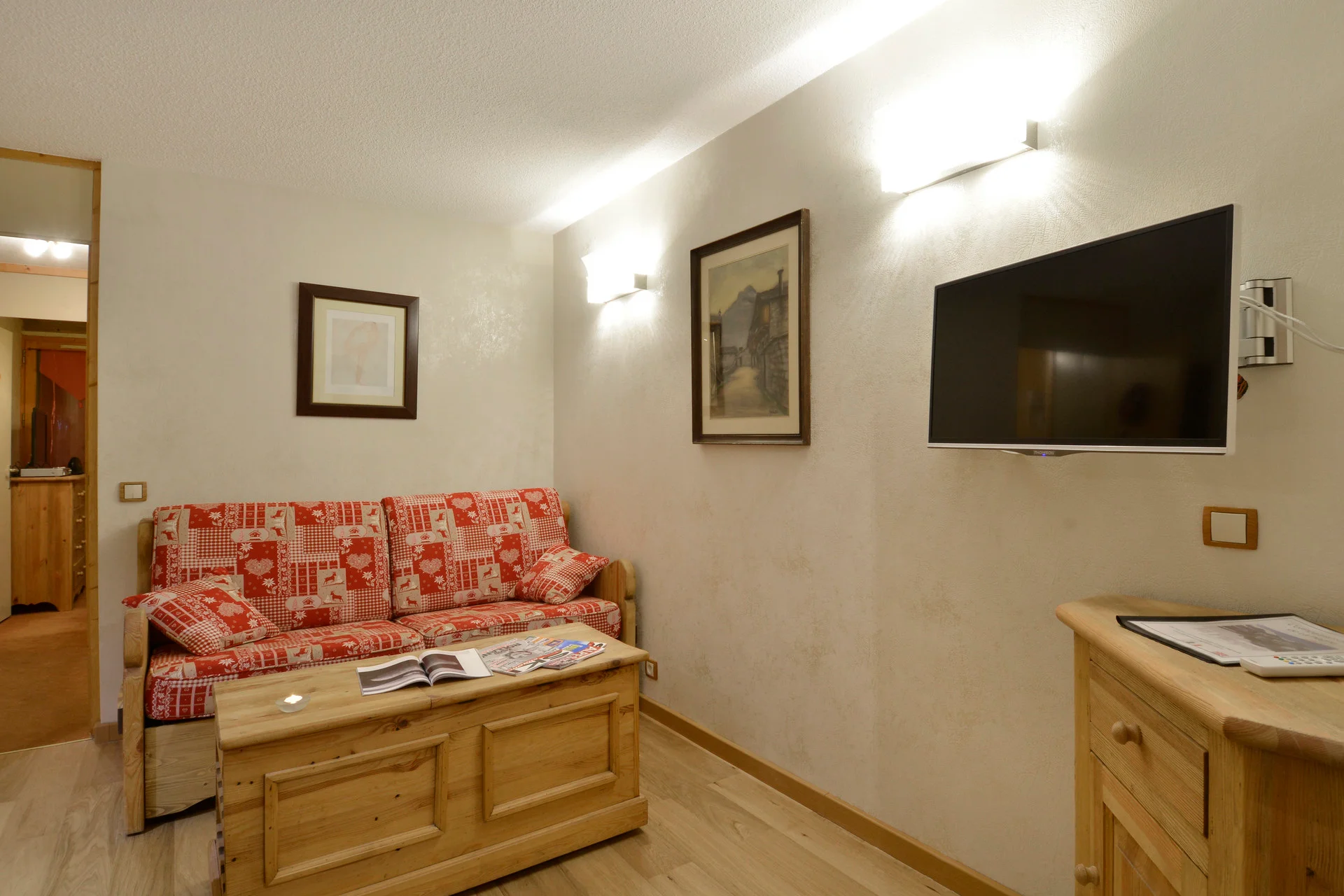Zithoek met stoelen, tafels, kleine salontafel, krukken en kasten. Televisie met afstandsbediening. Boekenplank. Tafellampen, wandlampen en spots. Verwarming aanwezig.