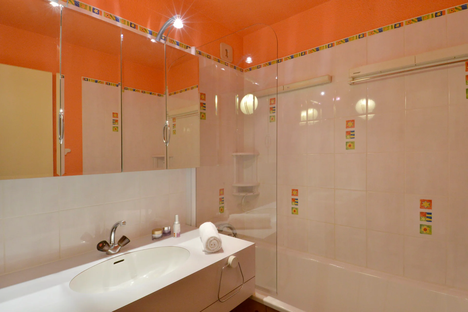 Badkamer met handdoekenrek, douchegordijn, föhn en badmat.