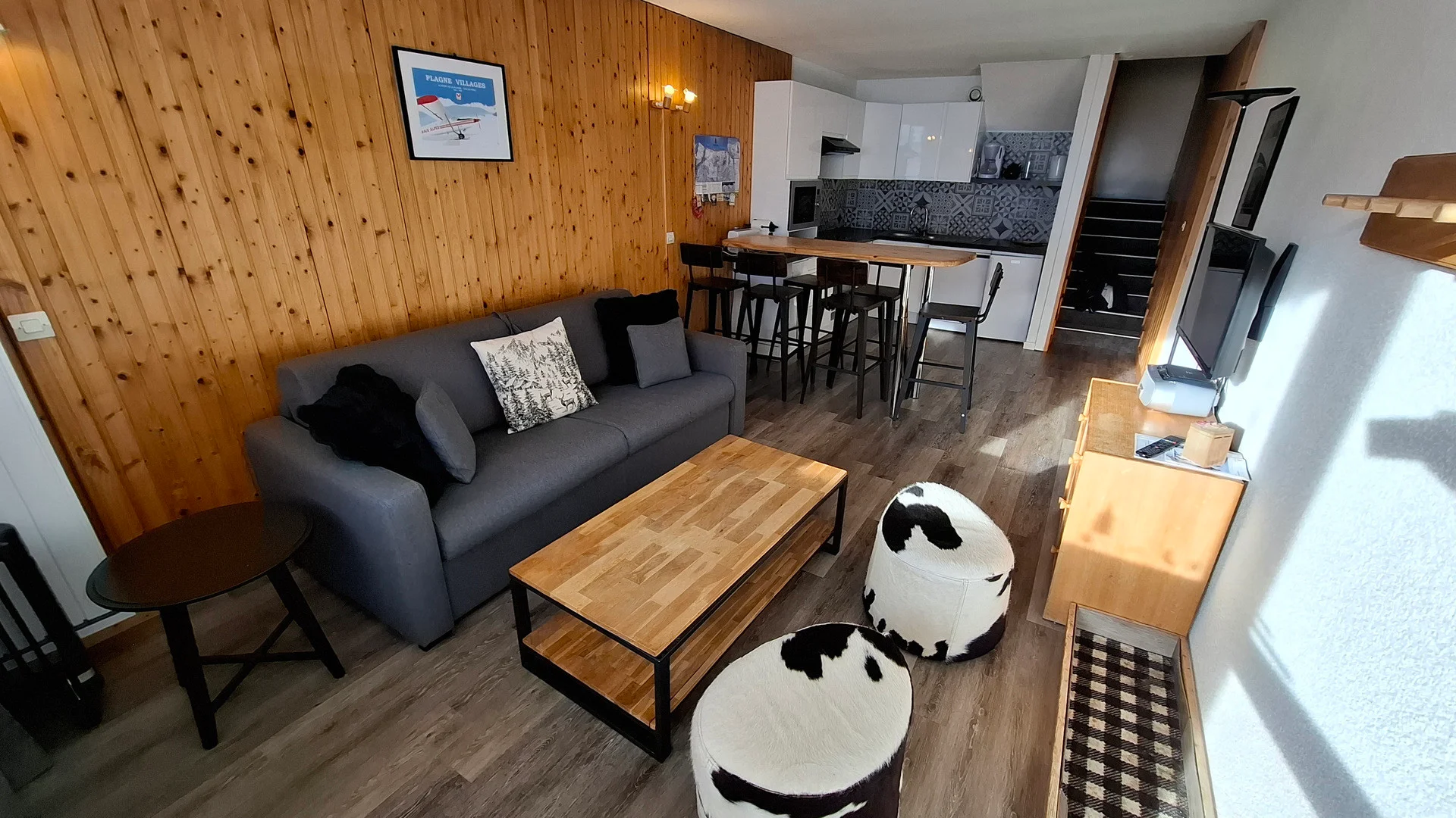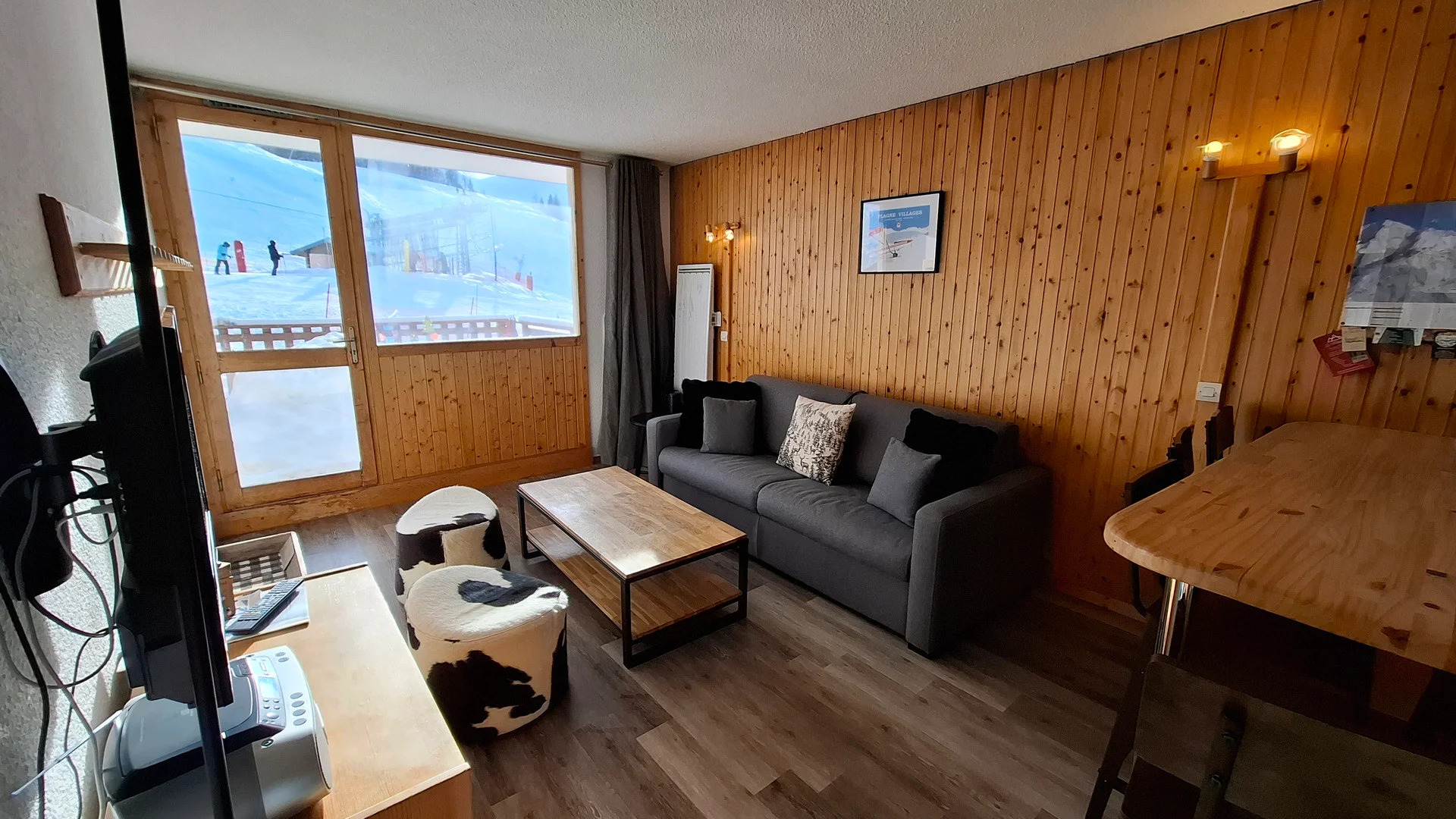 Woonkamer met tv (afstandsbediening), zithoek en slaapbank. Skilocker voor uw materiaal. Elektrisch sèche-serviettes in badkamer. Verwarming aanwezig.
