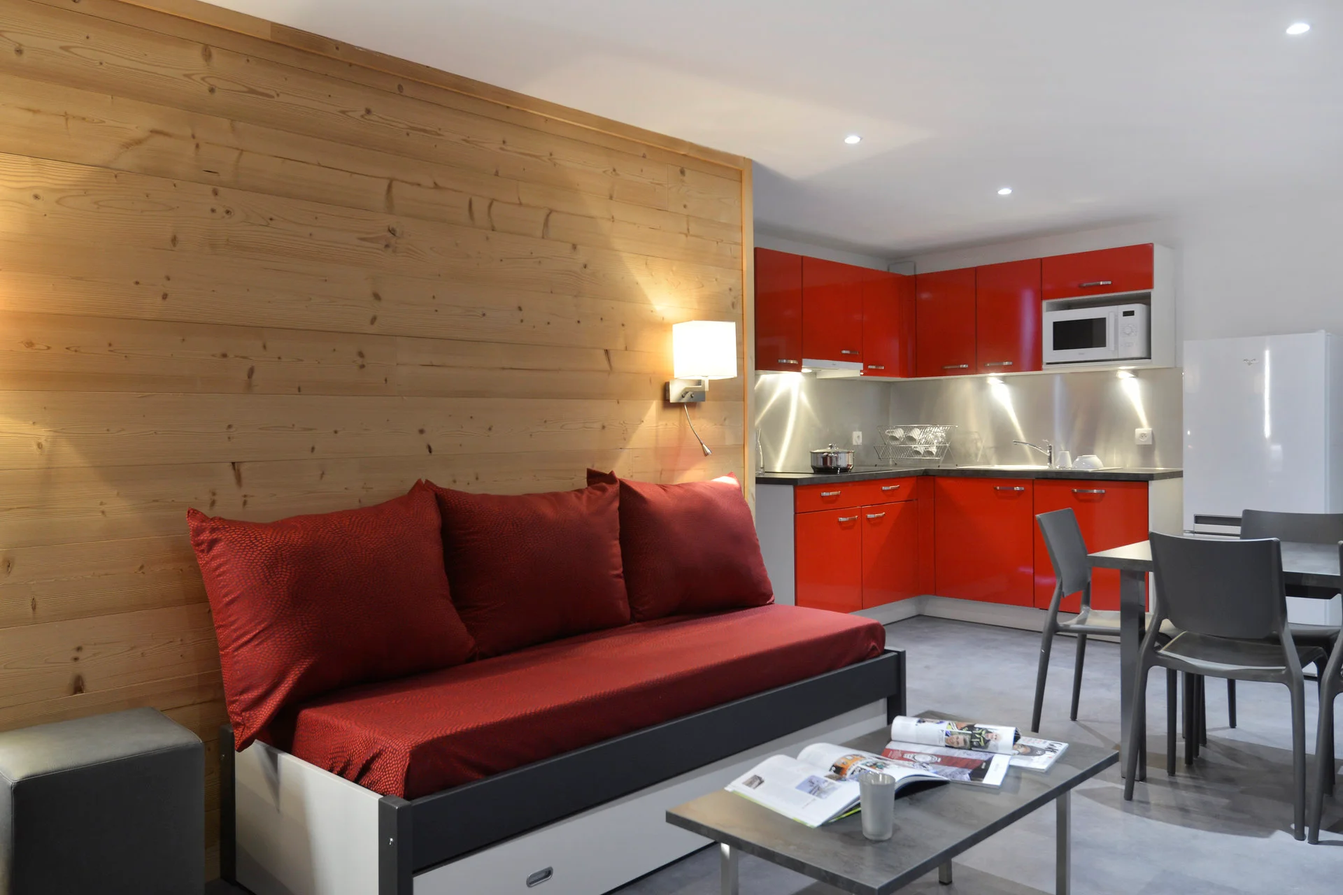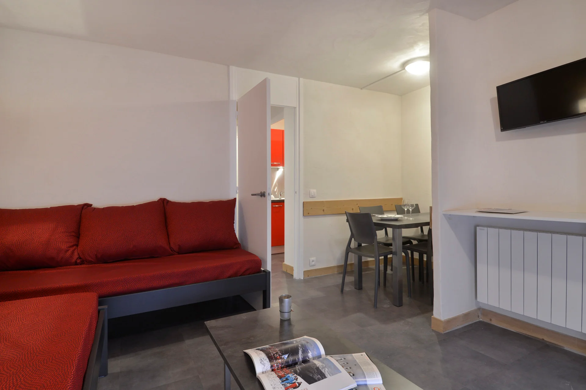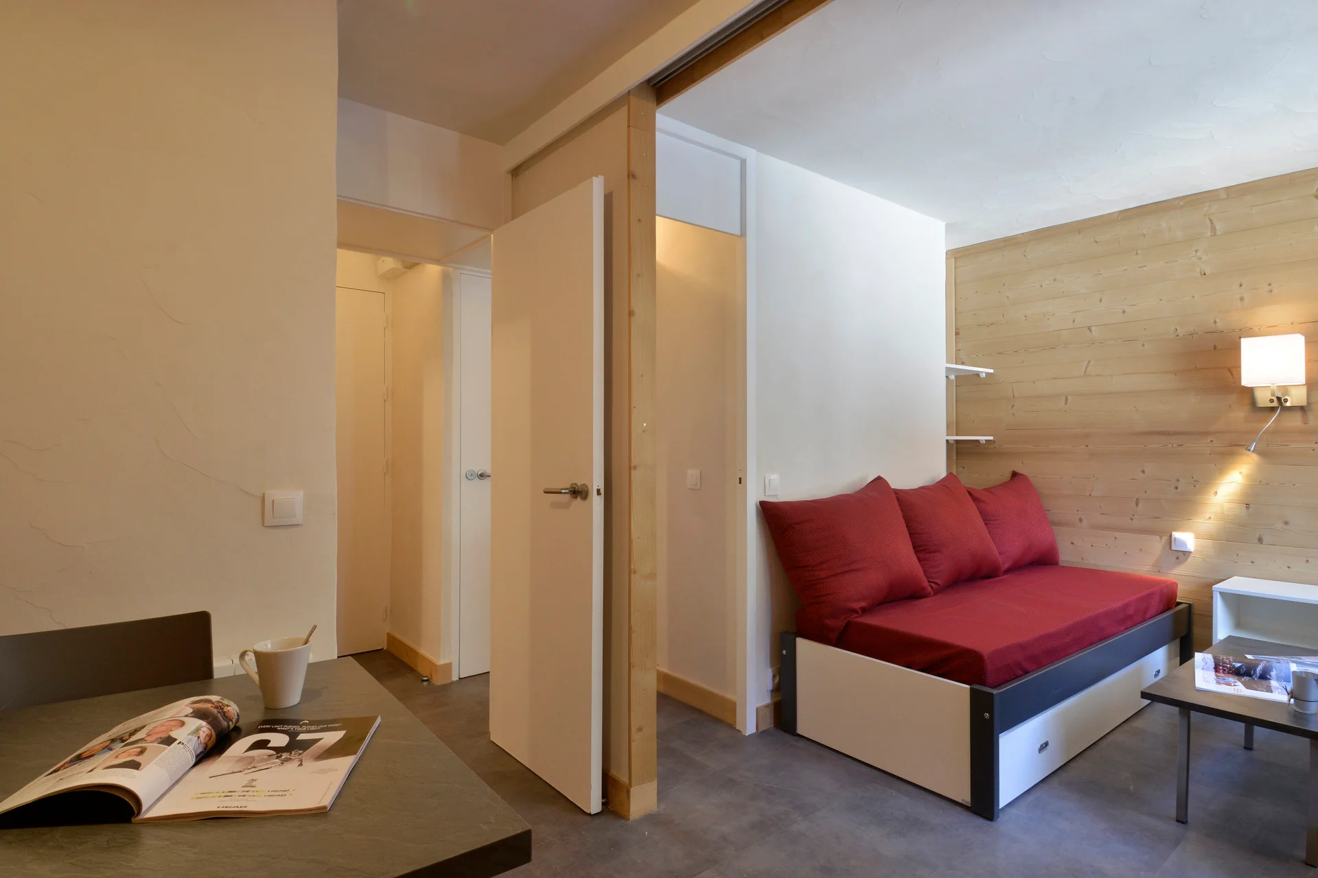 Dit is een compacte studio van 13 vierkante meter met één grote verblijfsruimte. De ruimte combineert woon- en slaapgedeelte in één kamer, voorzien van een eettafel met stoelen, een kast met laden en een zitgedeelte met een slaapbank voor twee personen.