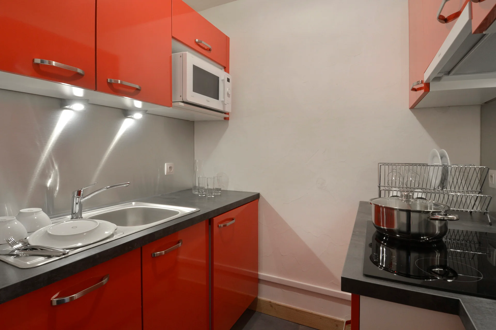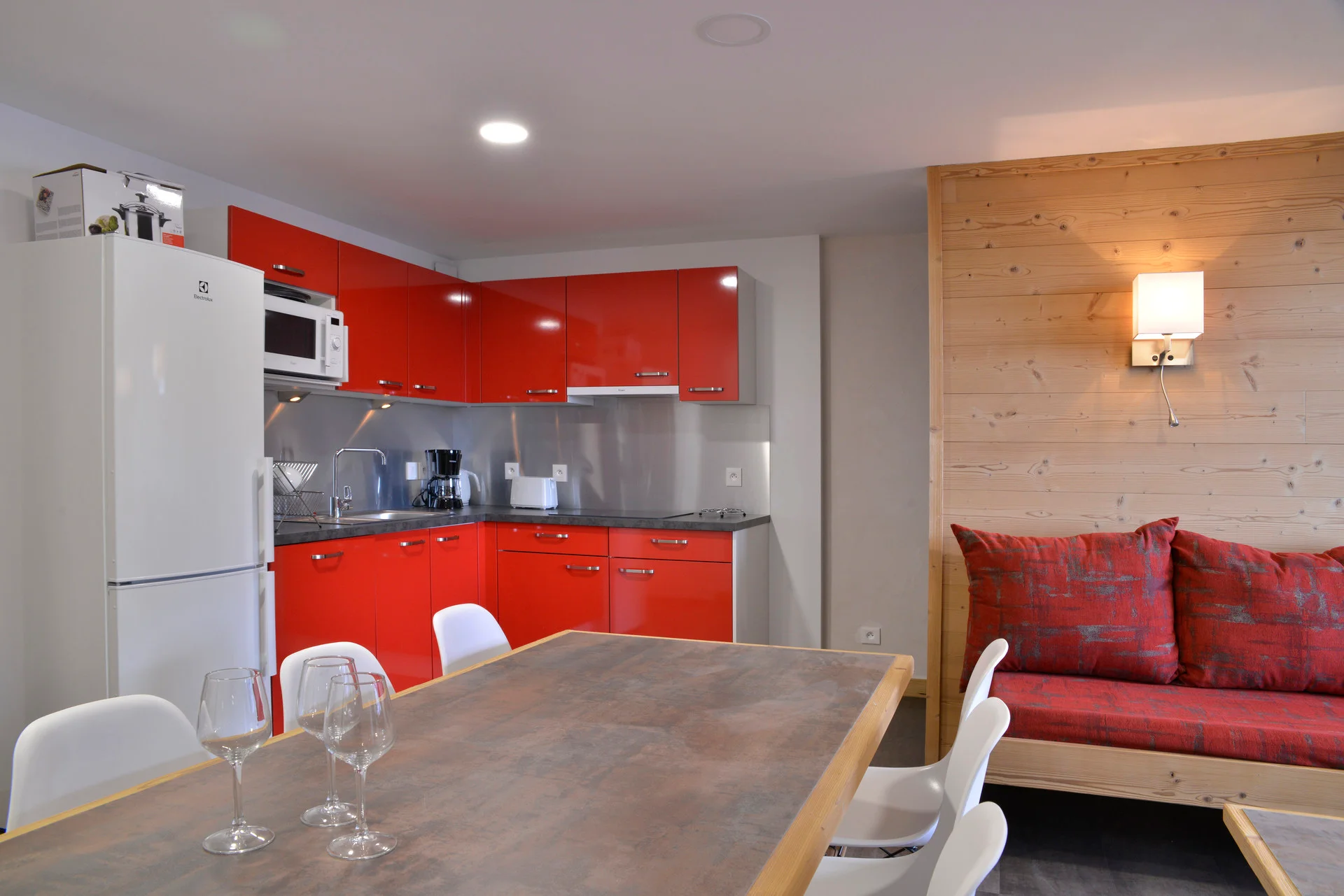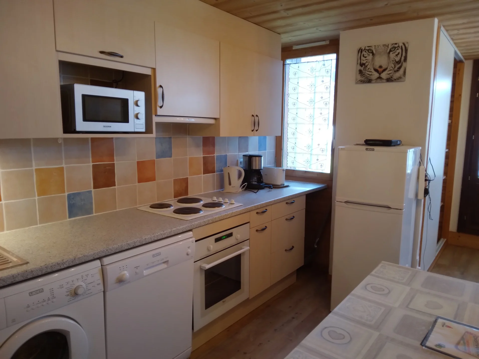 De keuken is volledig ingericht met alle nodige apparatuur en keukengerei: inductiekookplaat, magnetron, koelkast, oven, broodrooster, waterkoker, koffiezetapparaat, elektrische handmixer en diverse keukenhulpstukken. Aanwezig zijn zes borden, zes dessertborden, vier soepkommen, vier gewone kommen, vier glazen, vier wijnglazen, twee likeurglazen, vier thee- en koffiekopjes, bestek voor vier personen, broodmes, twee vleesmessen, paring-messen, groenteschaafje, flessenopener, kurkentrekker, fles- en doppenopener, twee houten lepels, spatel, soeplepel, garde, keukenspijker, saladeververs, citruspers, rasp, knoflookpers, kaasrasp, theezeef, zout- en peperset, twee maatglazen, onderzetters, afwasbak, deksel voor magnetron, twee Pyrex braadpannen met deksel, drie sauceerpannen met deksels, drie koekenpannen, crêpepan, drie snijplanken, vergiet, serveerschaal, saladeschaal en karaf.
