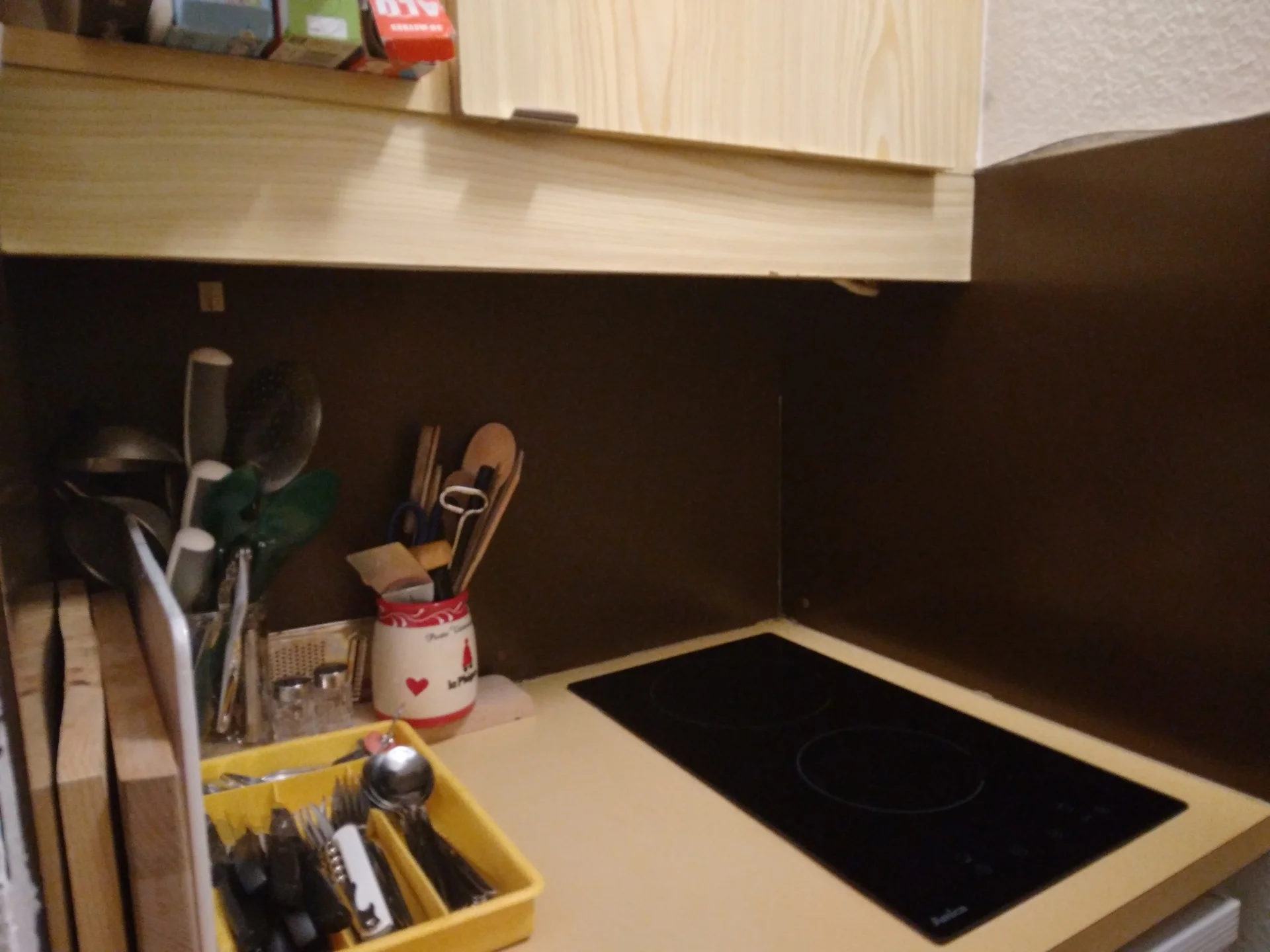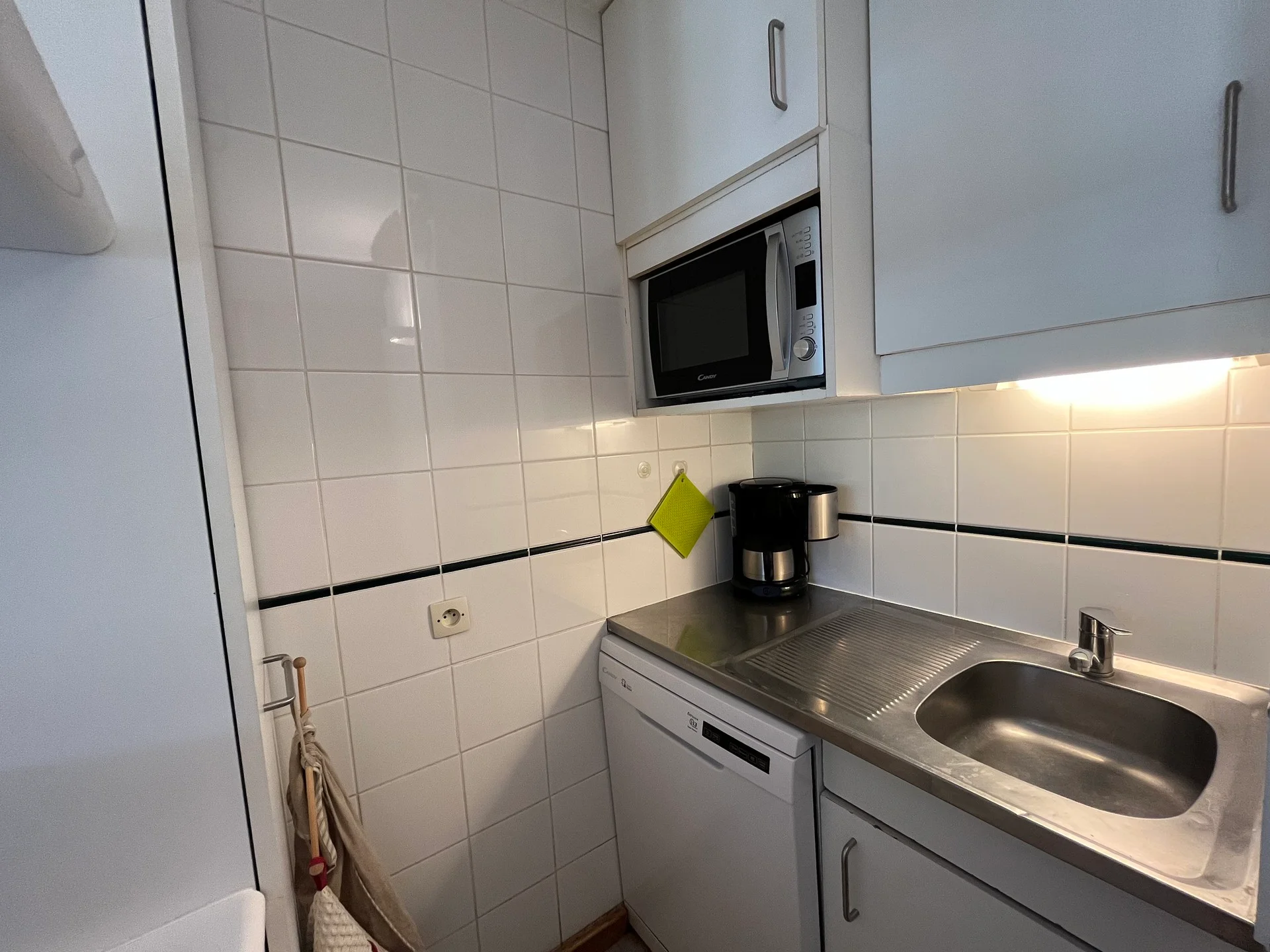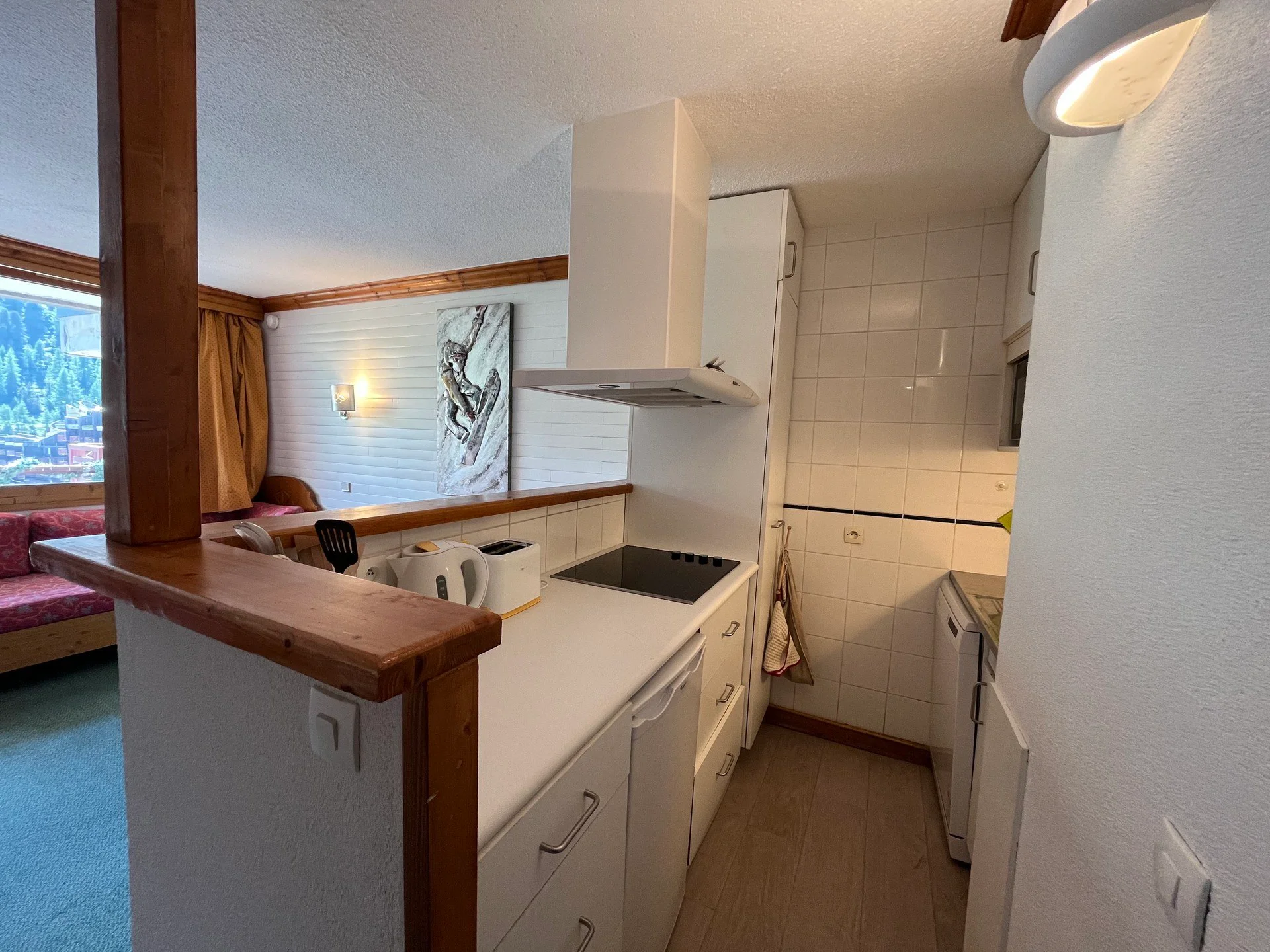 Het appartement beschikt over een volledig uitgeruste keuken met inductiekookplaat, oven, magnetron, koelkast, vaatwasser, waterkoker, broodrooster en koffiezetapparaat. Aanwezig zijn pannen, wokpan, sauteerpan, crêpepan, deksel, microwave-rek en microwave-cloche. De serviesset omvat borden, schaaltjes, kopjes, theekopjes, glazen en bestek voor 15 personen. Verder zijn er aanwezig: verschillende messen, snijplanken, rasp, zeeuw, vergiet, sla-centrifuge, fondue-set met vorken, sinaasappelpers, elektrische citruspers, flessenopener, kurkentrekker, flesopener, houten lepels, spatel, garde, pollepel, schuimspaan, blikopener, nootmuskraatkraker, kaasschaaf, maatglas, deegroller voor groenten, deegroller voor kaas, broodkorveninzet, tafelmatjes, broodbox en emmer.