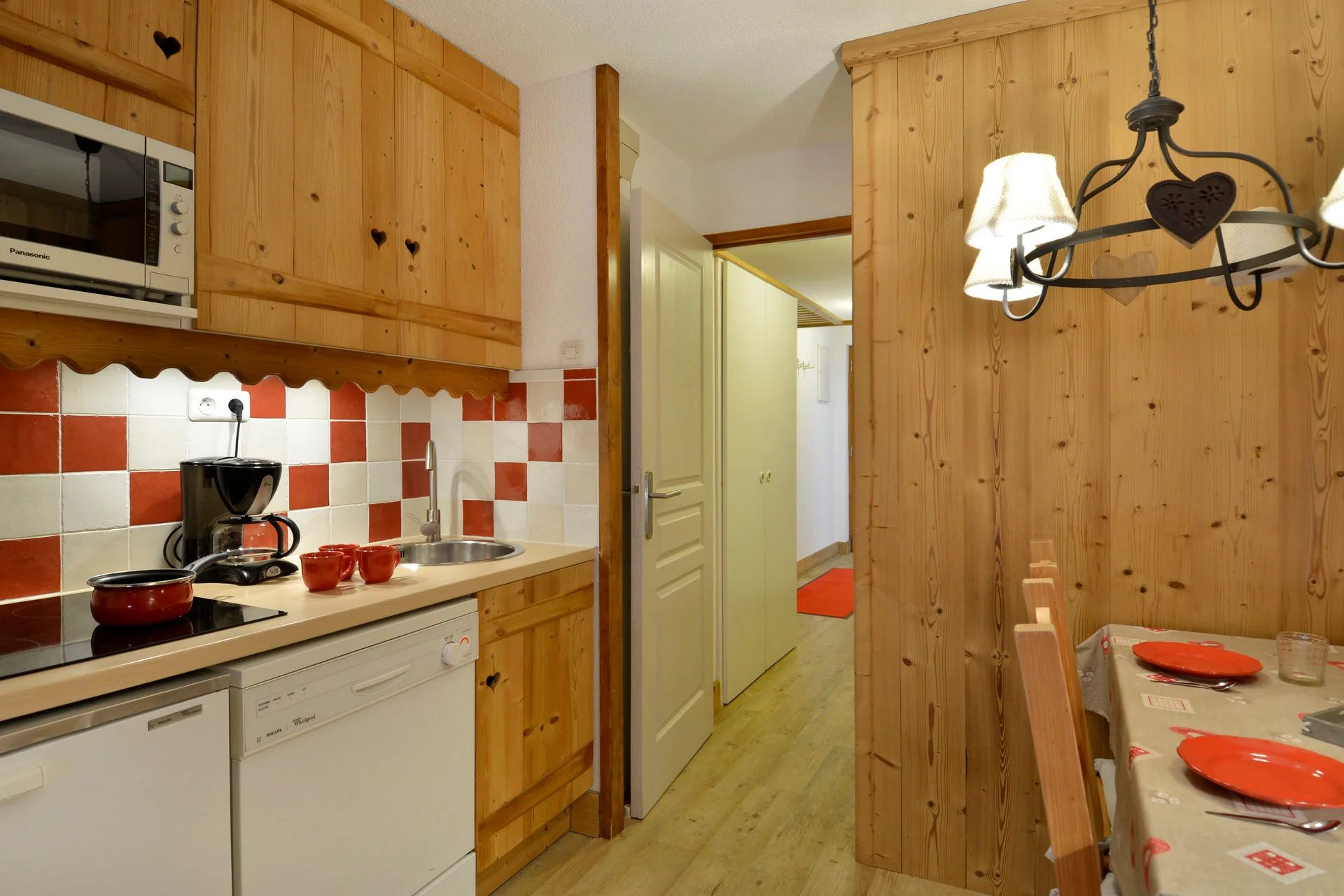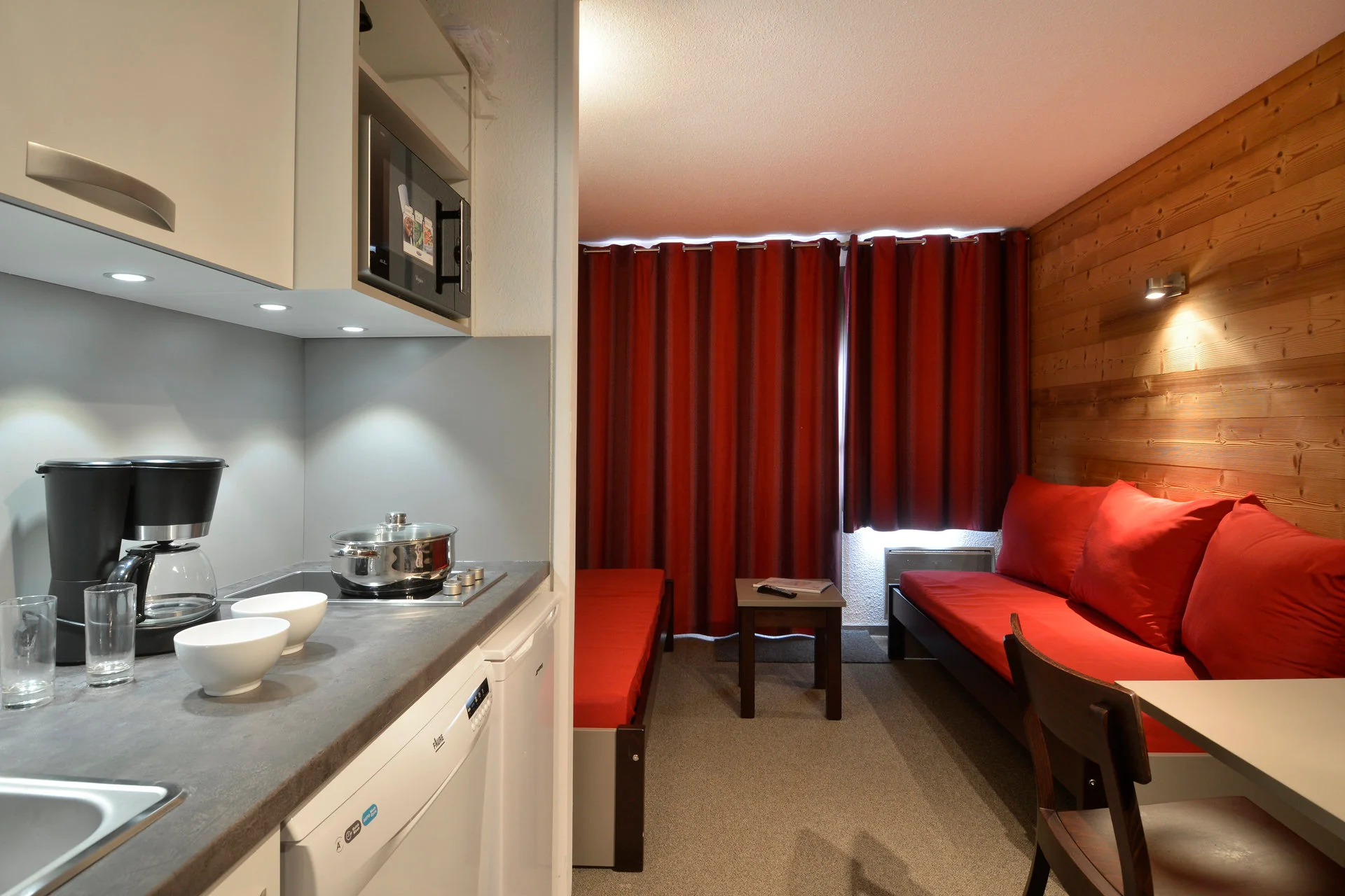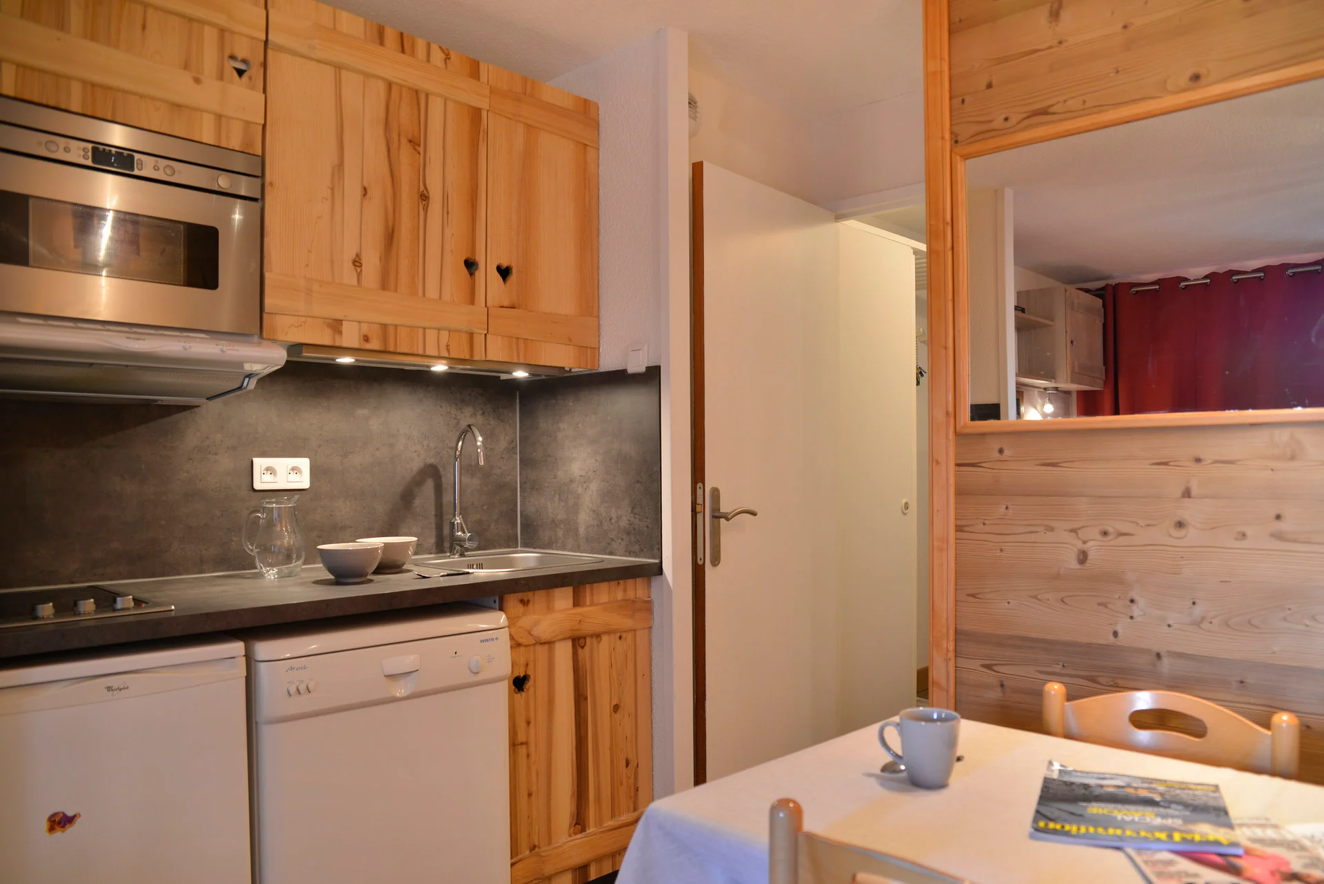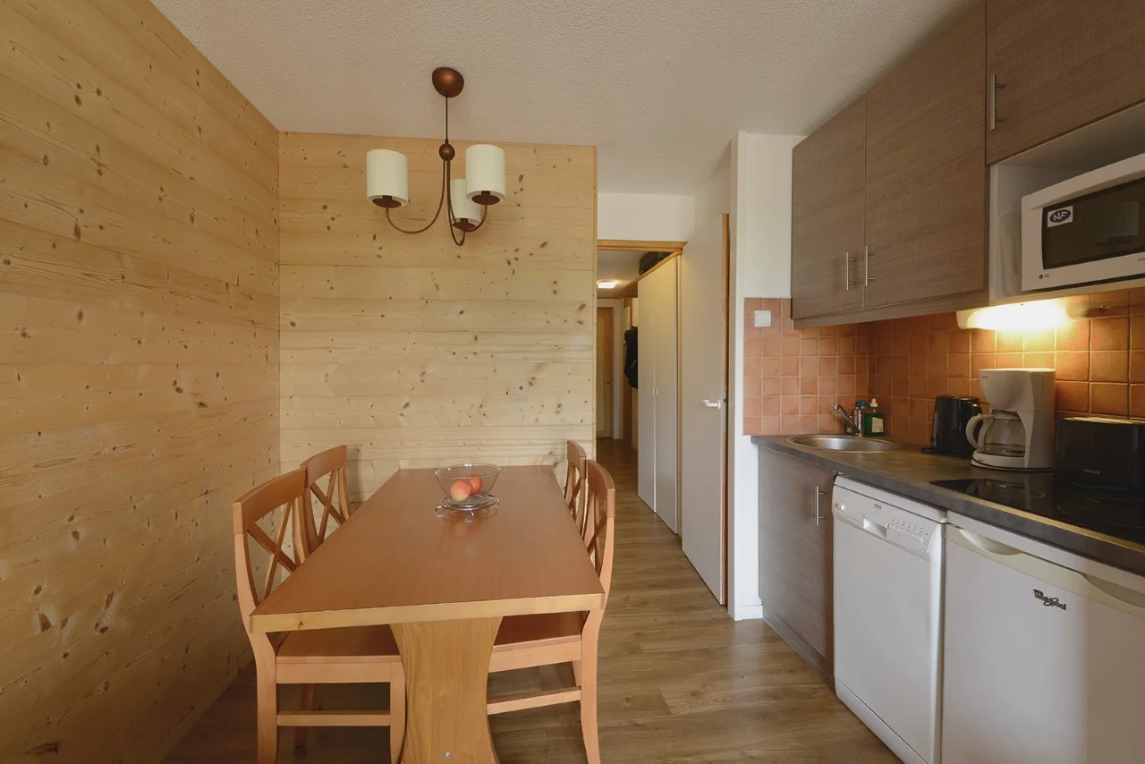 Volledig uitgerust met elektrisch koffiezetapparaat, waterkoker, broodrooster, magnetron, vaatwasser en fornuis. Beschikbare keukenbenodigdheden zijn onder meer serviesset, bestek, glazen, kopjes, schalen, pannen, koekenpan, crêpepan, fooiiërende pannen, broodmes, groentemes, ontbitmes, groenteschaafmes, blikopener, kurkentrekker, notenkraker, ijsschep, houten lepels, spatel, garde, soeplepel, slacentrifuge, snijplanken, waterkan en broodmand.