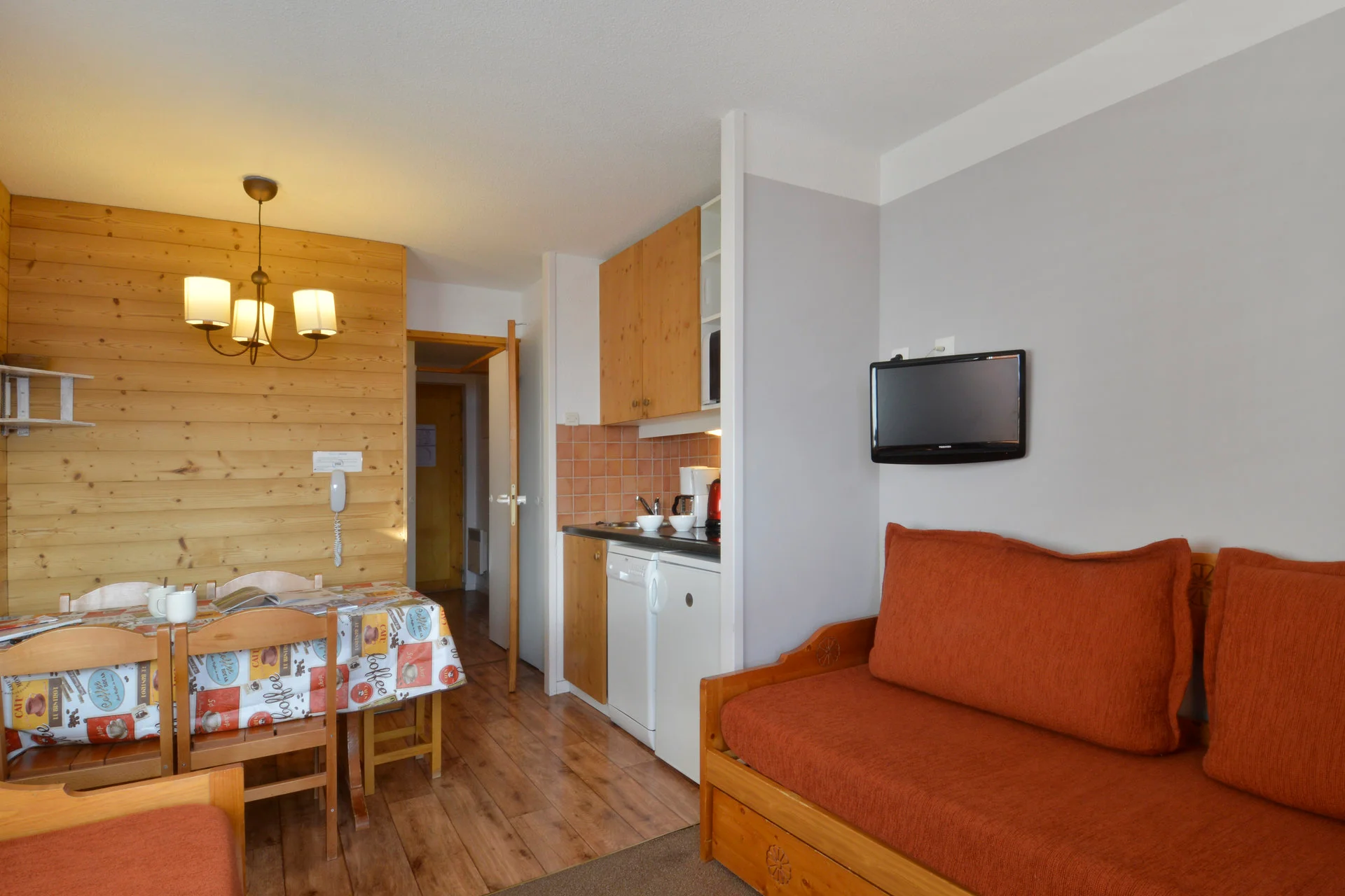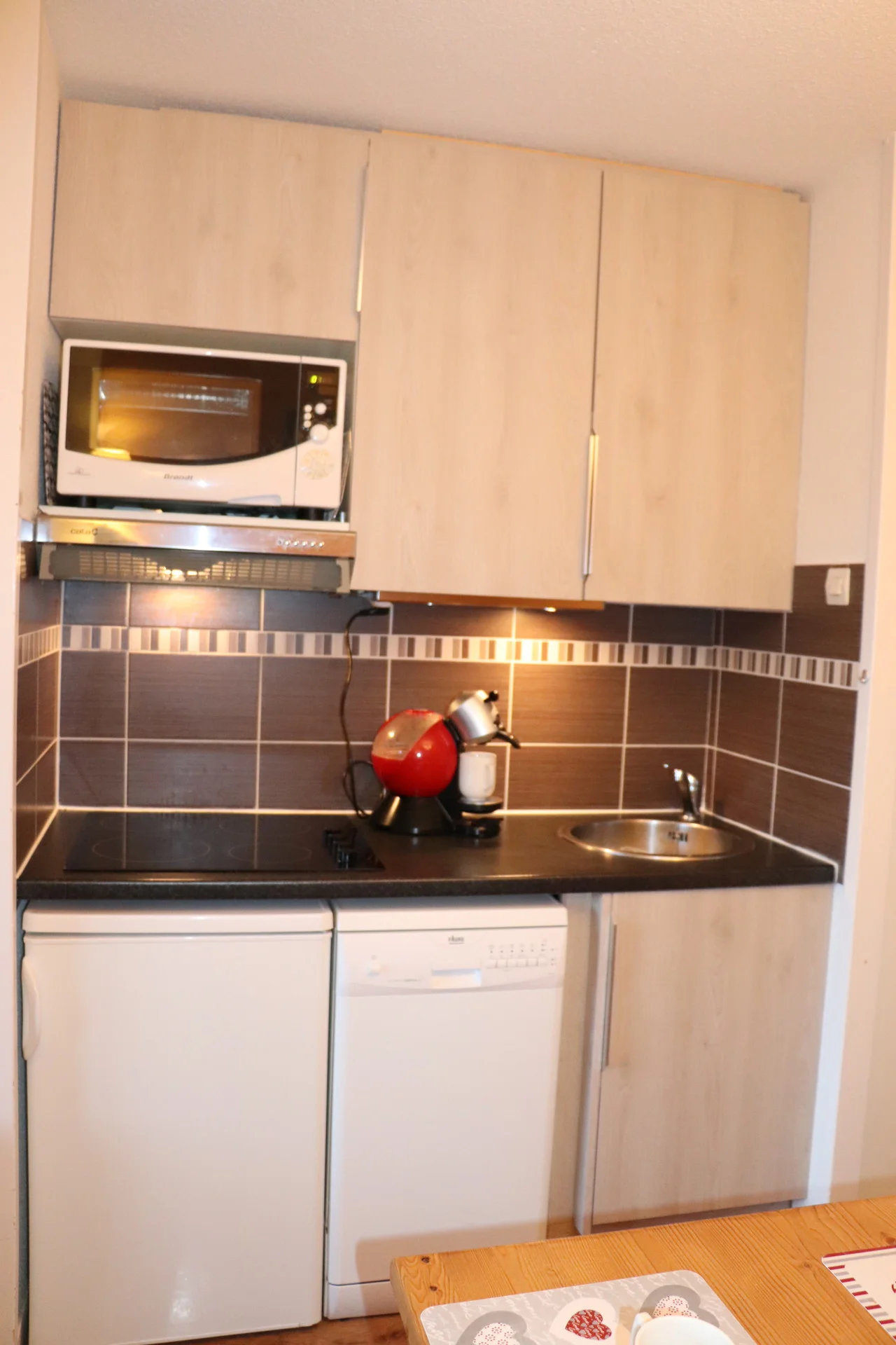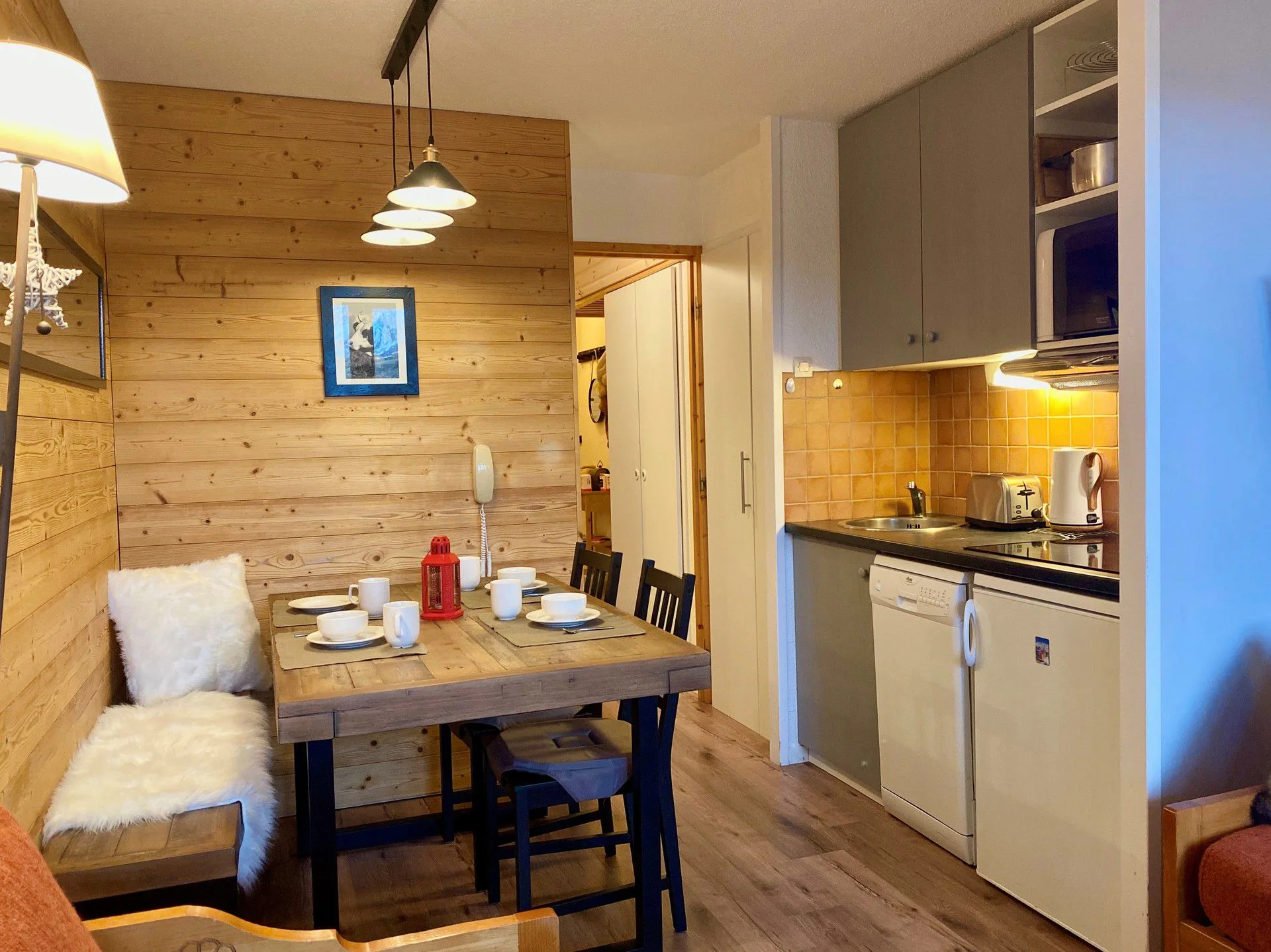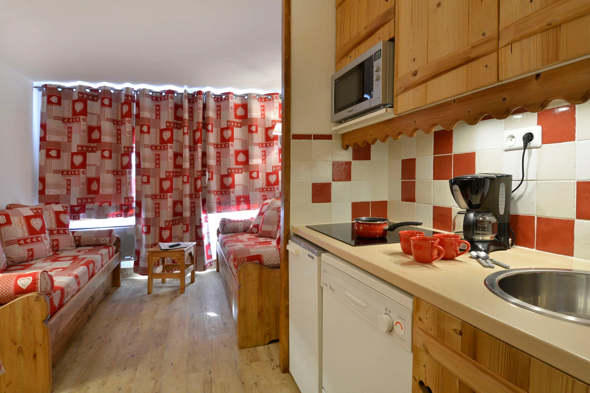 Volledig uitgerust met elektrisch koffiezetapparaat, waterkoker, broodrooster, magnetron, vaatwasser en fornuis. Beschikbare keukenbenodigdheden zijn onder meer serviesset, bestek, glazen, kopjes, schalen, pannen, koekenpan, crêpepan, fooiiërende pannen, broodmes, groentemes, ontbitmes, groenteschaafmes, blikopener, kurkentrekker, notenkraker, ijsschep, houten lepels, spatel, garde, soeplepel, slacentrifuge, snijplanken, waterkan en broodmand.