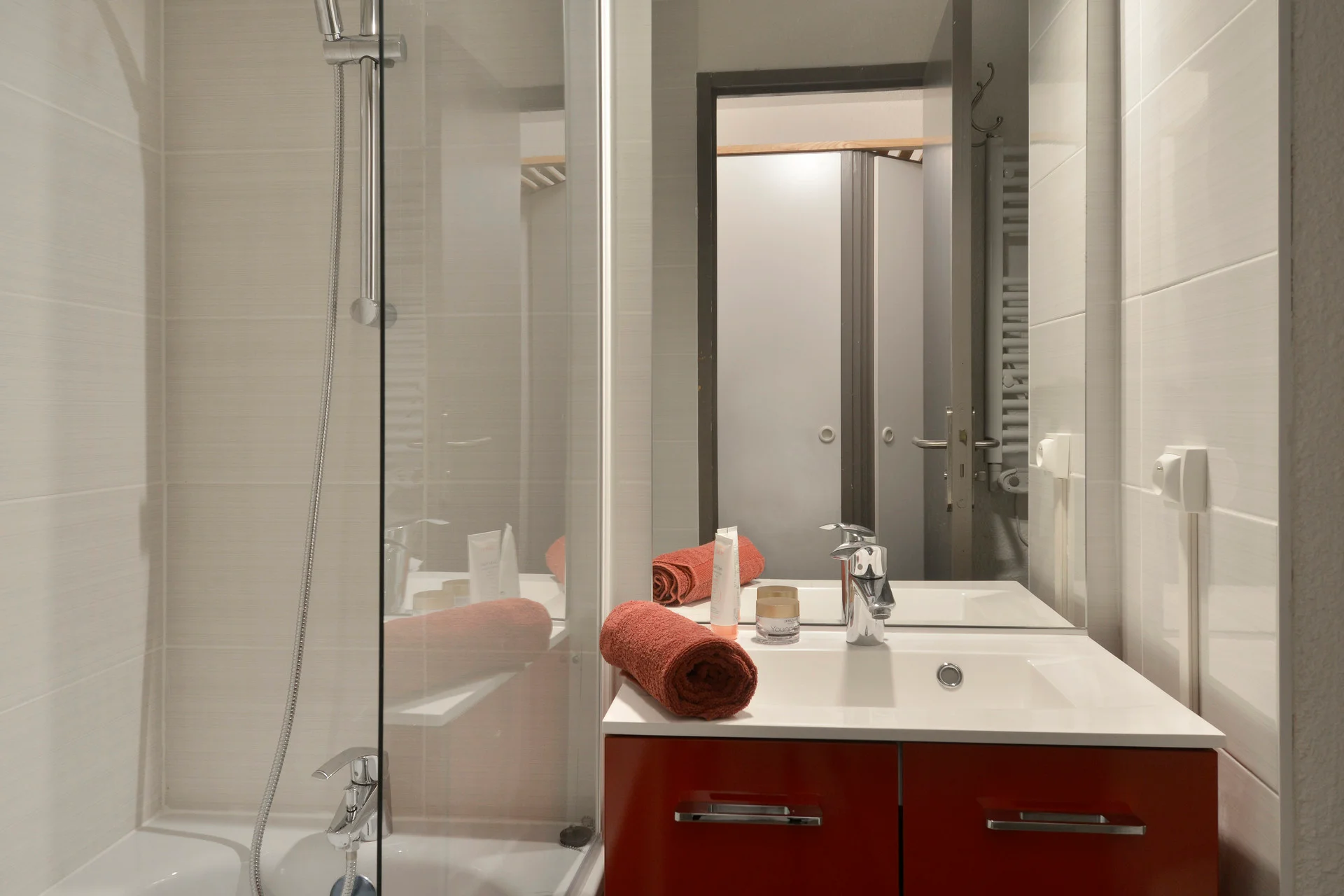 2 badkamers met toilet, elk voorzien van wastafels, handdoekradiator, spiegels en handdoekrekken.