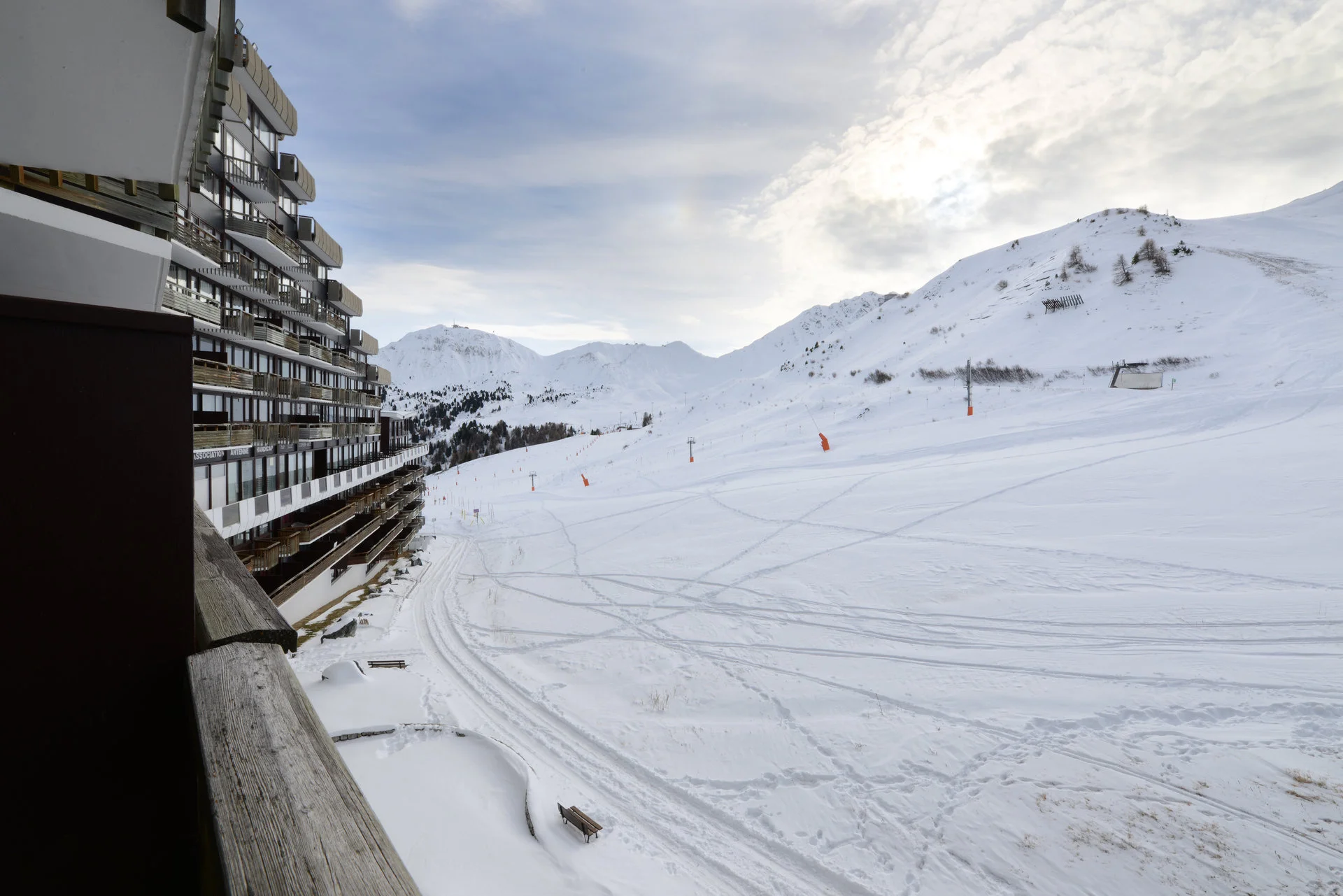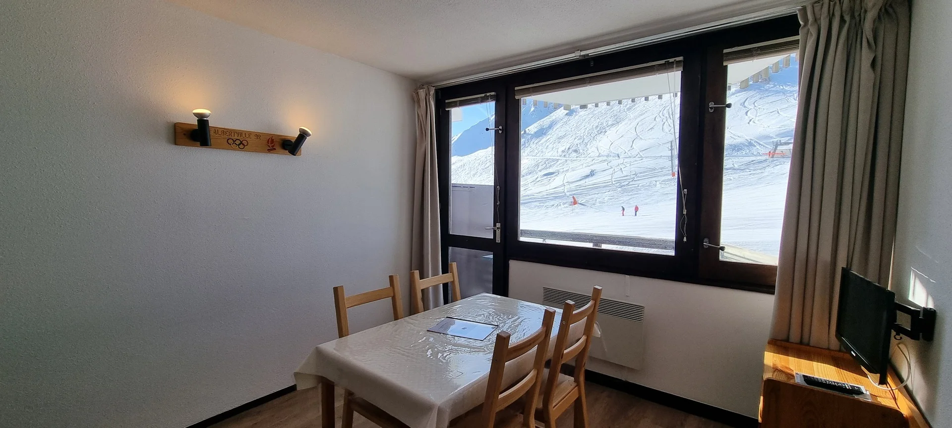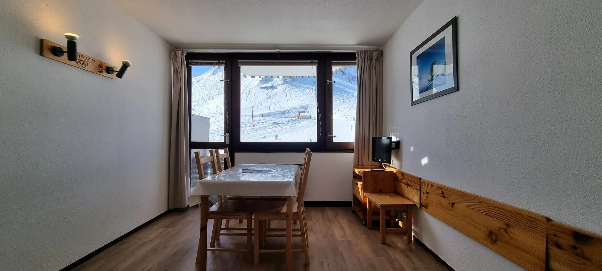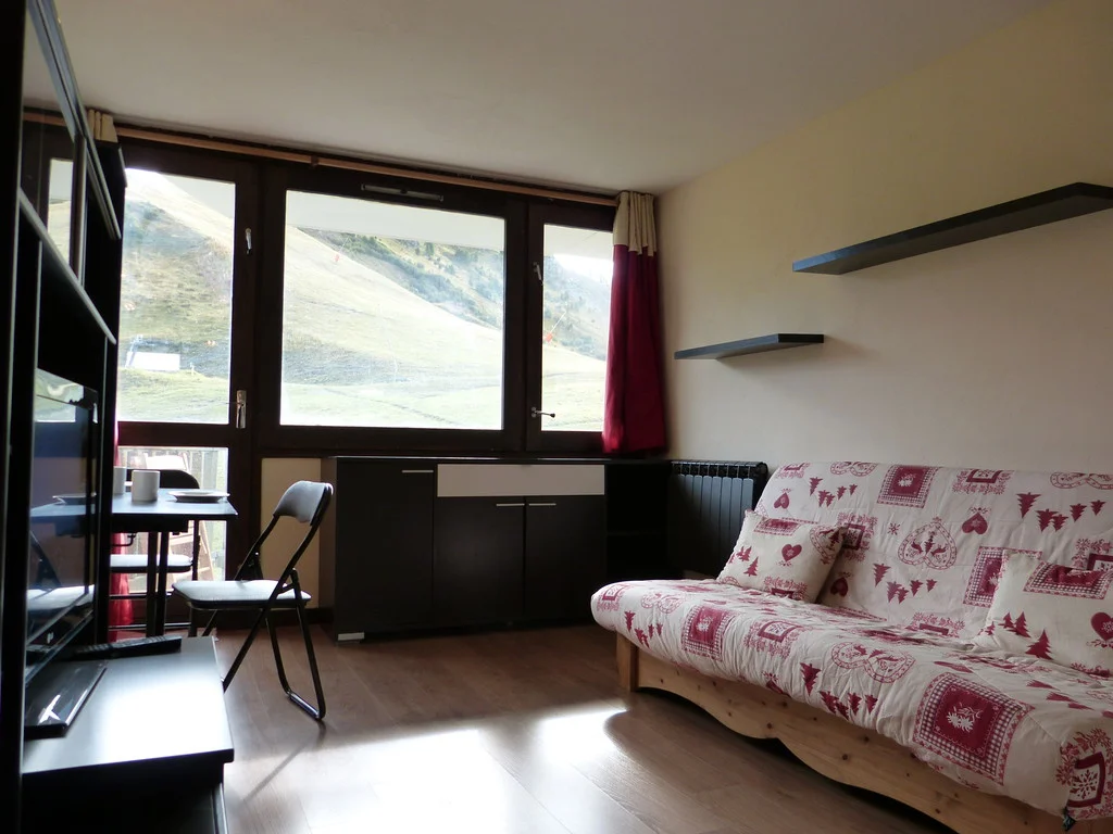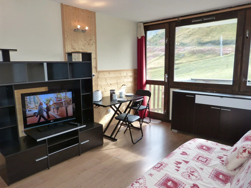 Ingang via AIME 2000, verdieping H, deur 33. De studio ligt dicht bij de pistes en heeft een balkon aan de zuidzijde. Het balkon is voorzien van buitenstoelen en een tafel.
