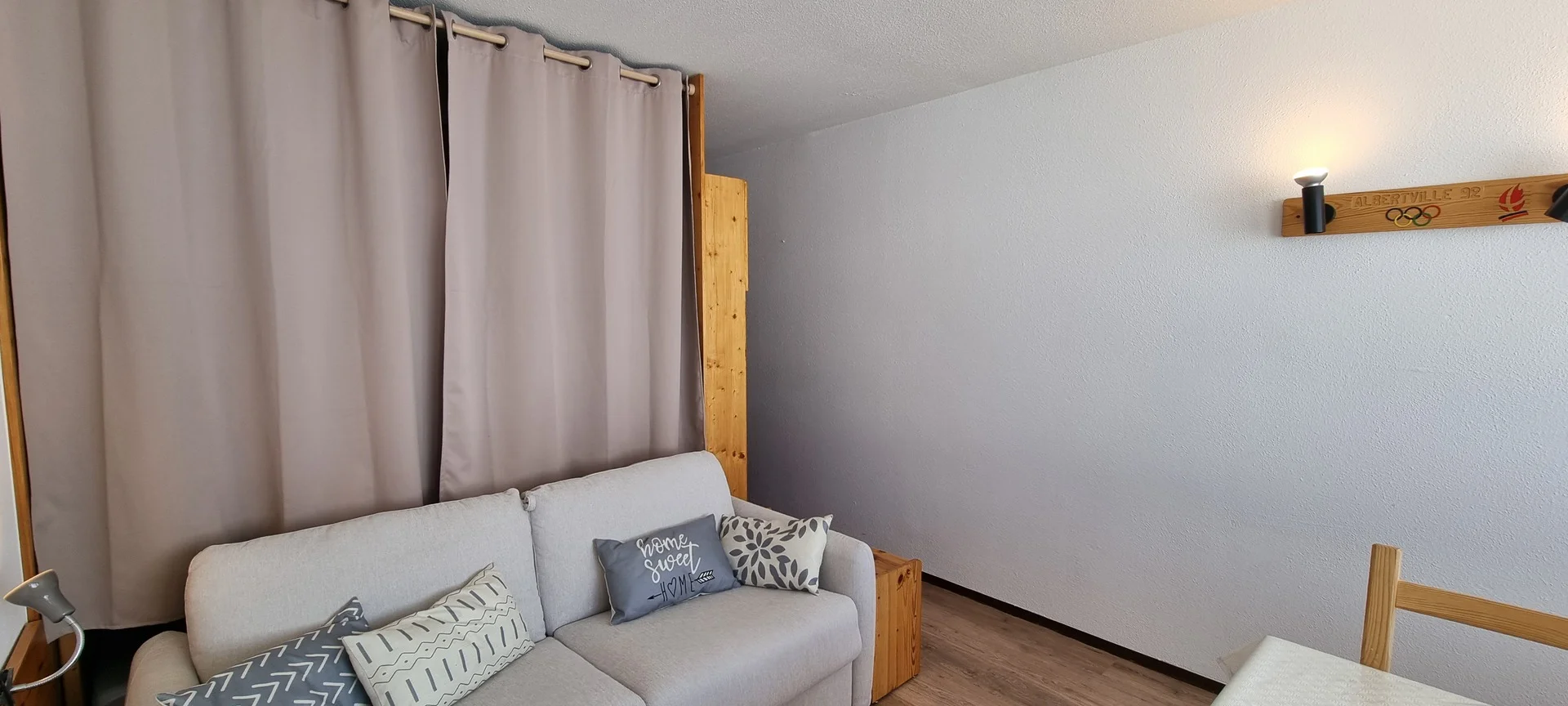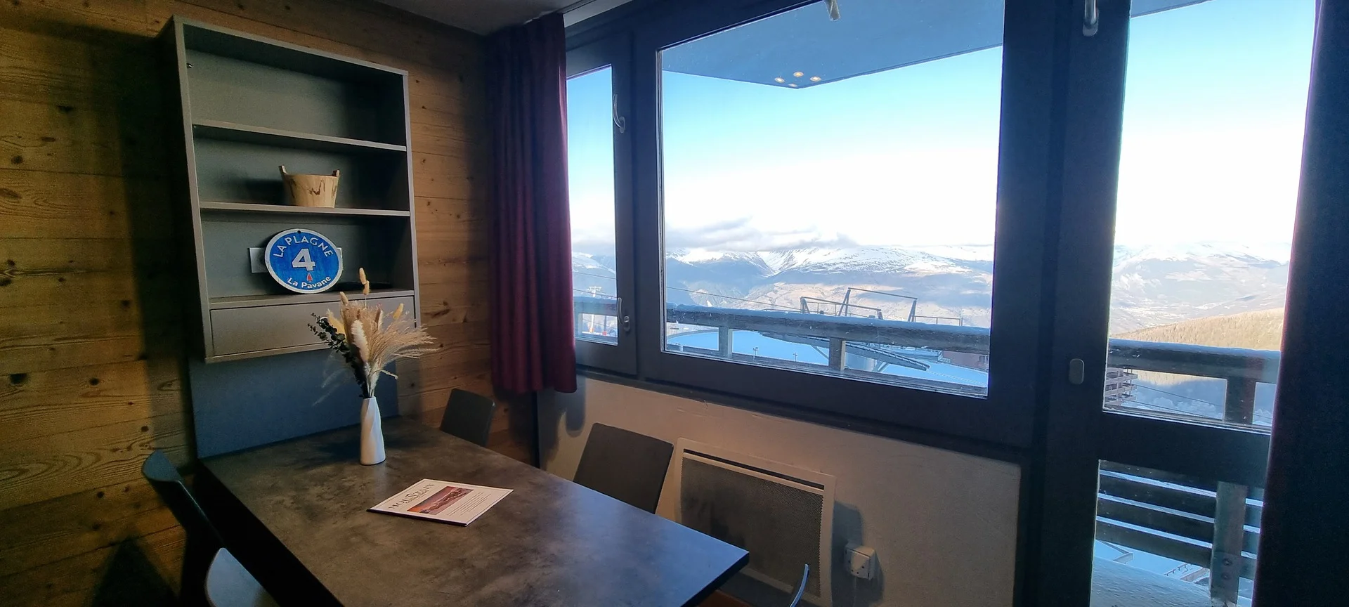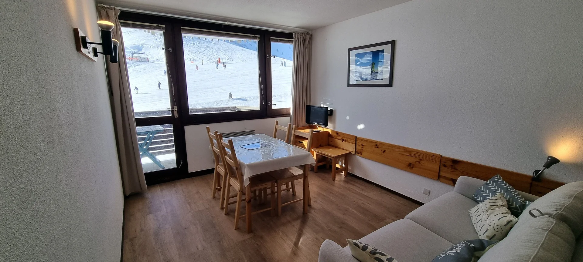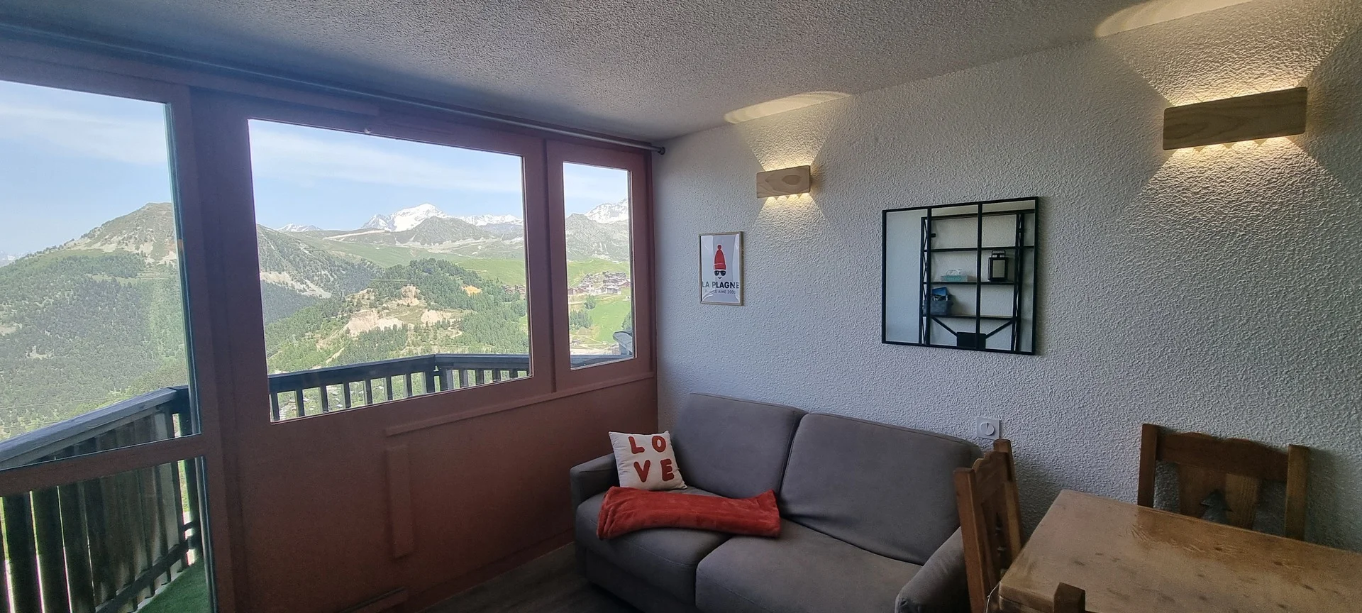 Ingang via AIME 2000, verdieping H, deur 33. De studio ligt dicht bij de pistes en heeft een balkon aan de zuidzijde. Het balkon is voorzien van buitenstoelen en een tafel.
