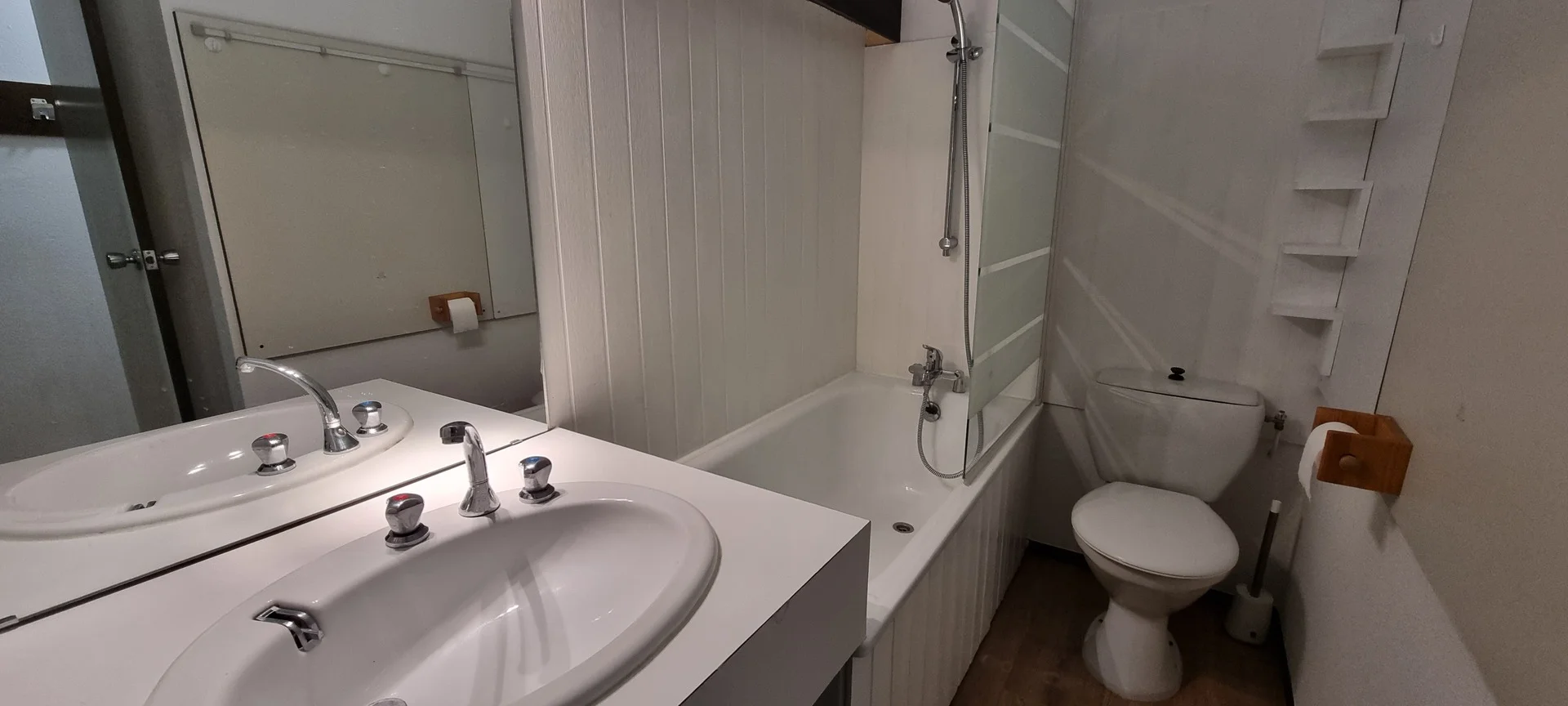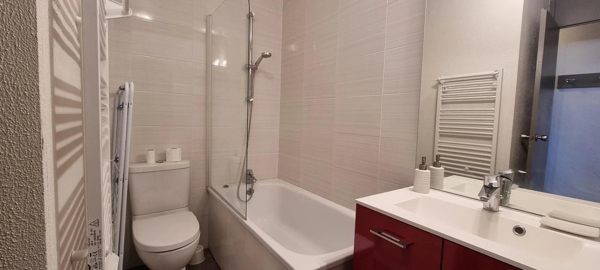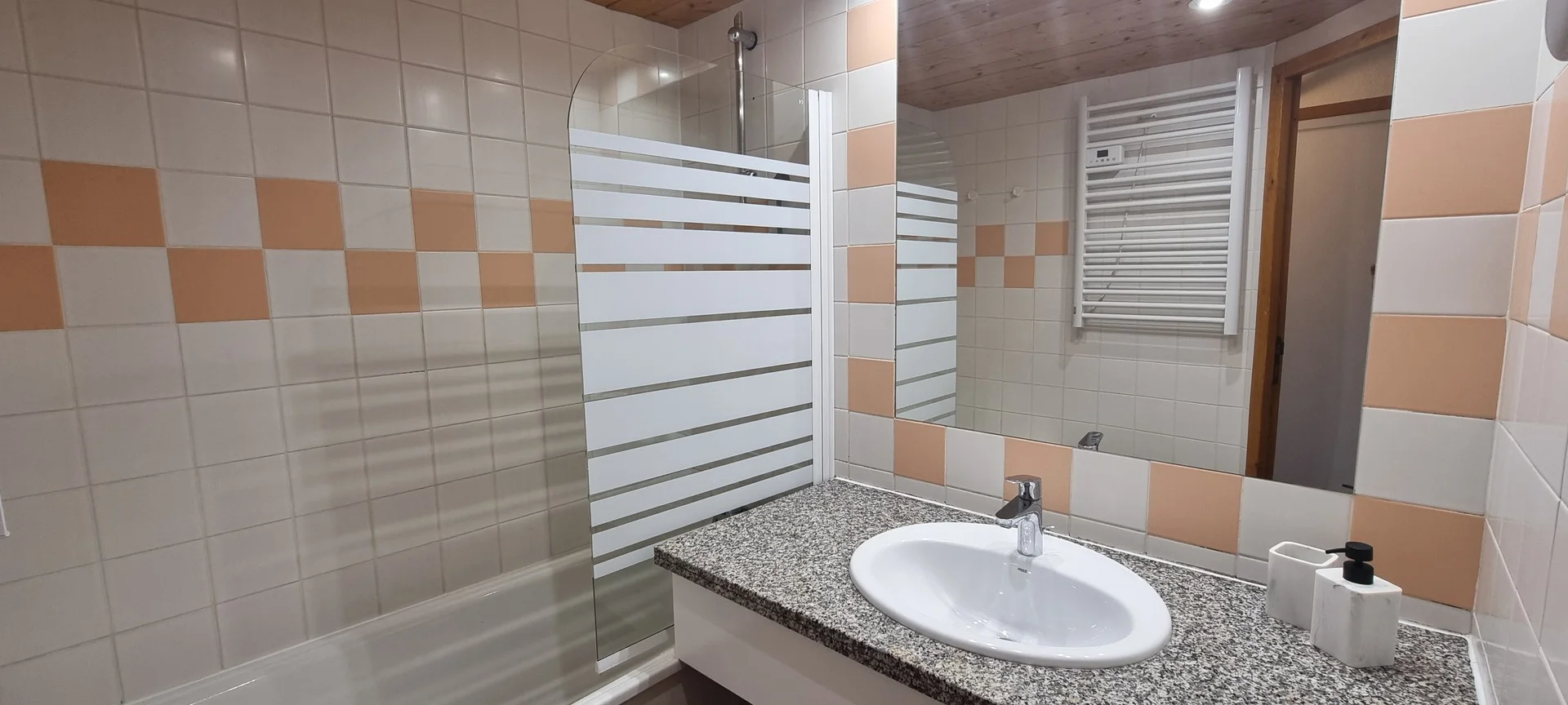 Badkamer met badkuip, wastafel, douchewand en handdoekradiator. Apart toilet.