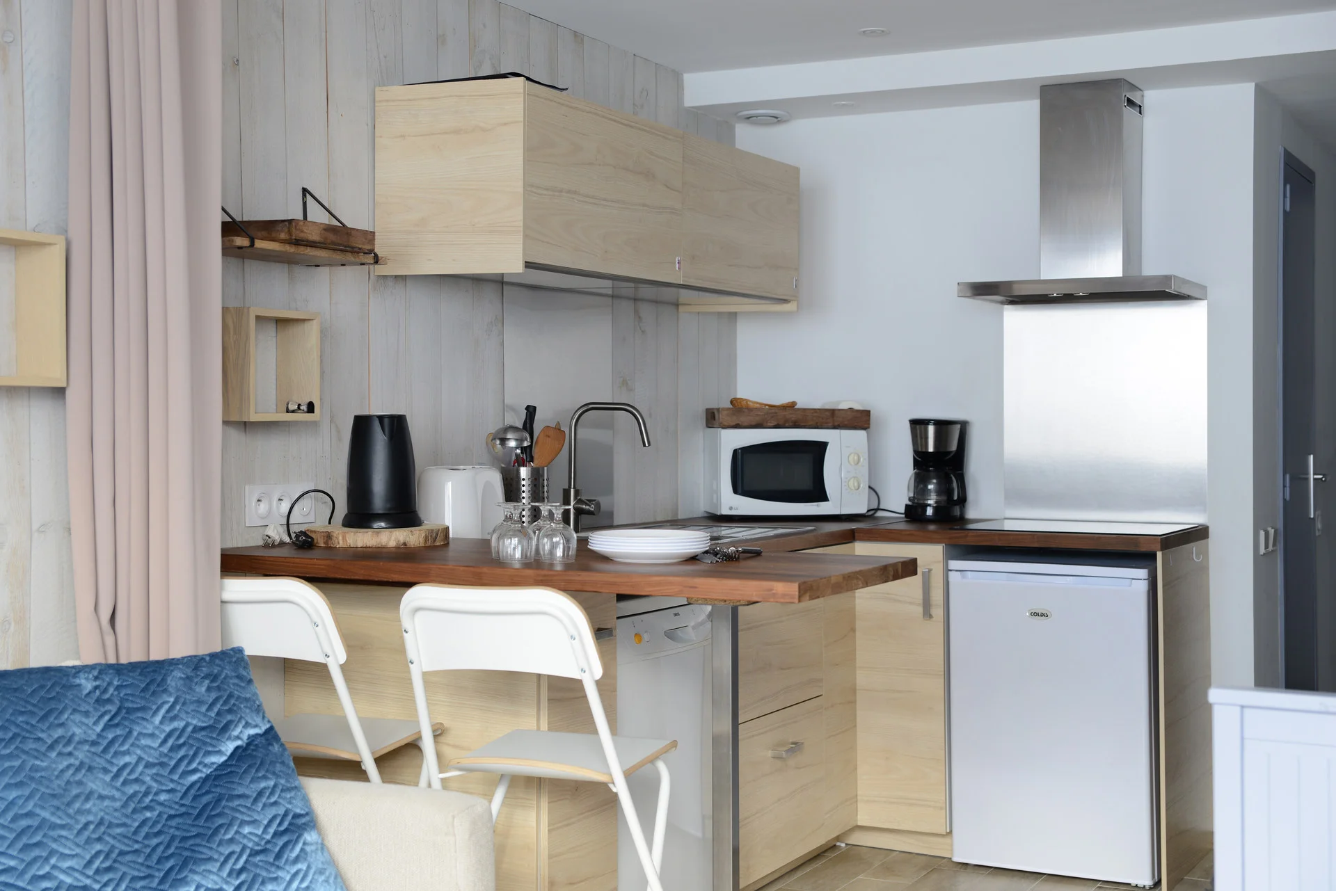 De keuken is voorzien van een inductiekookplaat, koelkast, vaatwasser, magnetron, oven (onder de inductiekookplaat), broodrooster, waterkoker, elektrisch fondue-apparaat, raclette-/pierradepan, sinaasappelpers, elektrische sinaasappelpers, mes- en bestek set, diverse pannen, sauteerpan, keukenbenodigdheden, borden, schalen, glazen, mokken, theepotten en alle nodige keukengereedschappen.