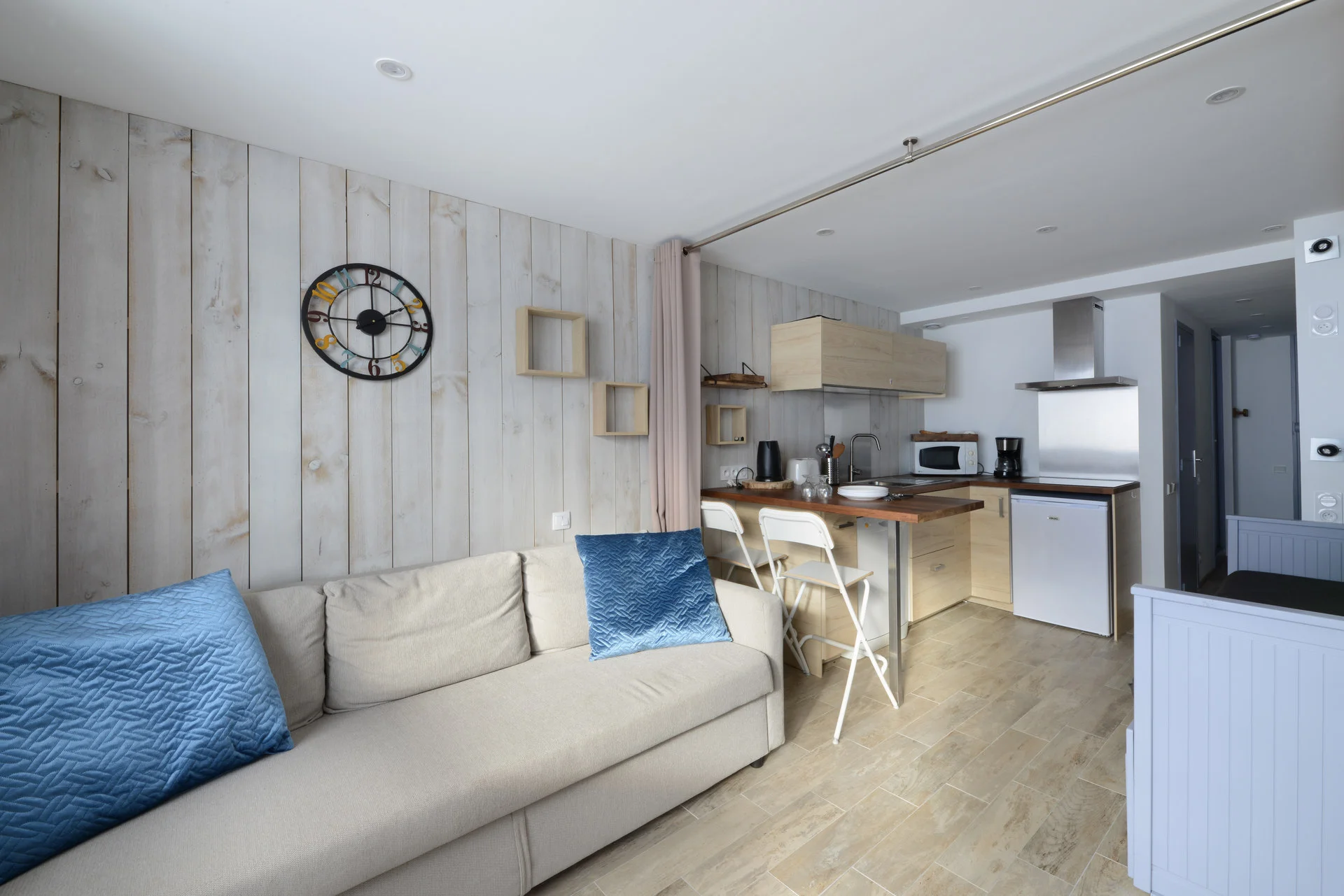 Dit is een studio voor 4 personen met veel flexibiliteit. De ruimte is onderverdeeld in een slaap- en woongedeelte. De woonkamer beschikt over een slaapbank en barkrukken. De keuken is compact maar compleet uitgerust en aangrenzend aan de leefruimte. De studio heeft een balkon met uitzicht naar het zuiden.