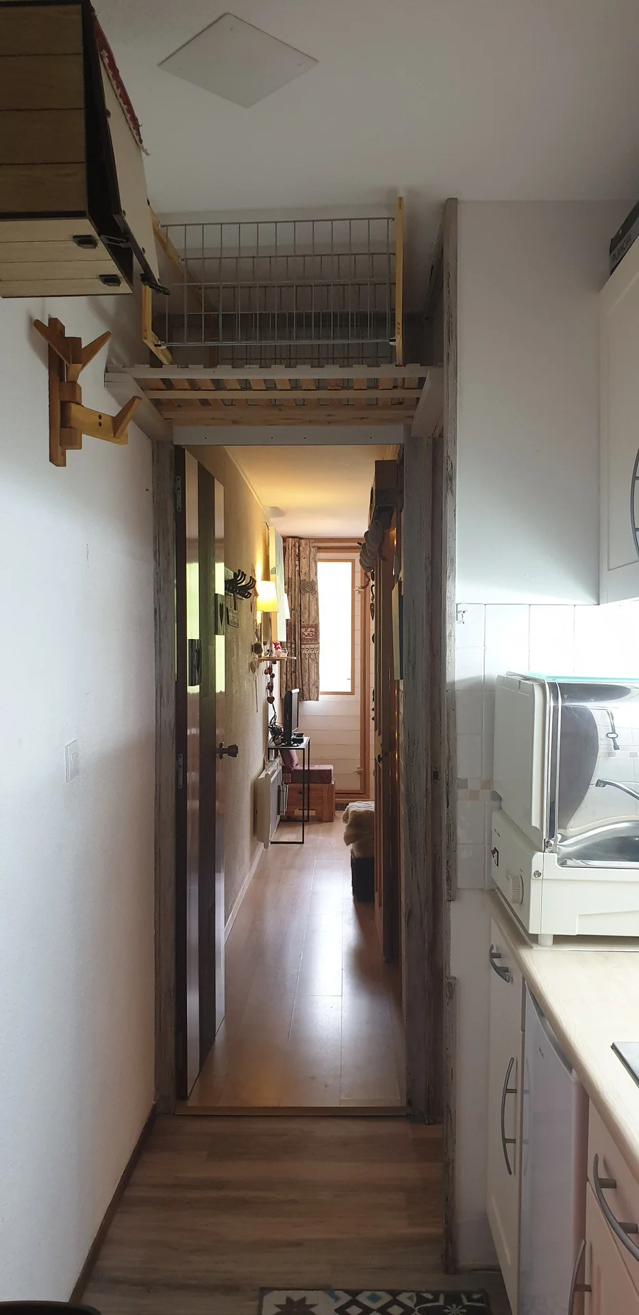 Dit is een compacte studio met alle voorzieningen op één niveau. De ruimte is ingericht als combinatie woonkamer en slaapgedeelte, gescheiden door een gordijn. Het appartement beschikt over een balkon met zuidoriëntatie.