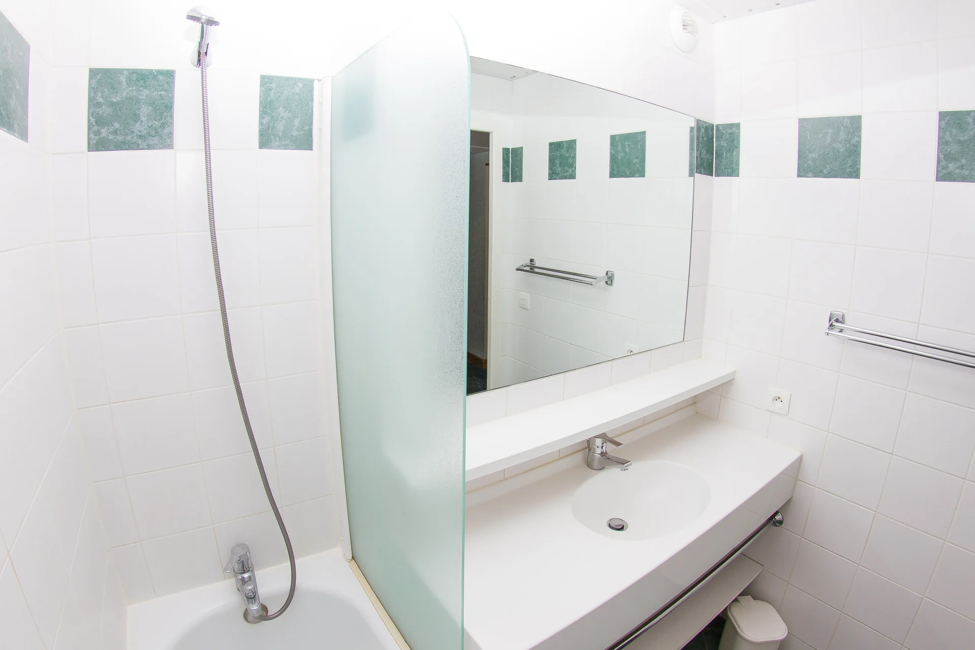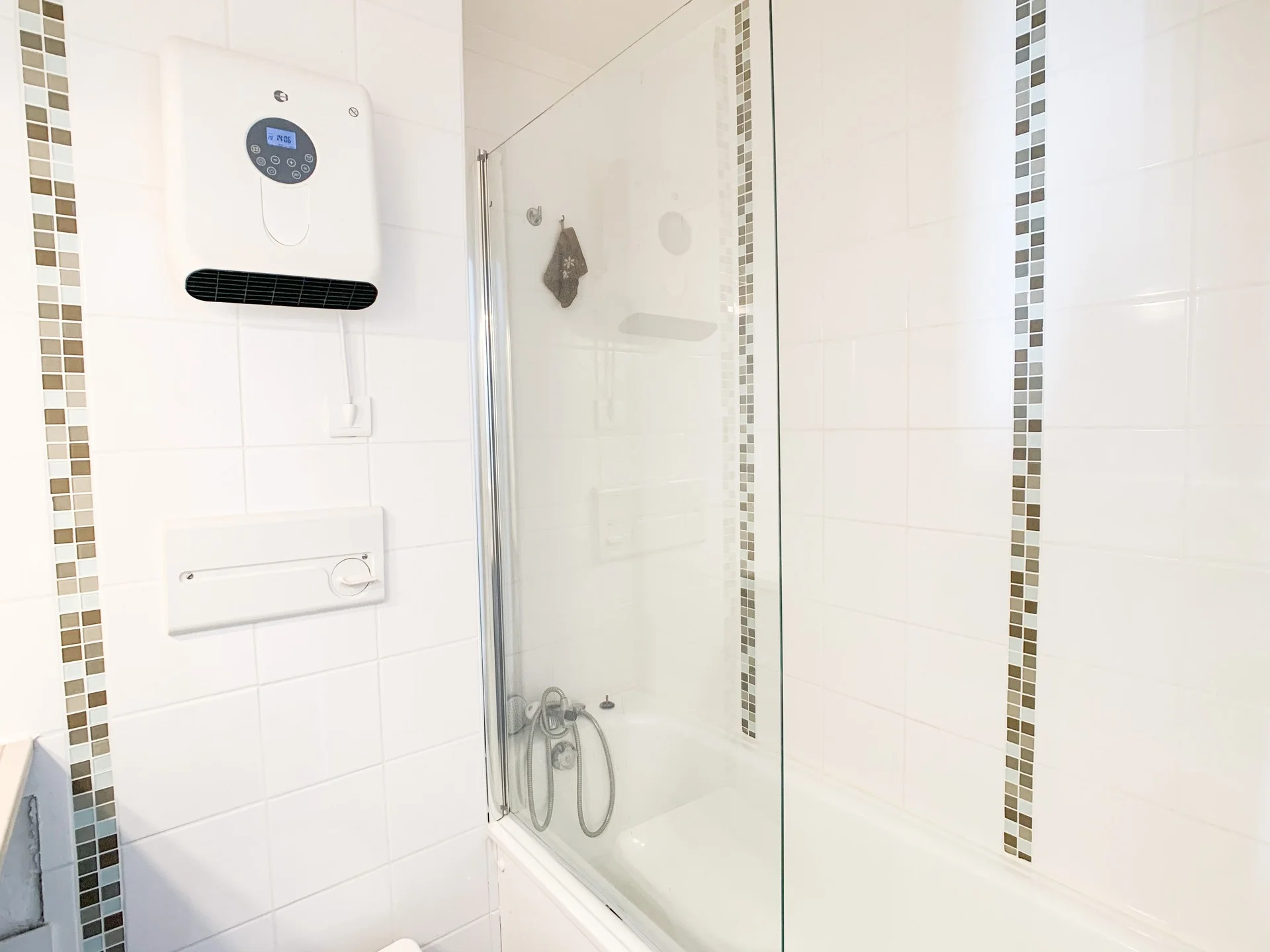 Badkamer met douchebad, handdoeken en föhn aanwezig. Apart toilet.