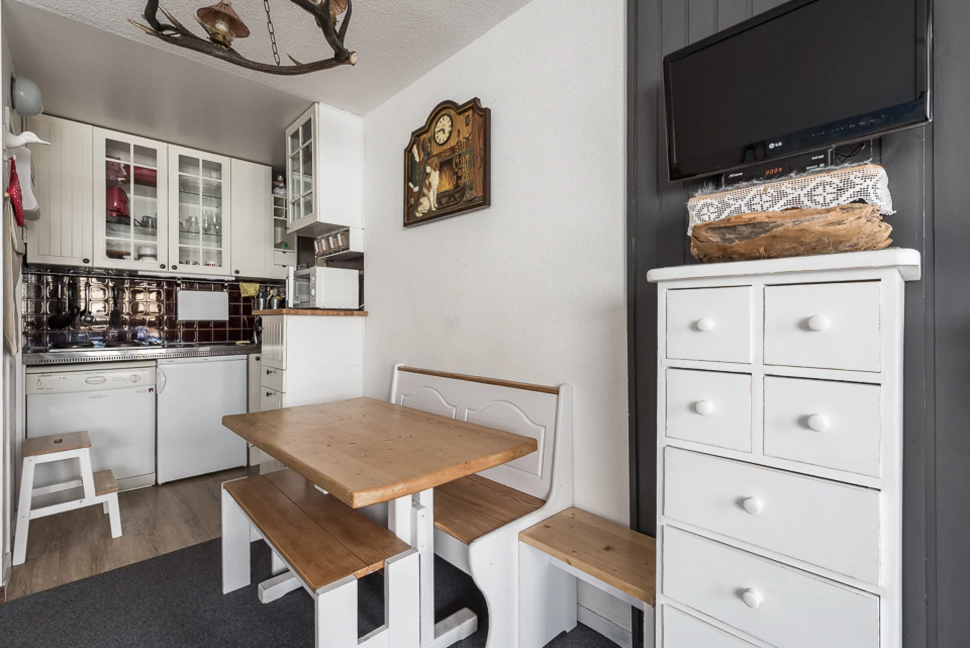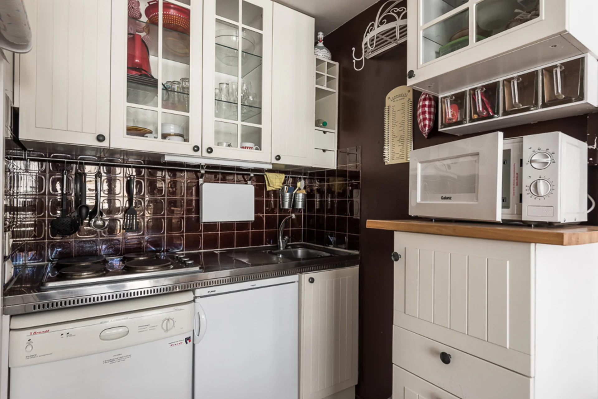 Inductiekookplaat (3 pitten), koelkast, vaatwasser, magnetron, Senseo-apparaat, waterkoker, broodrooster, elektrisch fondue-apparaat, croque-monsieur-apparaat, wafelijzer, mini-keukenmachine en mengstaaf. Servies, bestek, pannen, kasserollen, saladeslinger, flessenopener, schaar, keukengerei, snijplanken en overige keukenbenodigdheden aanwezig.