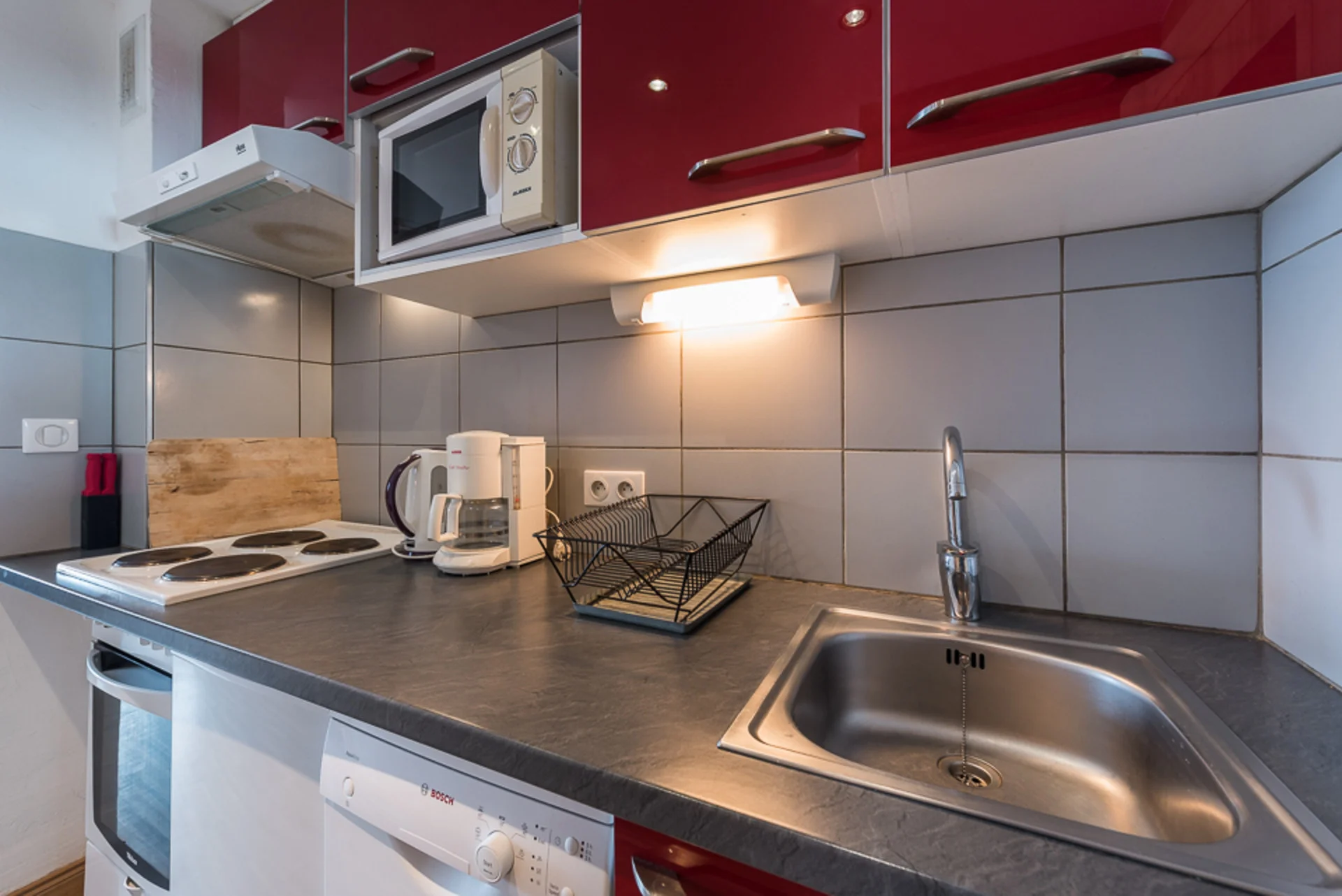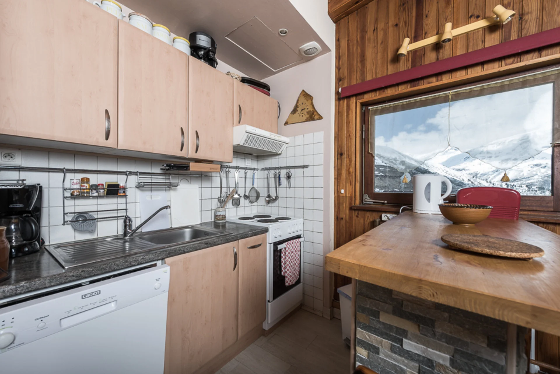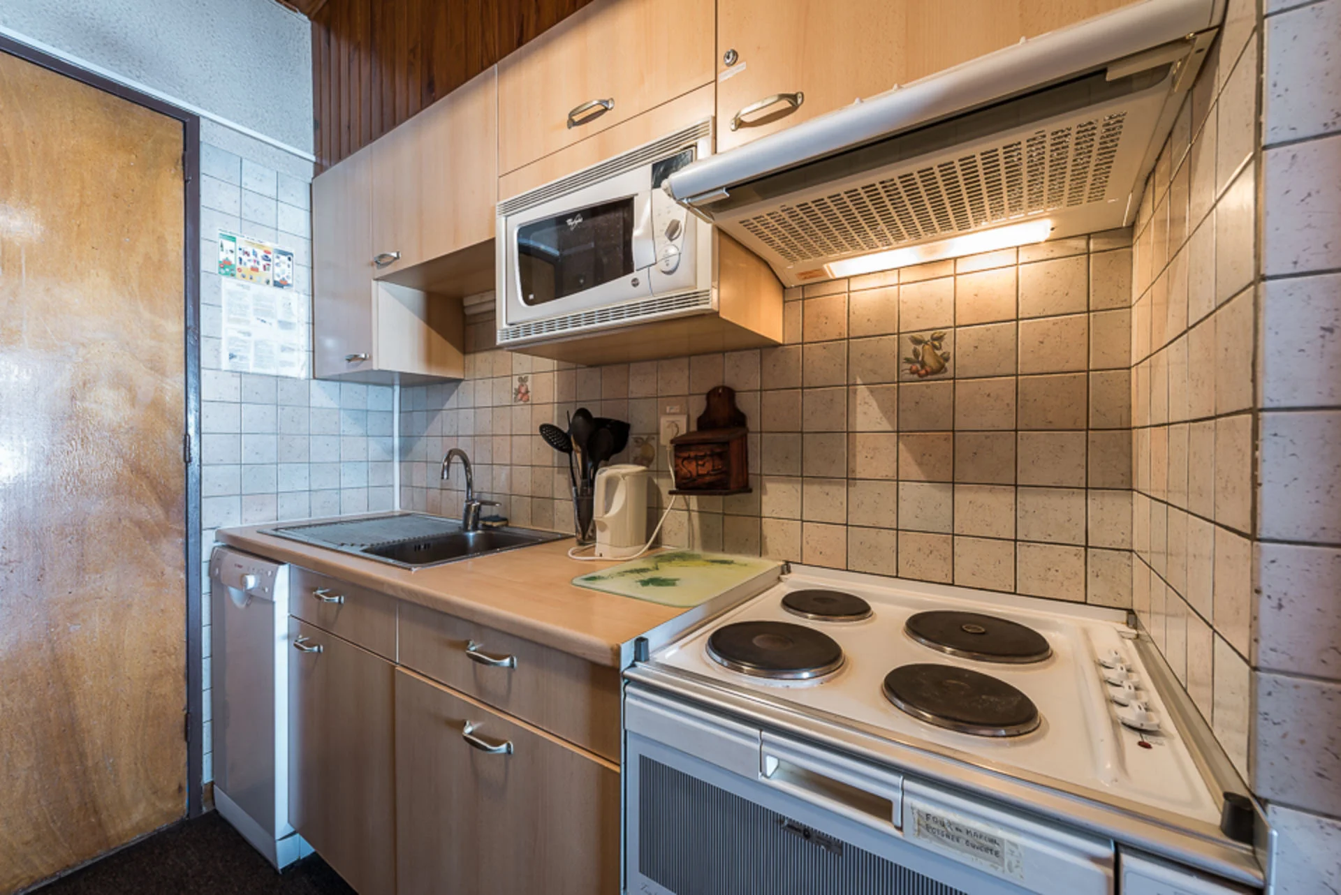 Het appartement beschikt over een volledig uitgeruste keuken met inductiekookplaat (4 pitten), oven, magnetron, koelkast, vaatwasser, koffiezetapparaat, espressomachine, broodrooster, waterkoker, sinaasappelpers, raclette-apparaat en fondue-set. Alle keukenbenodigdheden zijn aanwezig: bestek, servies, glazen, pannen, kookgerei, scharen, messen, breekijzer, flessenopener en meer.