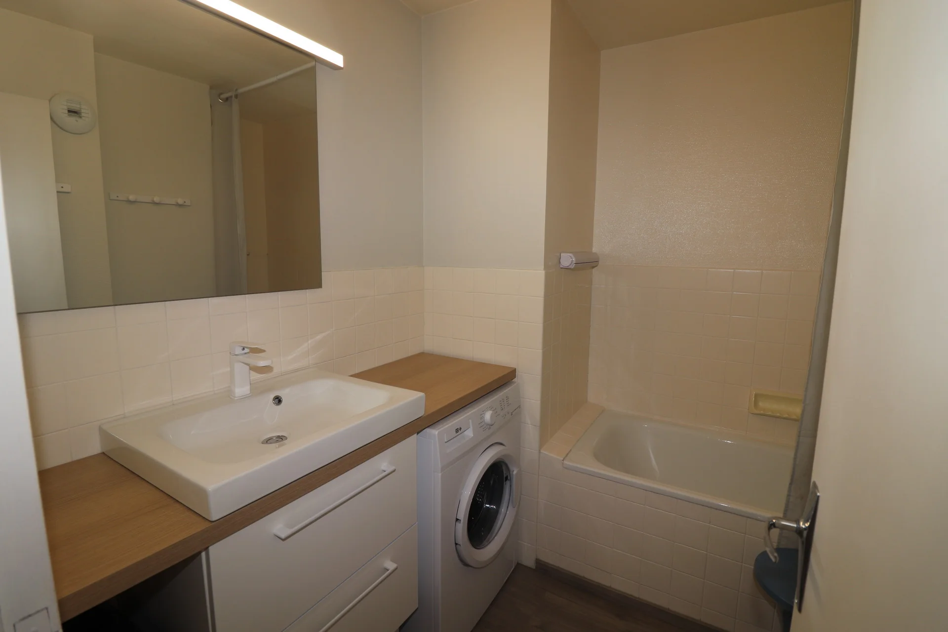 Badkamer met wastafel, spiegels, douche en toilet. Beschikbaar zijn een föhn, handdoeken en een wasmachine.