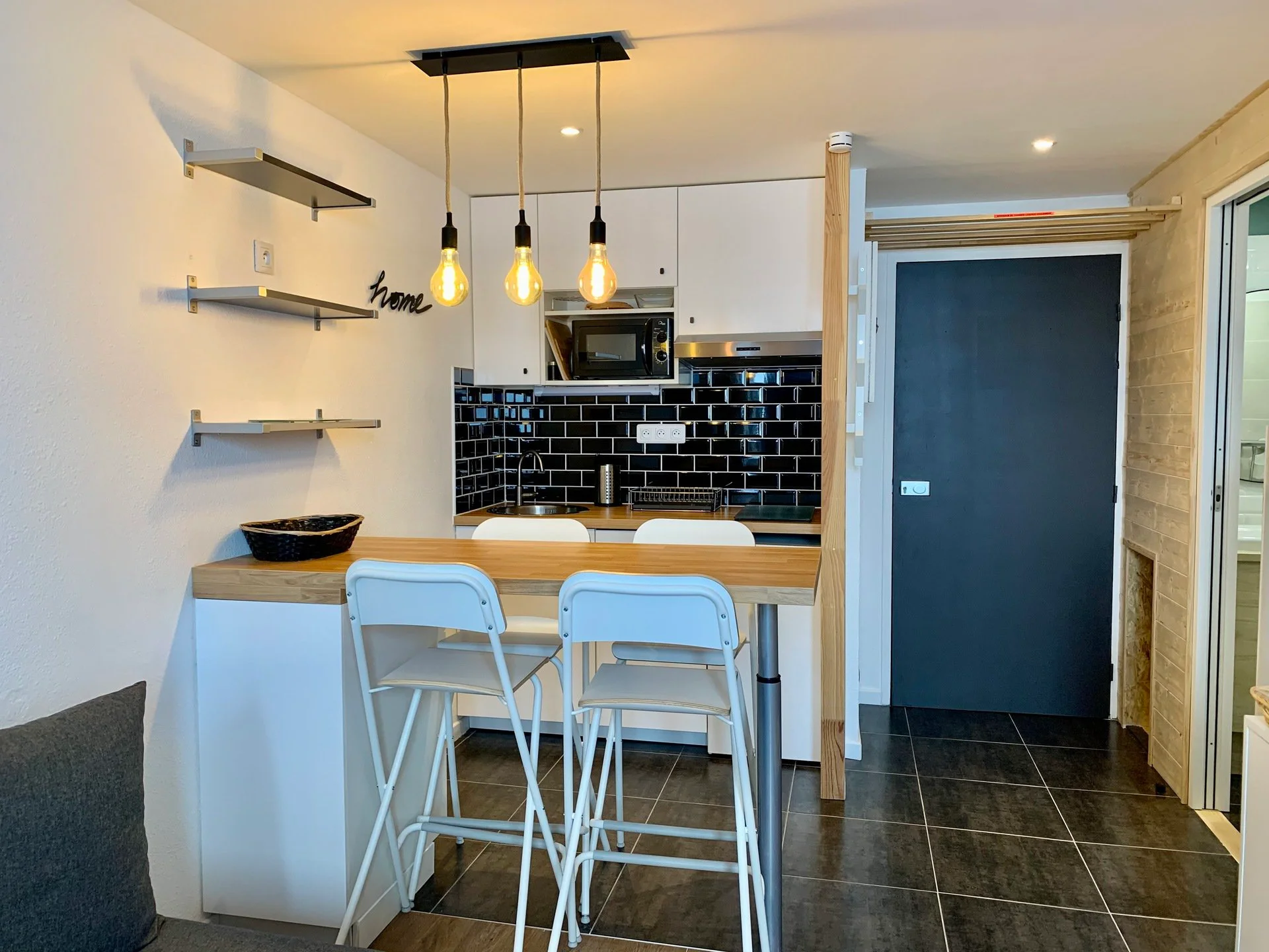Dit is een compacte studio met één hoofdruimte en een afzonderlijke slaapkabine. De woonruimte beschikt over een zithoek met canapé en eettafel met barkrukken. De slaapkabine is voorzien van een stapelbed. Het appartement heeft een badkamer met toilet.