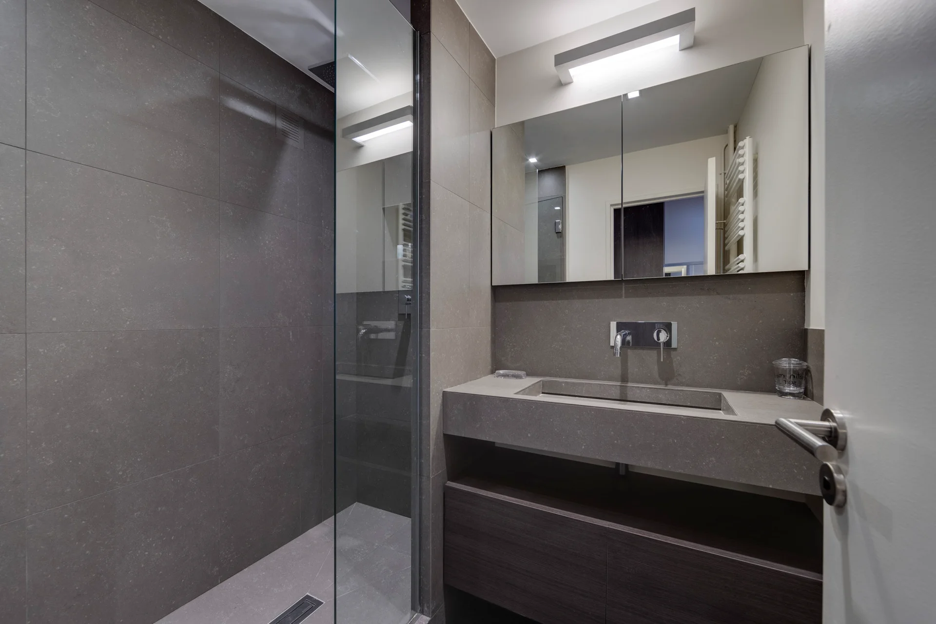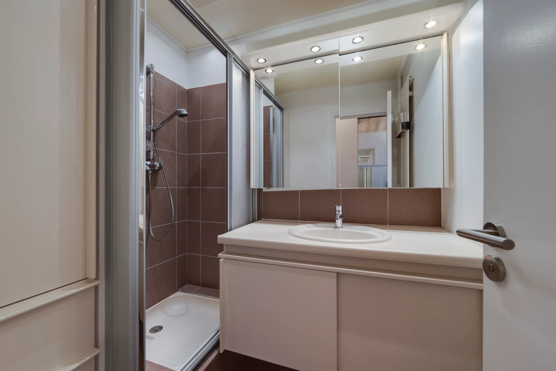 Badkamer met douche, lavabo en föhn. Apart toilet.