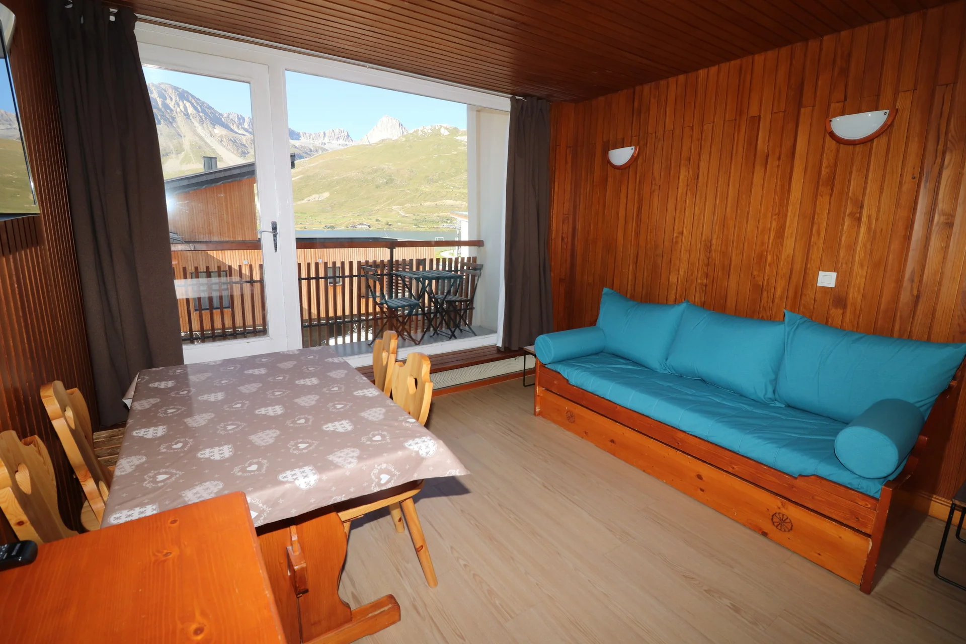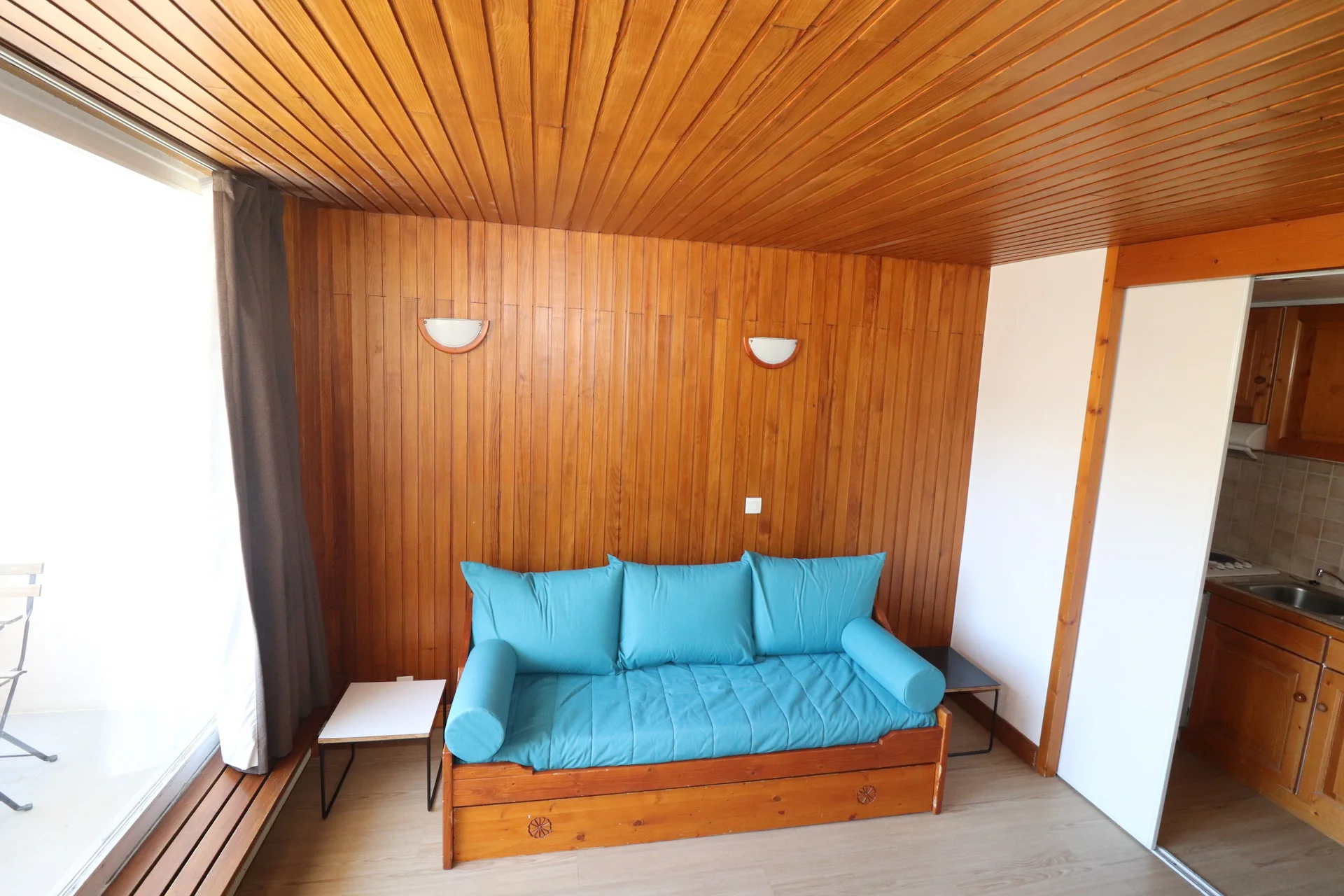 Dit studio bestaat uit een woonkamer en een slaapkabine. De woonkamer is voorzien van een canapébed en een zitbank. De slaapkabine heeft een stapelbed met twee eenpersoonsbedden.