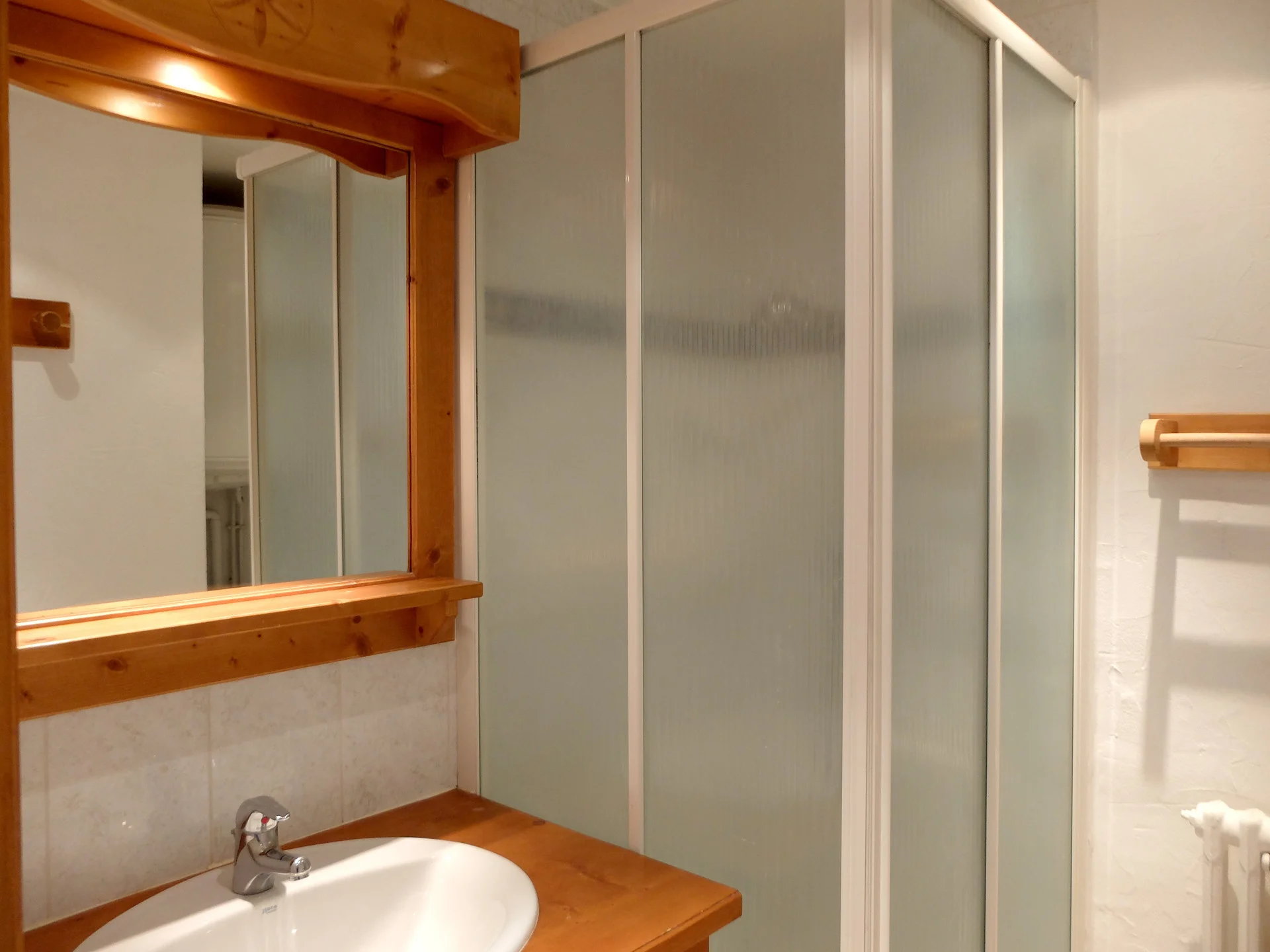Badkamer met toilet en apart toilet. In de badkamer bevinden zich een douche, handdoekdroger en föhn.