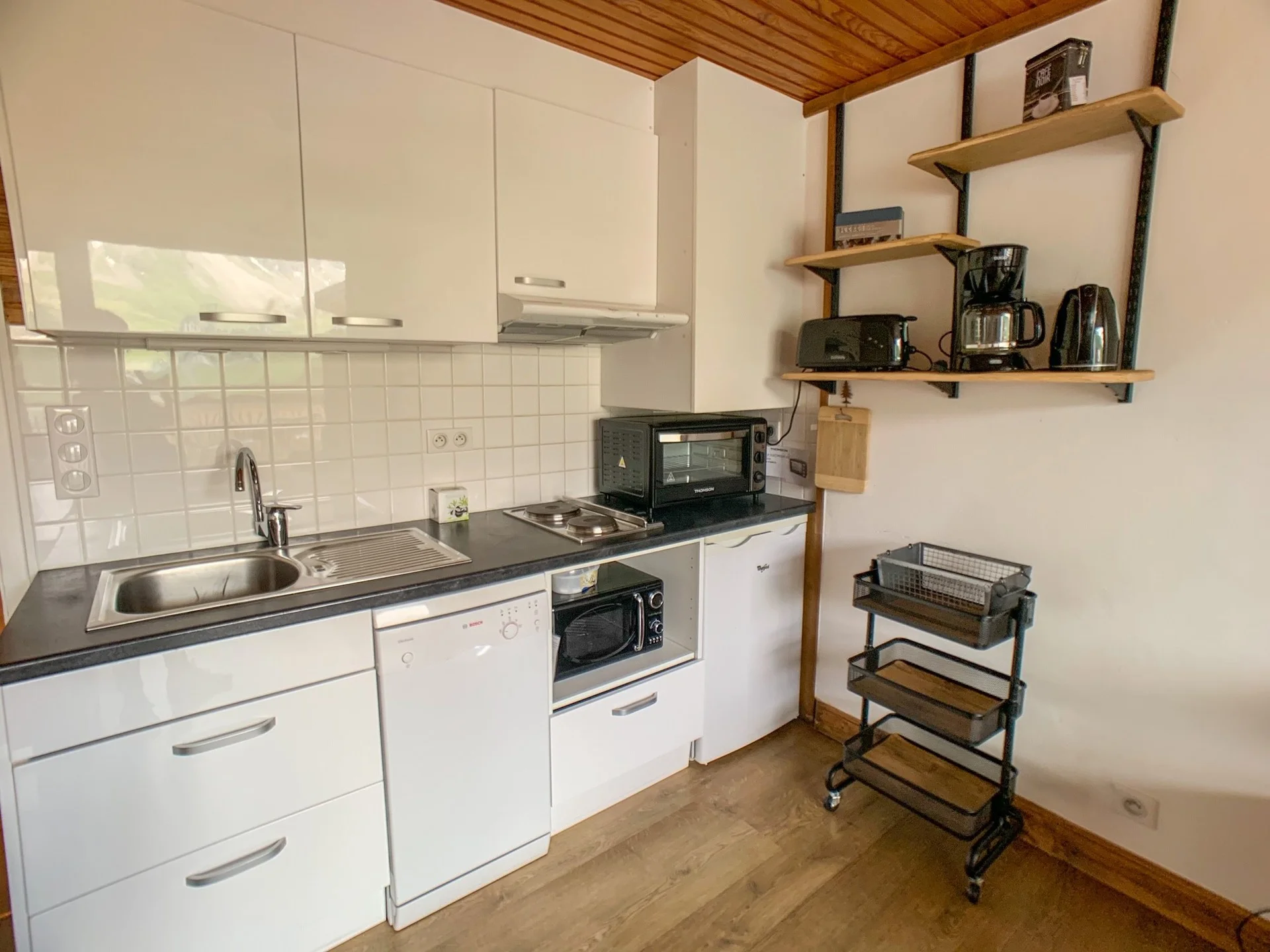 De woonkamer heeft een keukengedeelte met inductiekookplaat (2 pitten), magnetron, koelkast, vaatwasser, oven, broodrooster, waterkoker, koffiezetapparaat, sinaasappelpers, raclette-apparaat en fondue-set. Aanwezig zijn servies, bestek, glazen, pannen, kookgerei en alle benodigde keukengereedschappen.