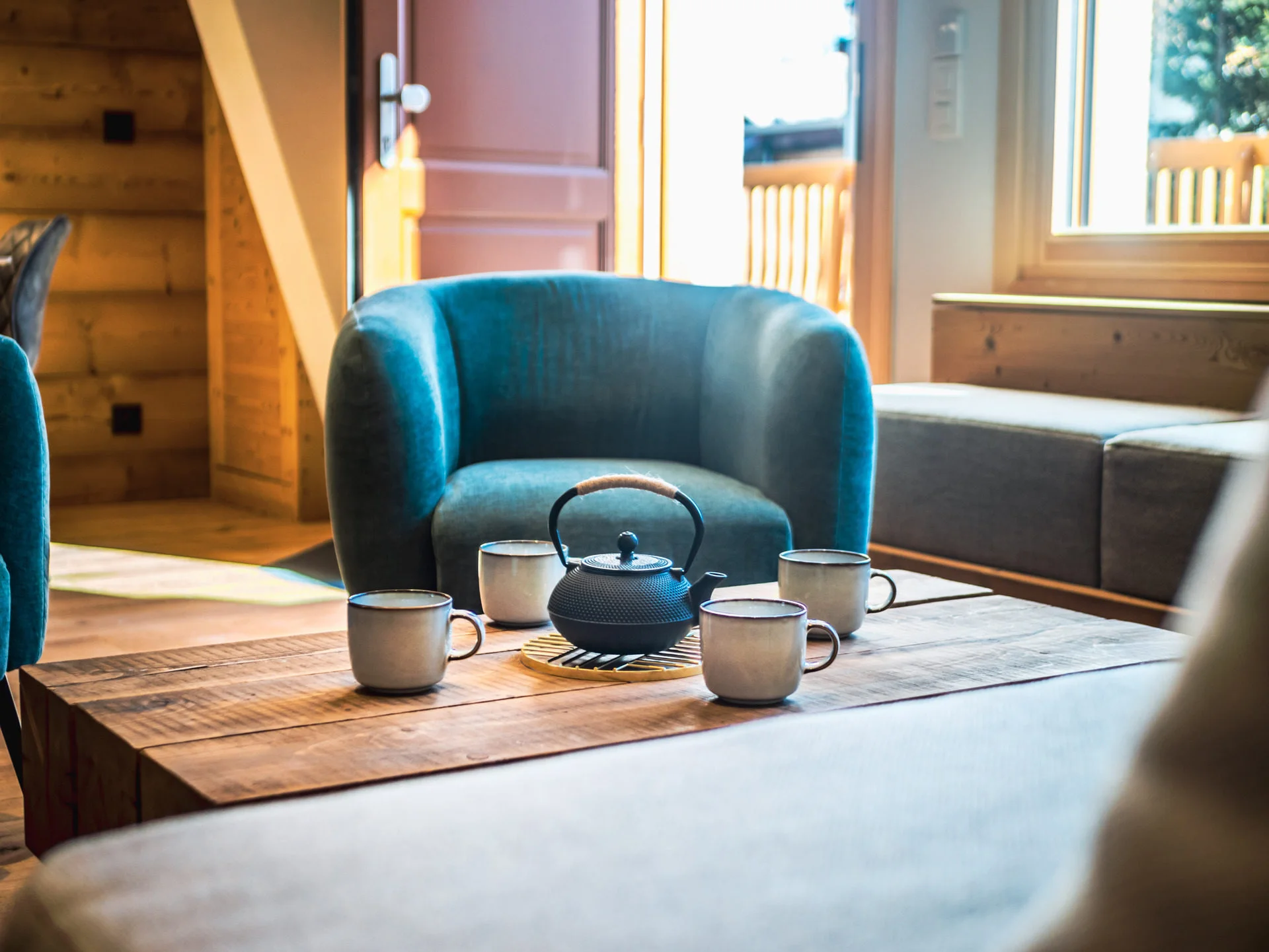 Gezellige woonkamer met TV, zithoek met fauteuils, salontafel, houten zitbank met kussens en voldoende zitruimte voor het hele gezin.