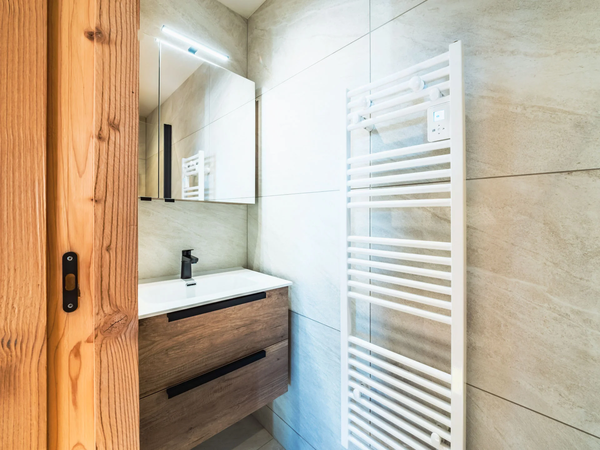 Badkamer met toilet, föhn, handdoekverwarmer en doucheruimte.