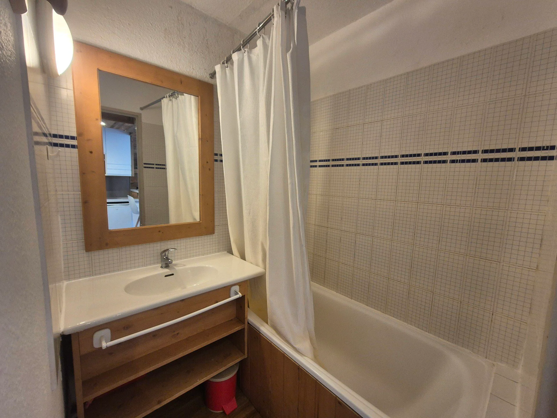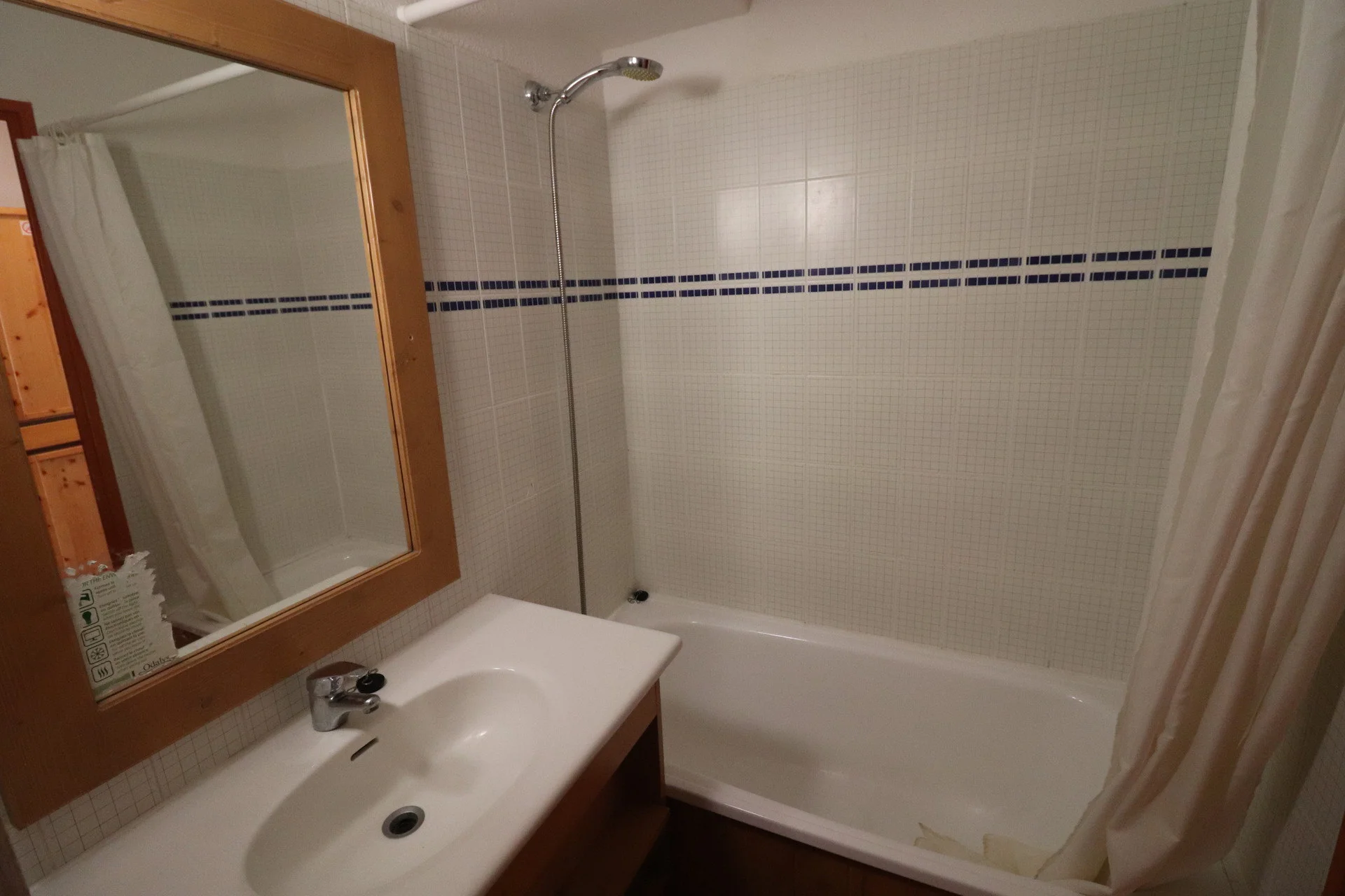 Badkamer met douchegordijn. Aparte wc.