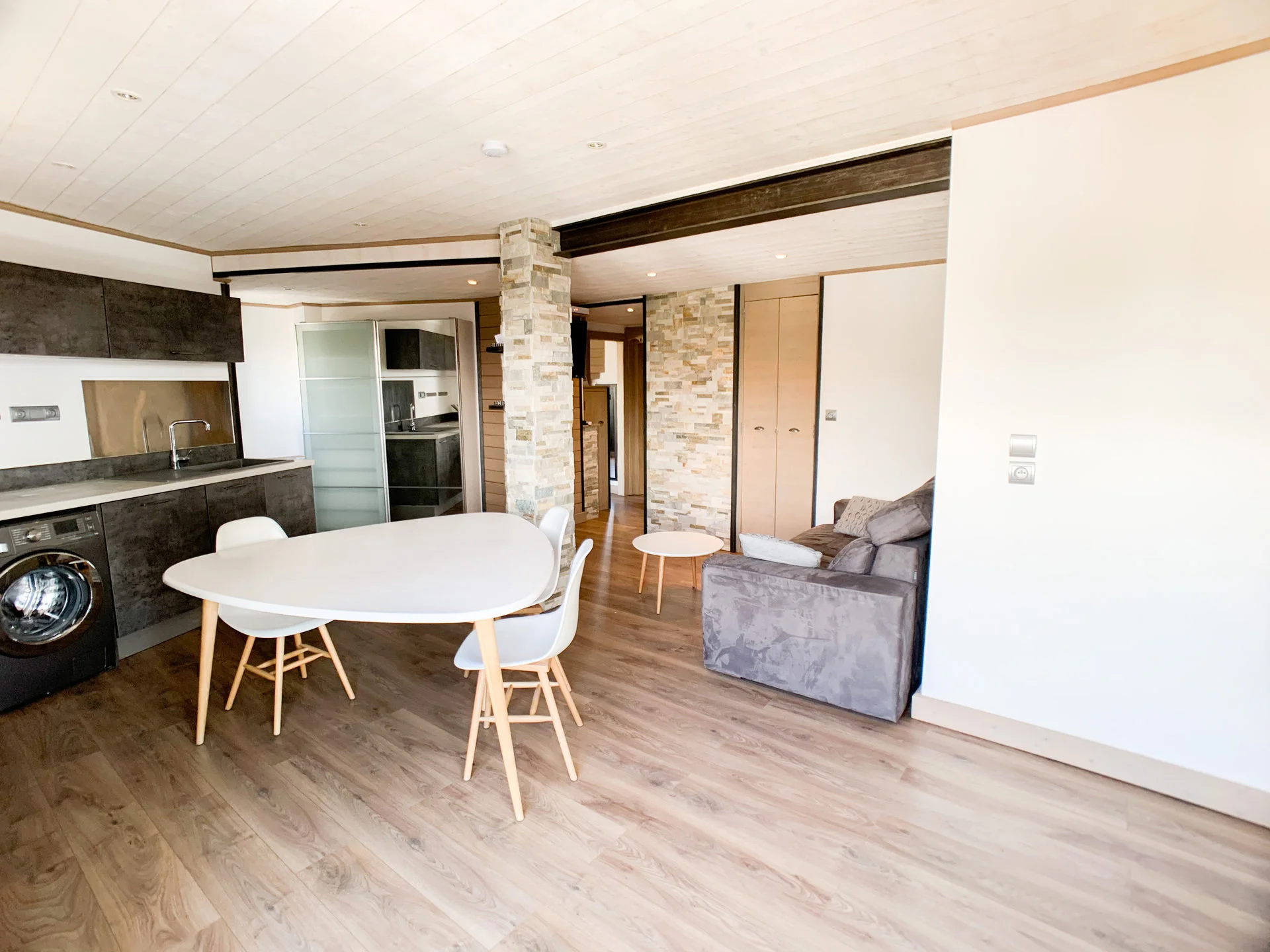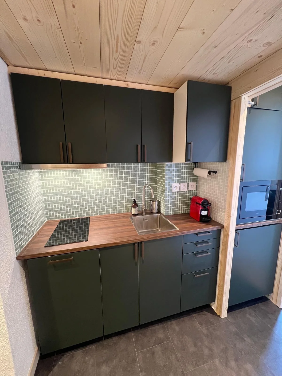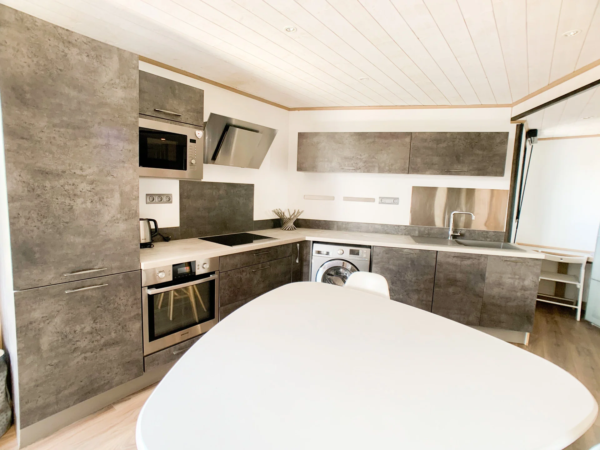 Volledig uitgeruste keukenhoek met inductiekookplaat (2 pitten), oven met grill, magnetron, koelkast, vaatwasser, koffiezetapparaat, Nespresso-apparaat, waterkoker, broodrooster, fondue-set, crêpepan, wafelijzer, blender, mixeer, sinaasappelpers, en alle benodigde keukengereedschappen zoals pannen, kookgerei, bestek, servies, glazen, schaal en slacentrifuge.