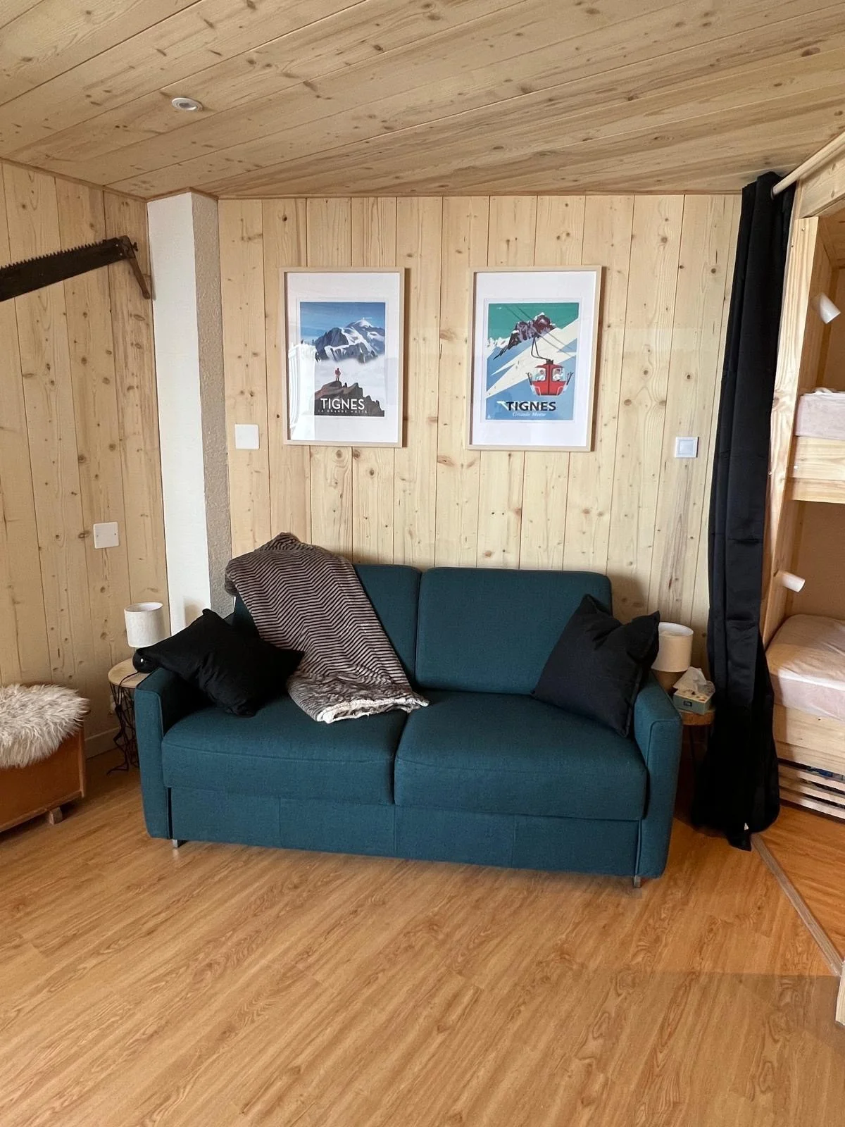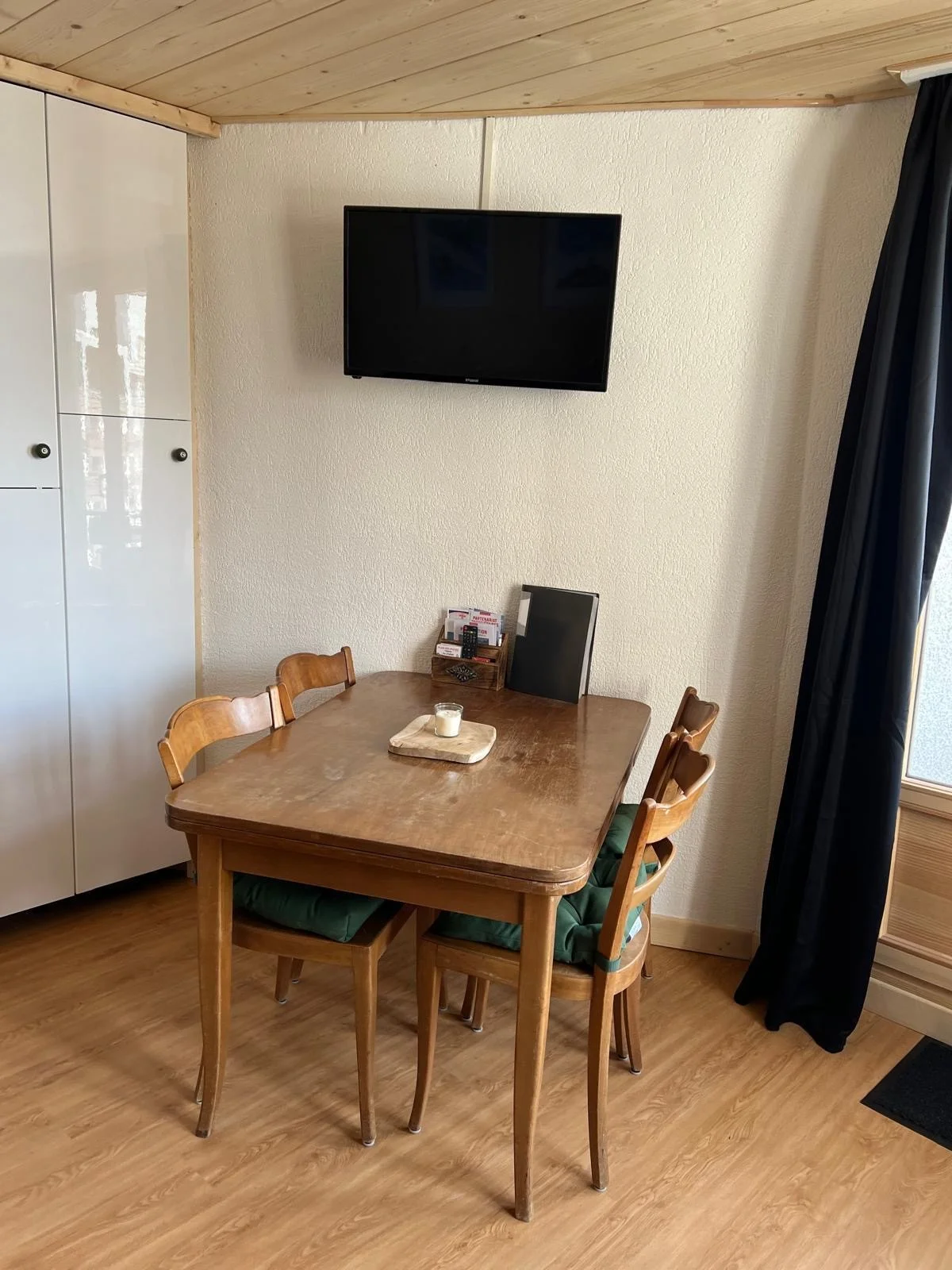 Gezellige zithoek met slaapbank, tafel, stoelen en TV met afstandsbediening.