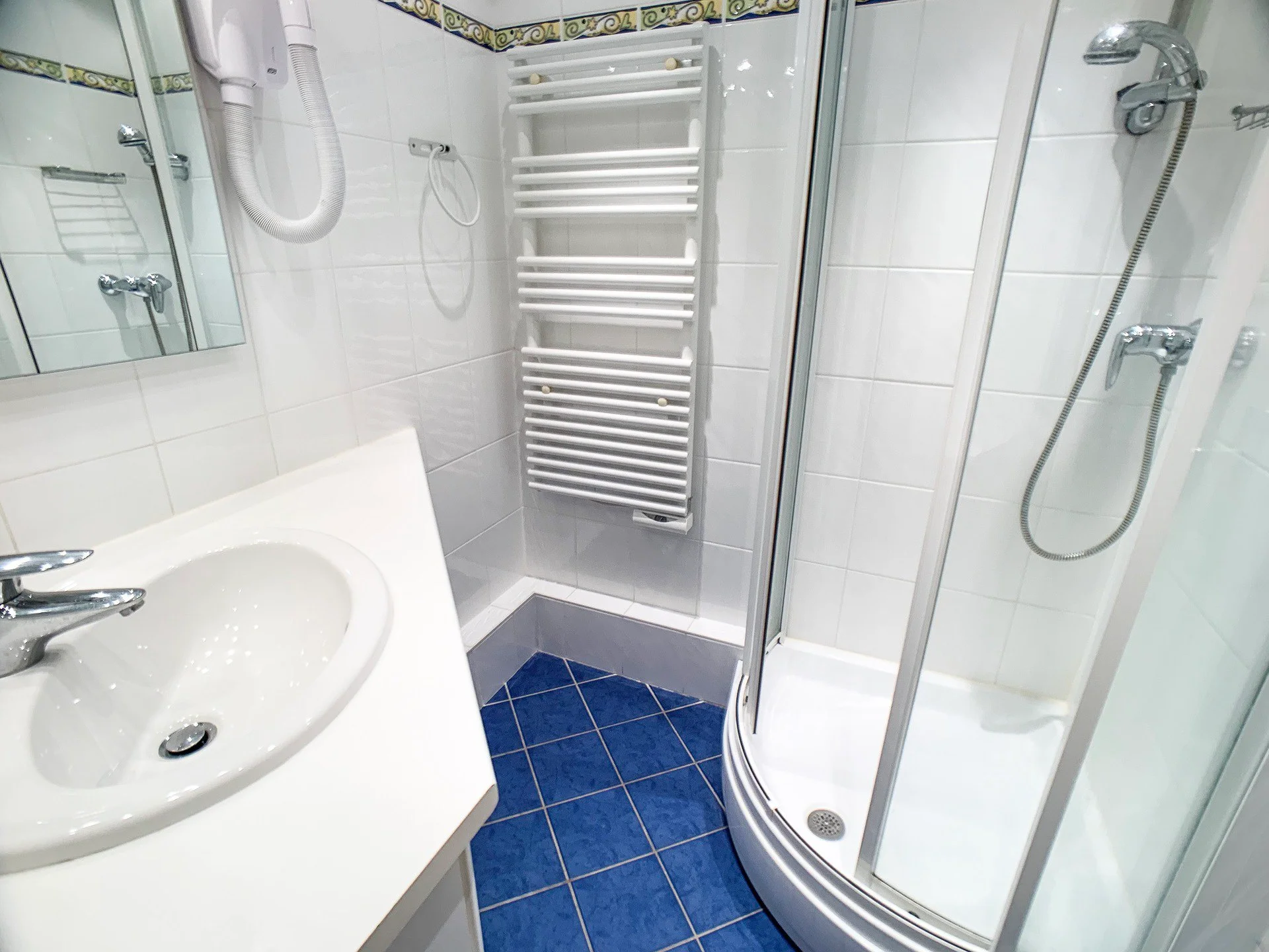Badkamer met volledige badinrichting, föhn, handdoekenwarmers en douchewand. Apart toilet.